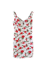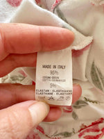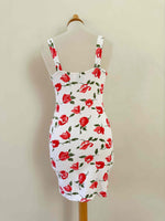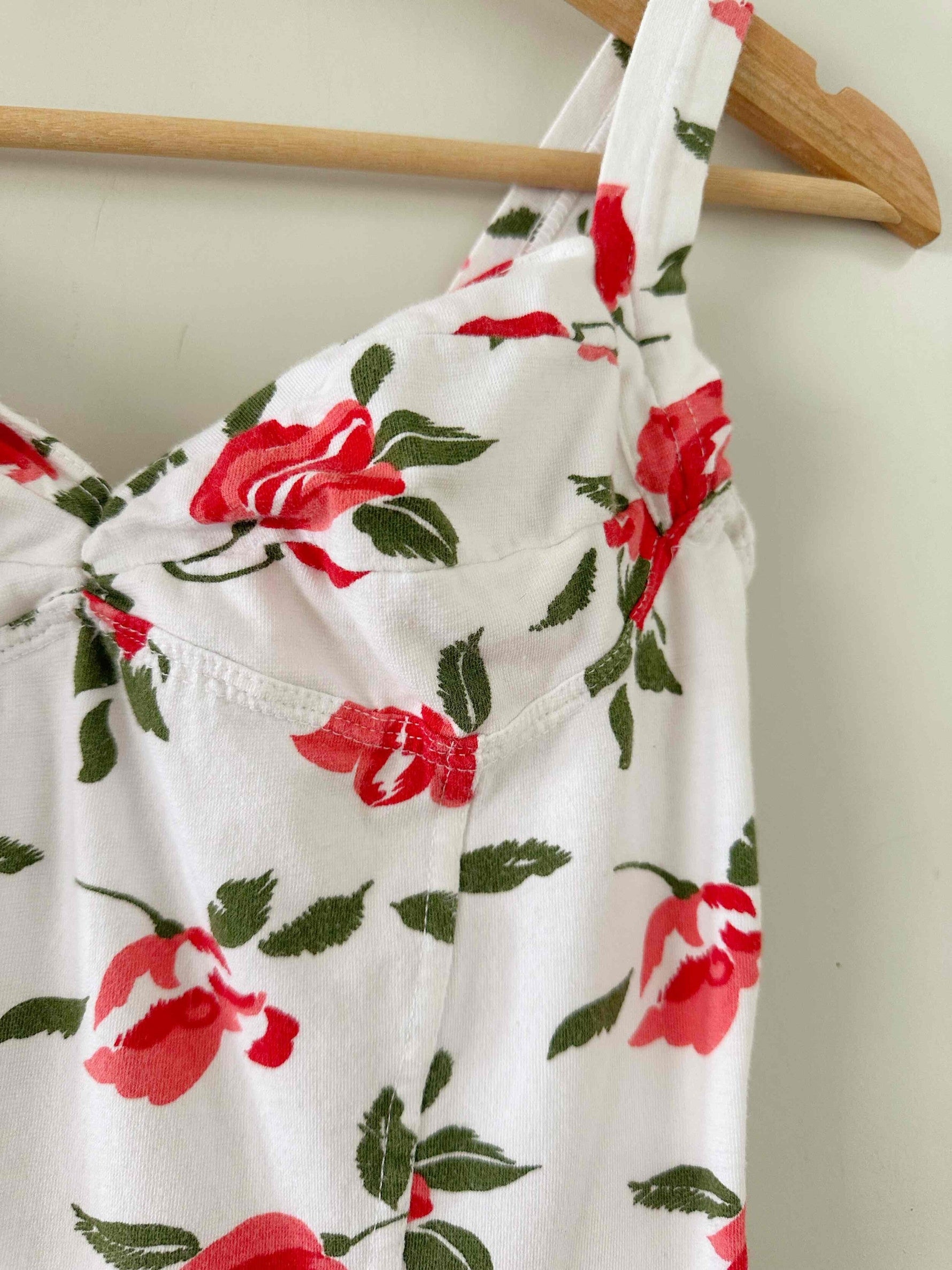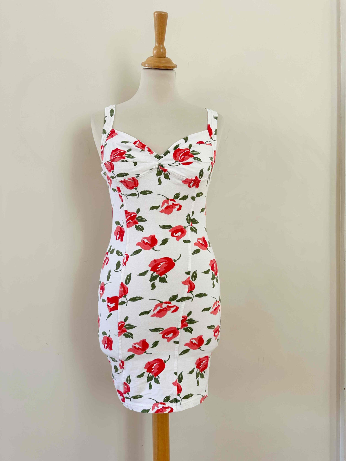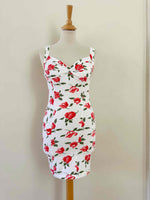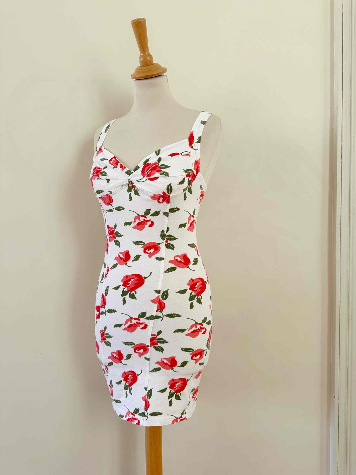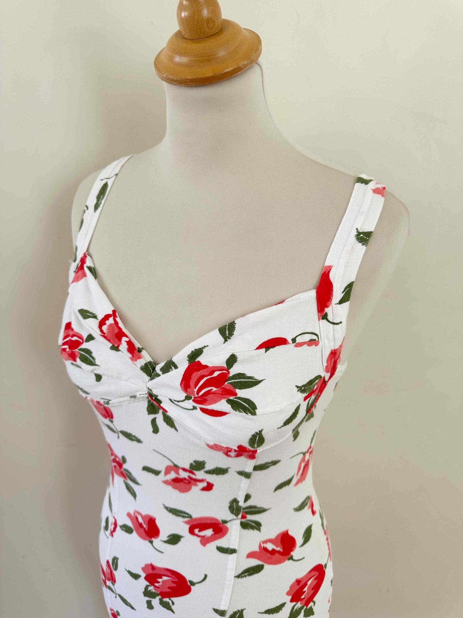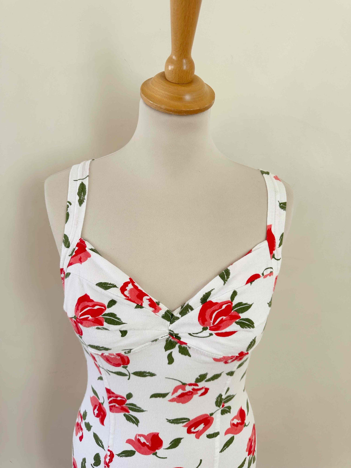 Prix unitaire parRobe à fleurs, en jersey de coton élasthanne blanc, imprimé fleurs rouges et vertes, découpes poitrine froncées balconnet à bretelles, fabriquée en Italie, convient aux tailles 34 et 36 portée ici sur un mannequin T36.