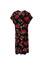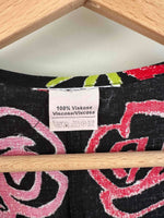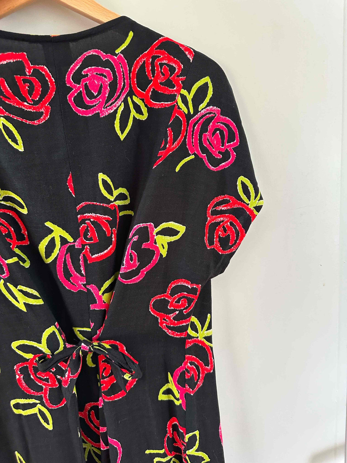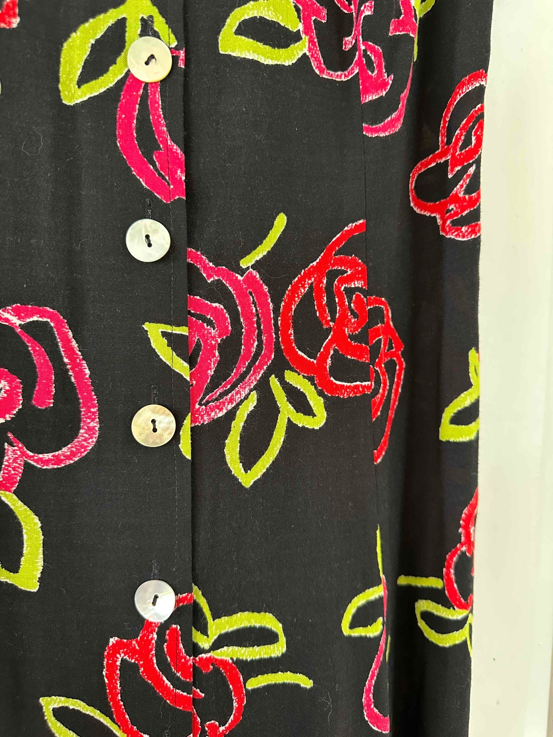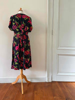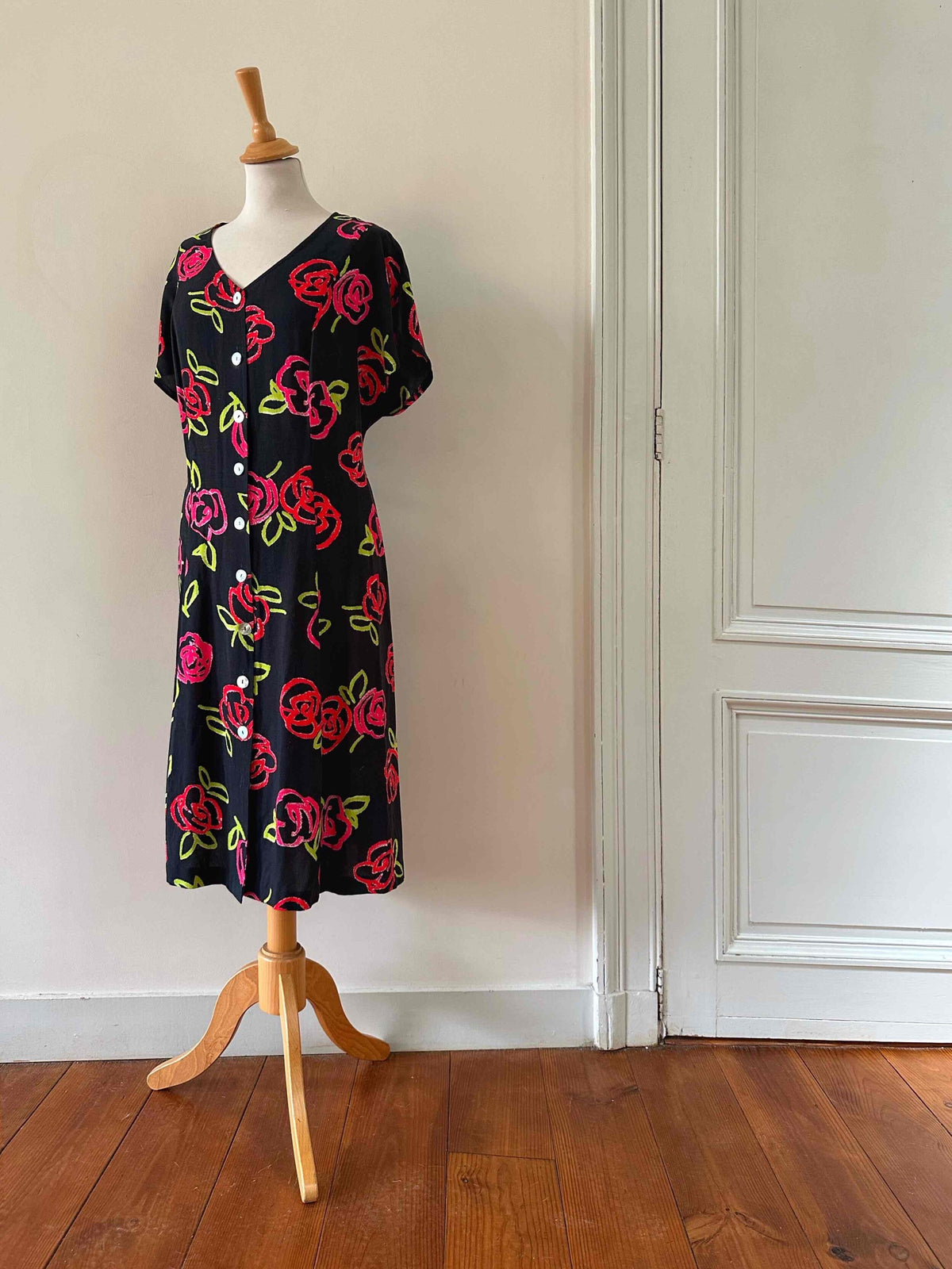 Prix unitaire parRobe boutonnée à fleurs, en viscose noire imprimée fleurs arty roses fuschia, rouges et vert pistache, boutons en nacre, taille dos à nouer, convient aux taille 36 et 38 portée ici sur un mannequin T36, aisselles 47cm.