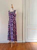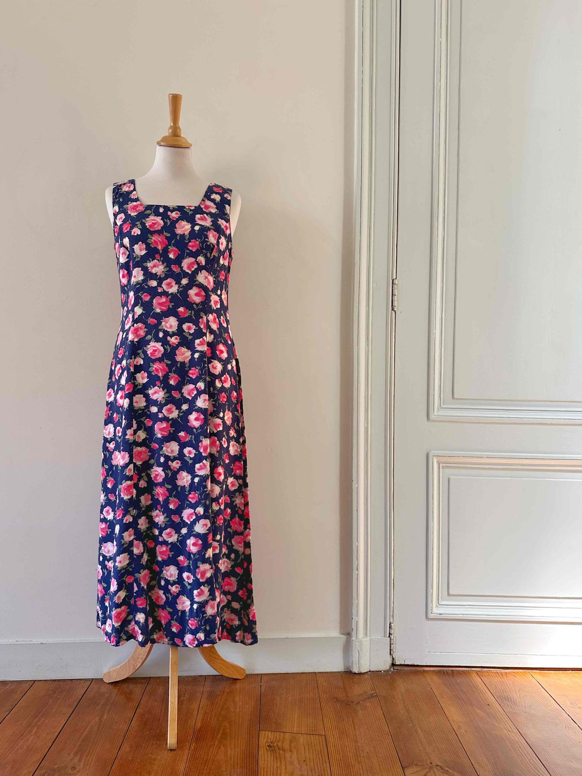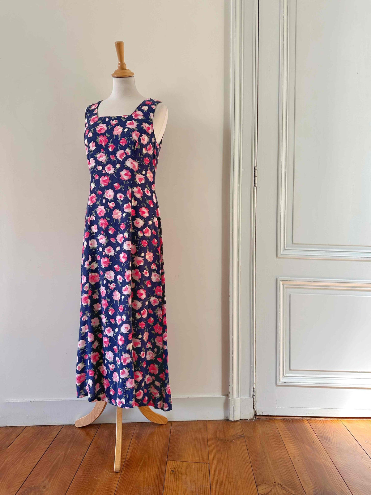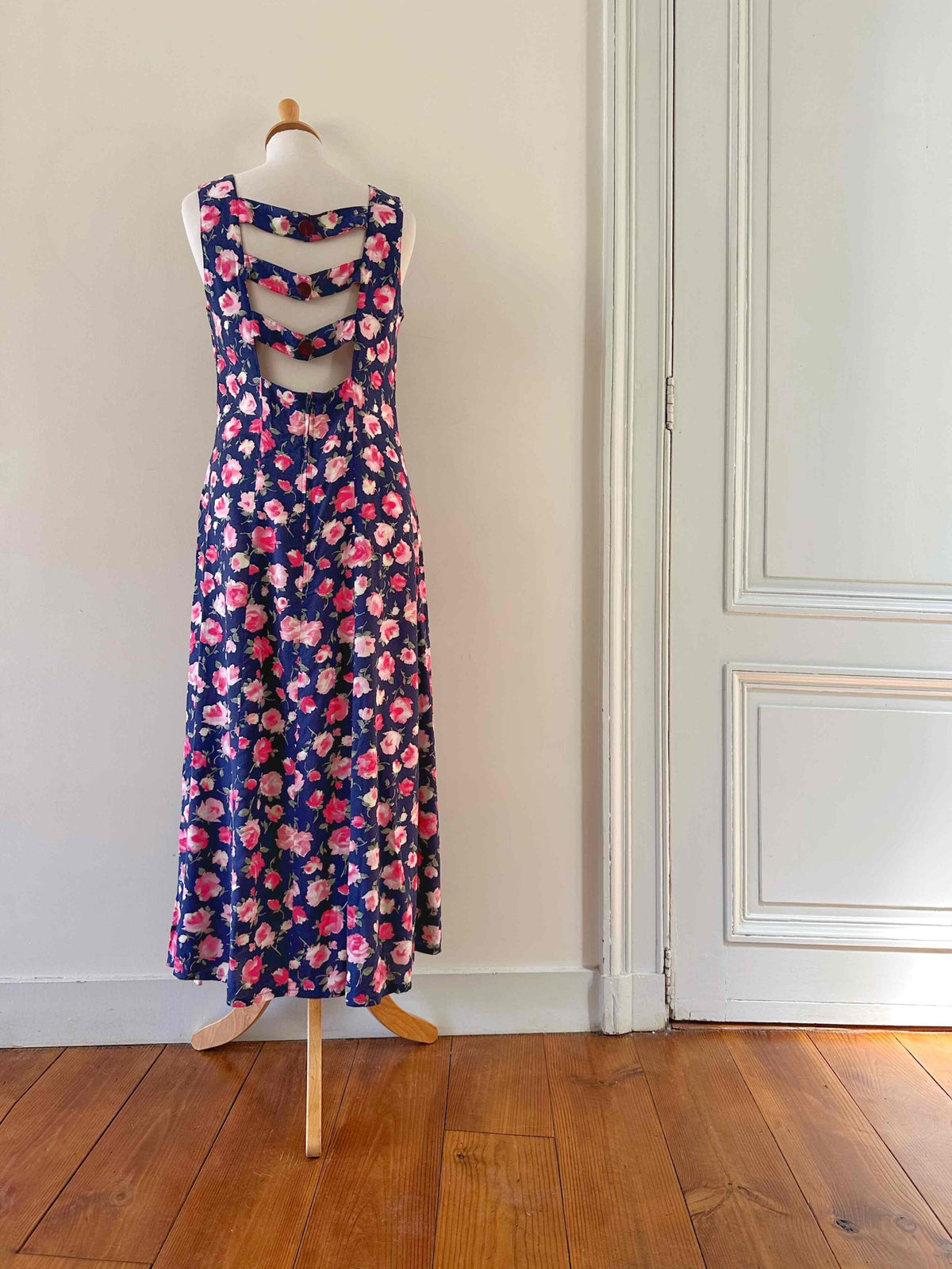 Prix unitaire parRobe dos nu à fleurs, en viscose bleu foncé imprimé fleurs roses fuschias, dos nu ajouré de bandes à boutonner, fermeture éclair à la taille, fabriquée en France, taille 38 portée ici sur un mannequin T36, aisselles 45cm.
