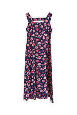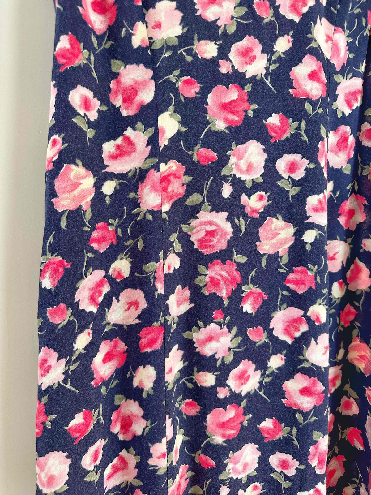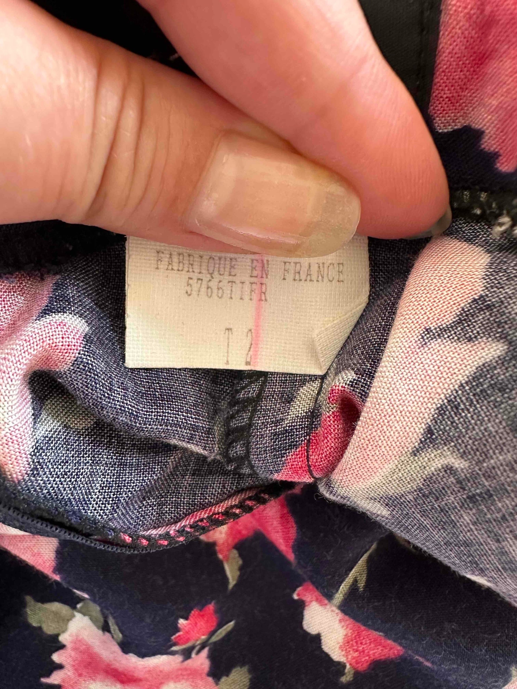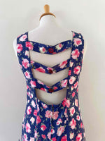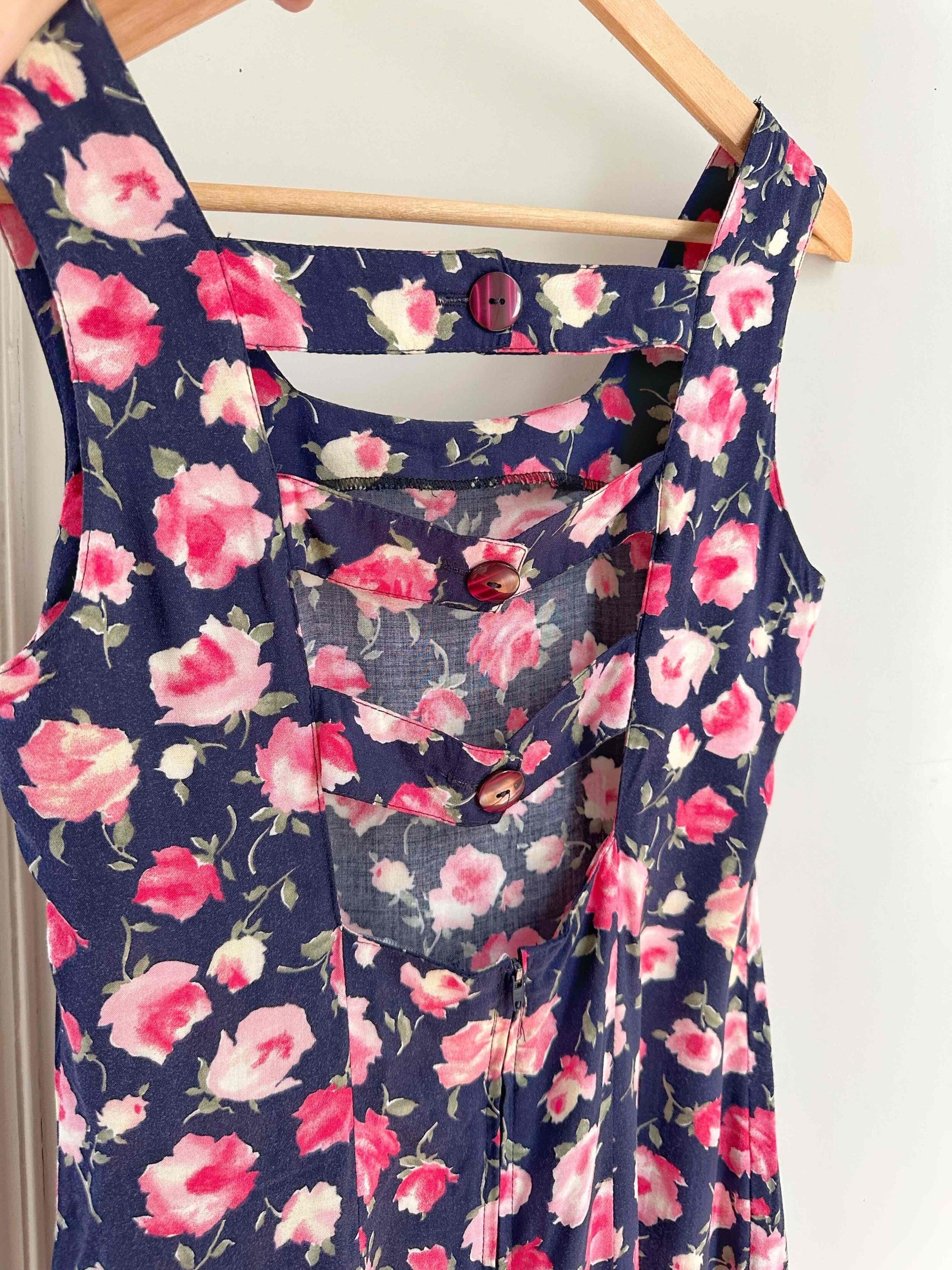 Prix unitaire parRobe dos nu à fleurs, en viscose bleu foncé imprimé fleurs roses fuschias, dos nu ajouré de bandes à boutonner, fermeture éclair à la taille, fabriquée en France, taille 38 portée ici sur un mannequin T36, aisselles 45cm.