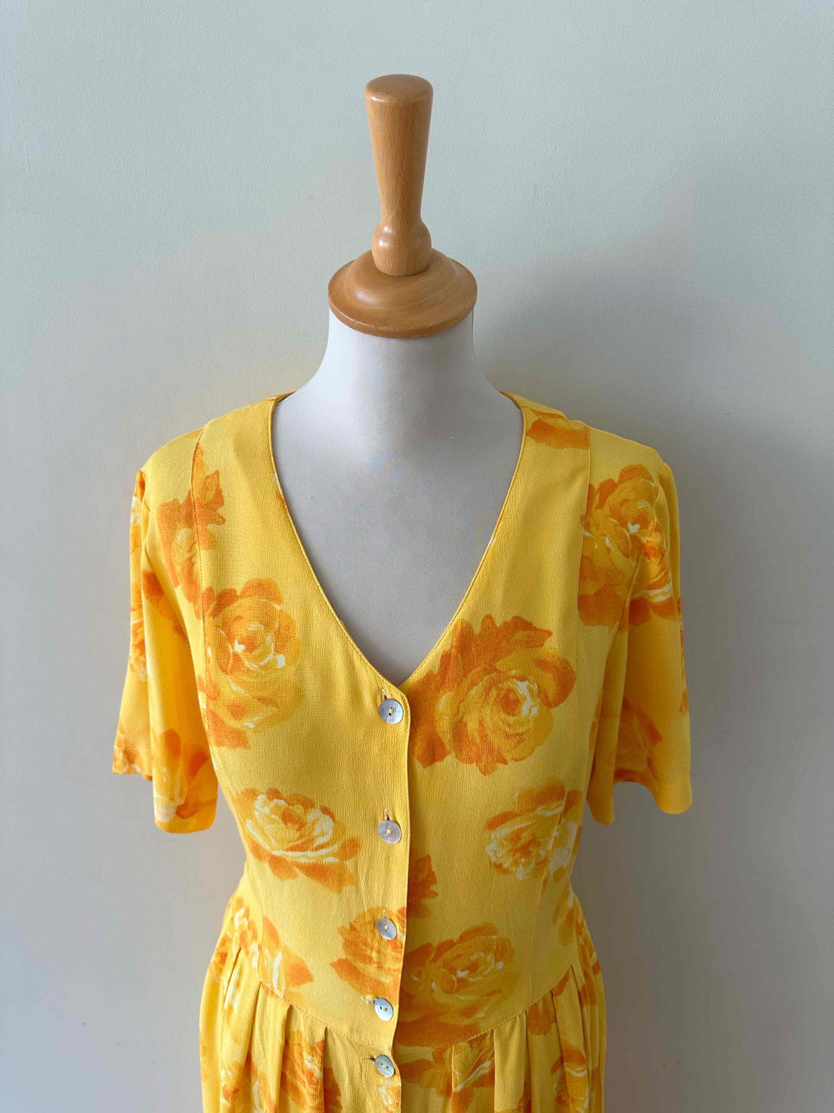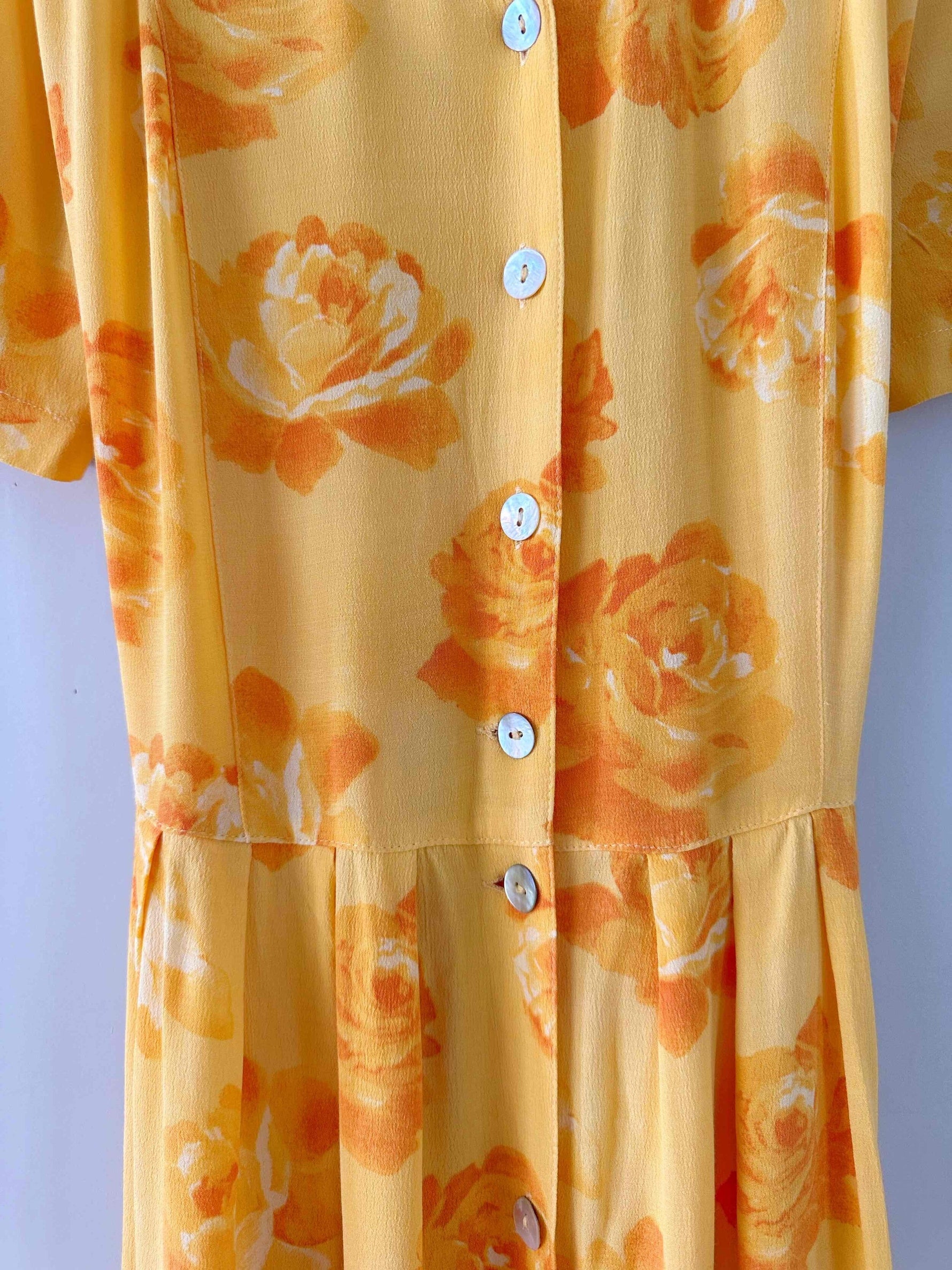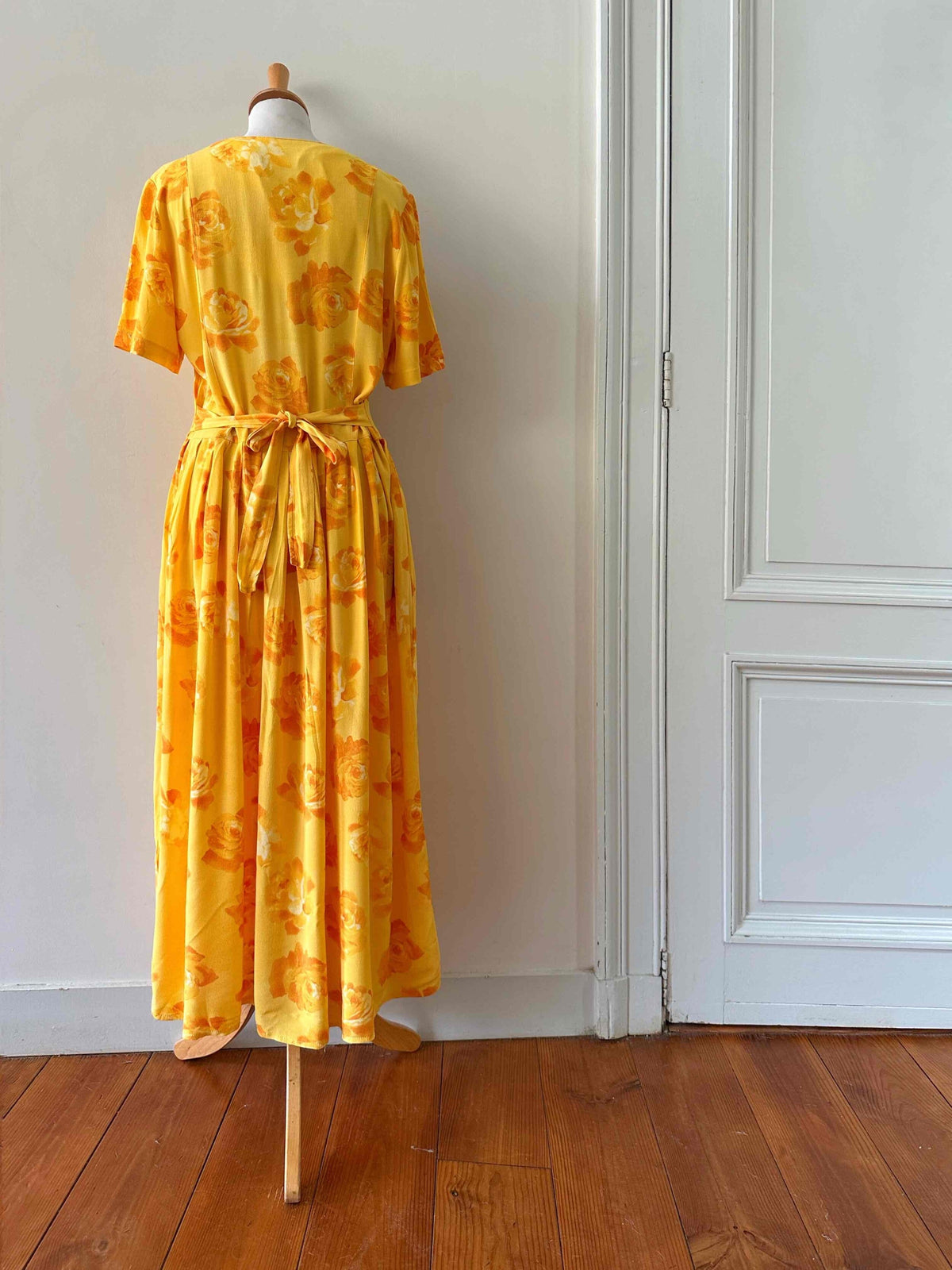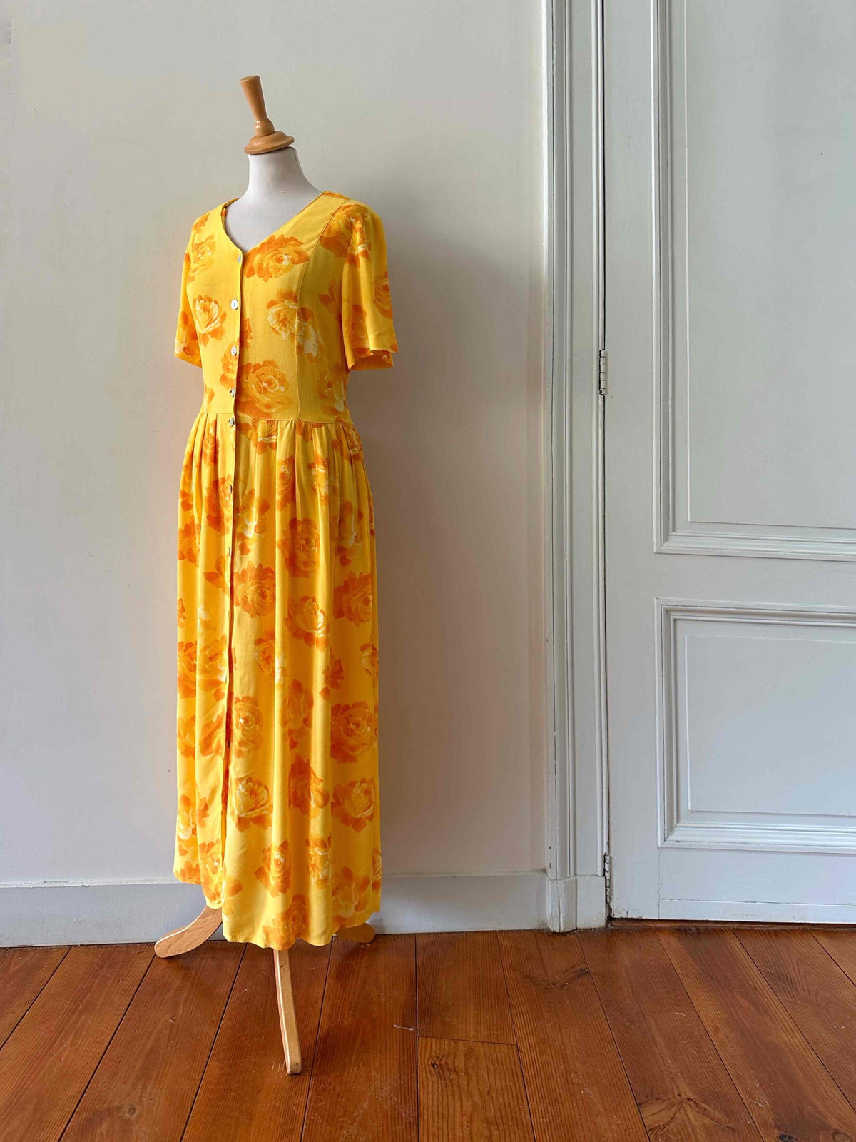 Prix unitaire parRobe longue à fleurs, en viscose jaune soleil motifs roses oranges, boutons en nacre, ceinture taille à nouer devant ou dos, années 90s, convient aux tailles 36 et 38 porté ici sur in mannequin T36, aisselles 47cm.
