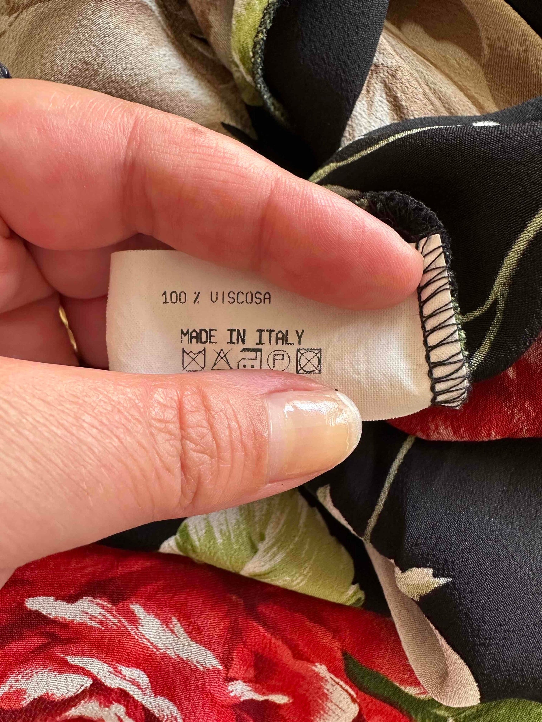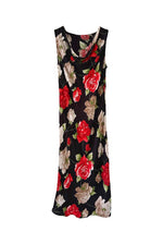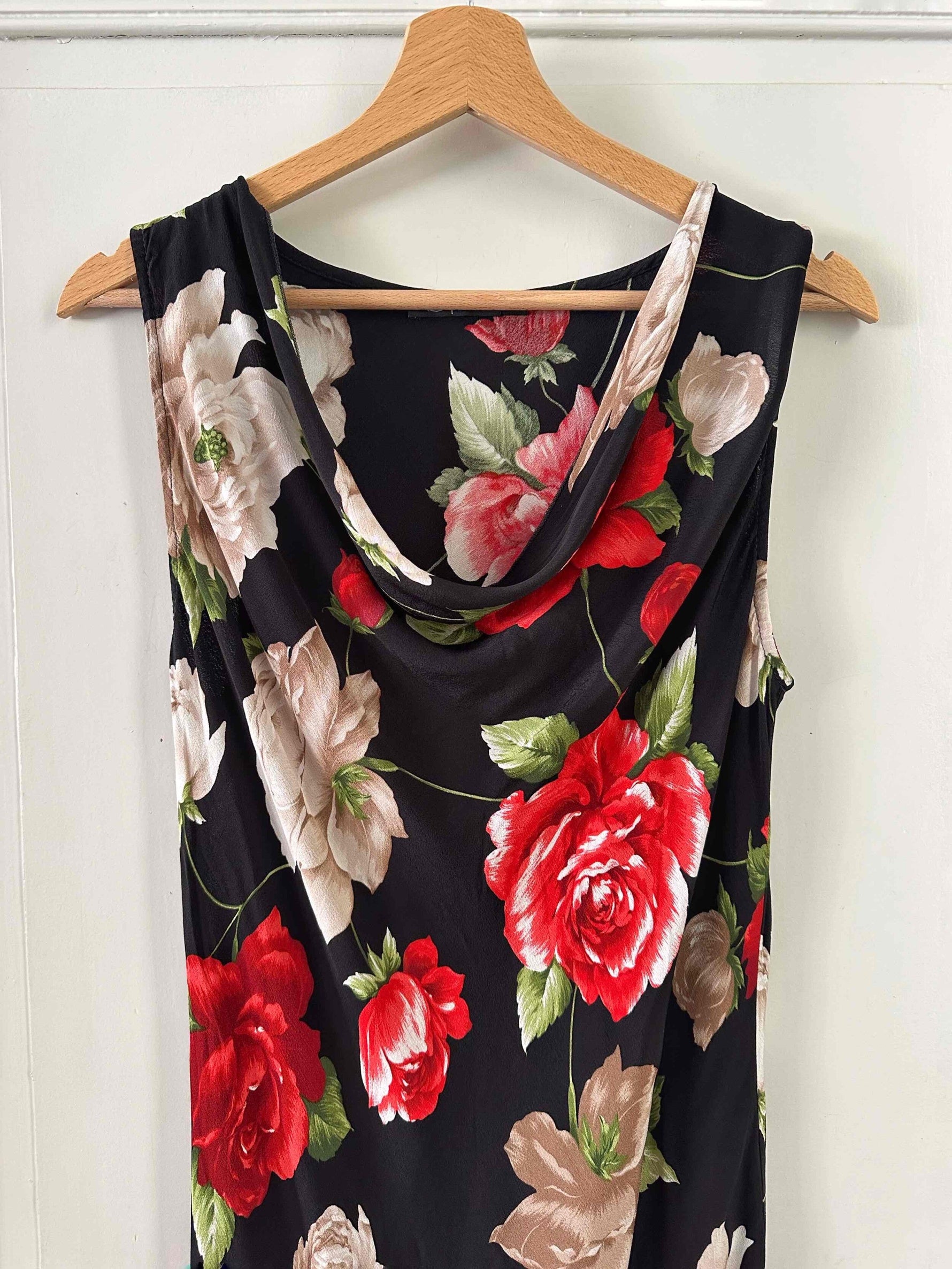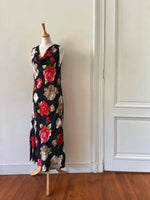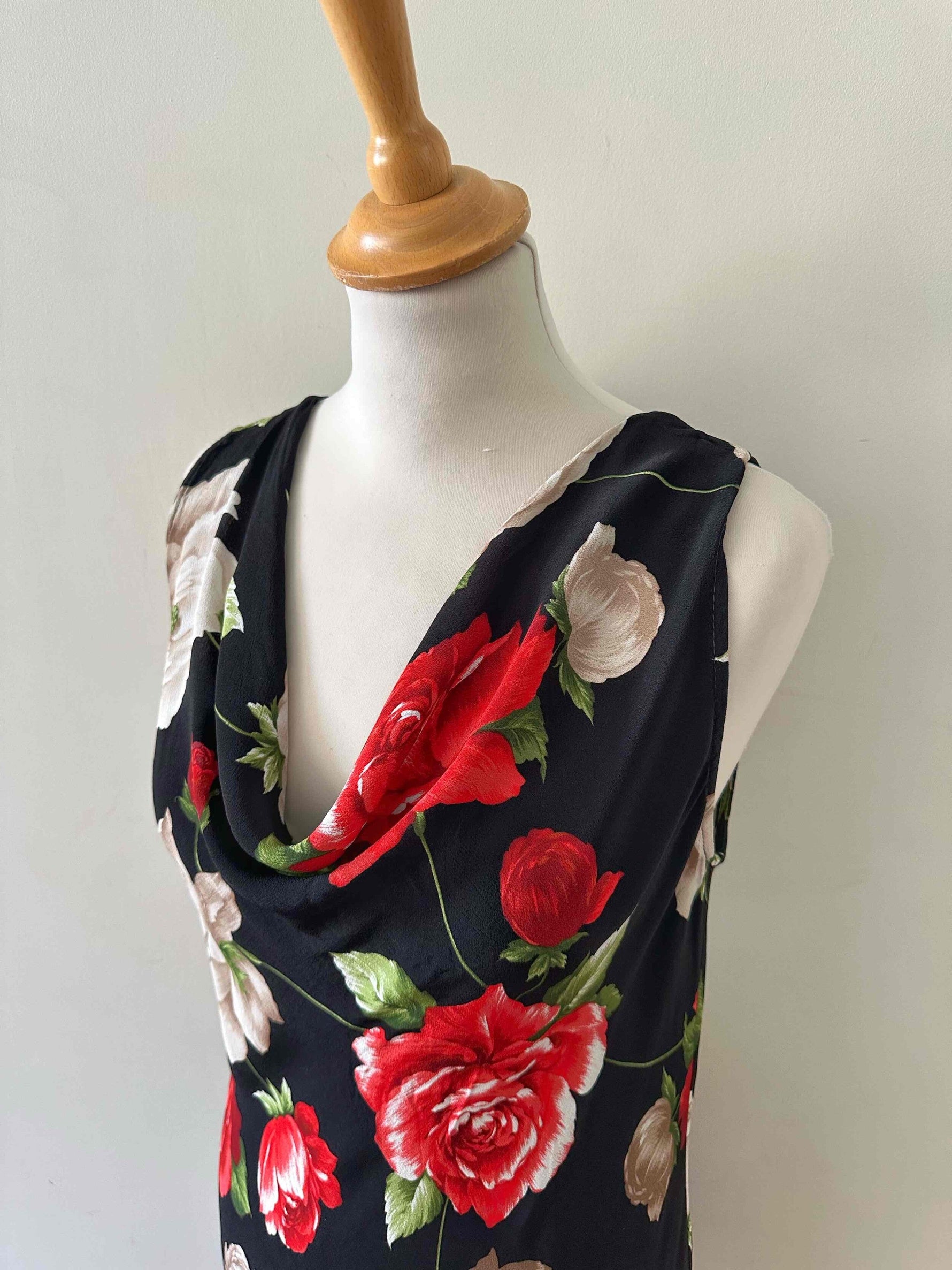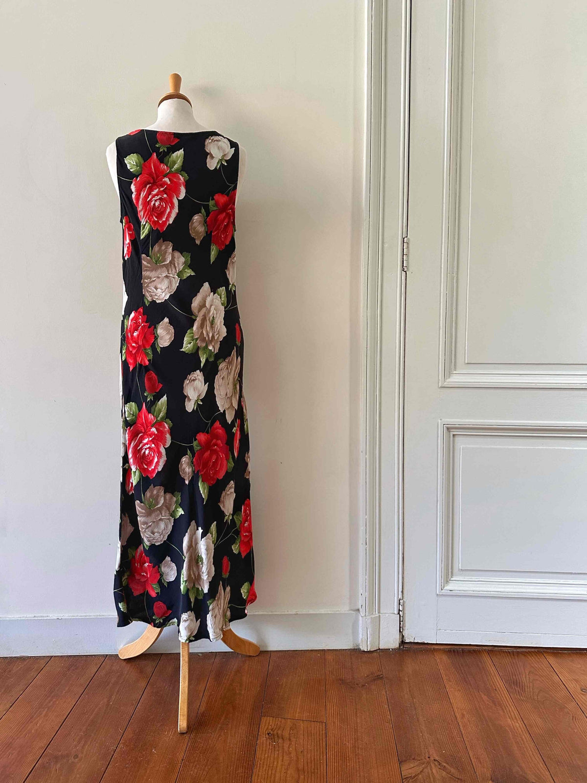 Prix unitaire parRobe nuisette à fleurs, en viscose noire imprimé roses rouges, beiges, blanches et vertes. Encolure drapée bénitier, taillée en biais, fabriquée en Italie, convient aux tailles 36 et 38 portée ici sur un mannequin T36, aisselles 44cm.
