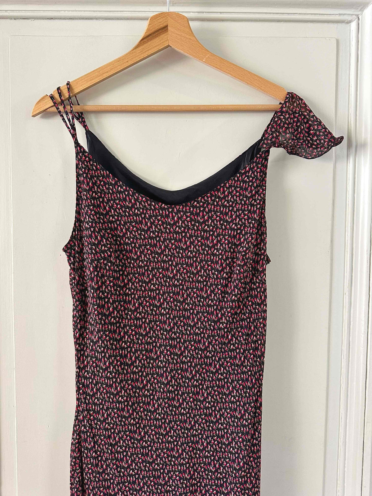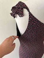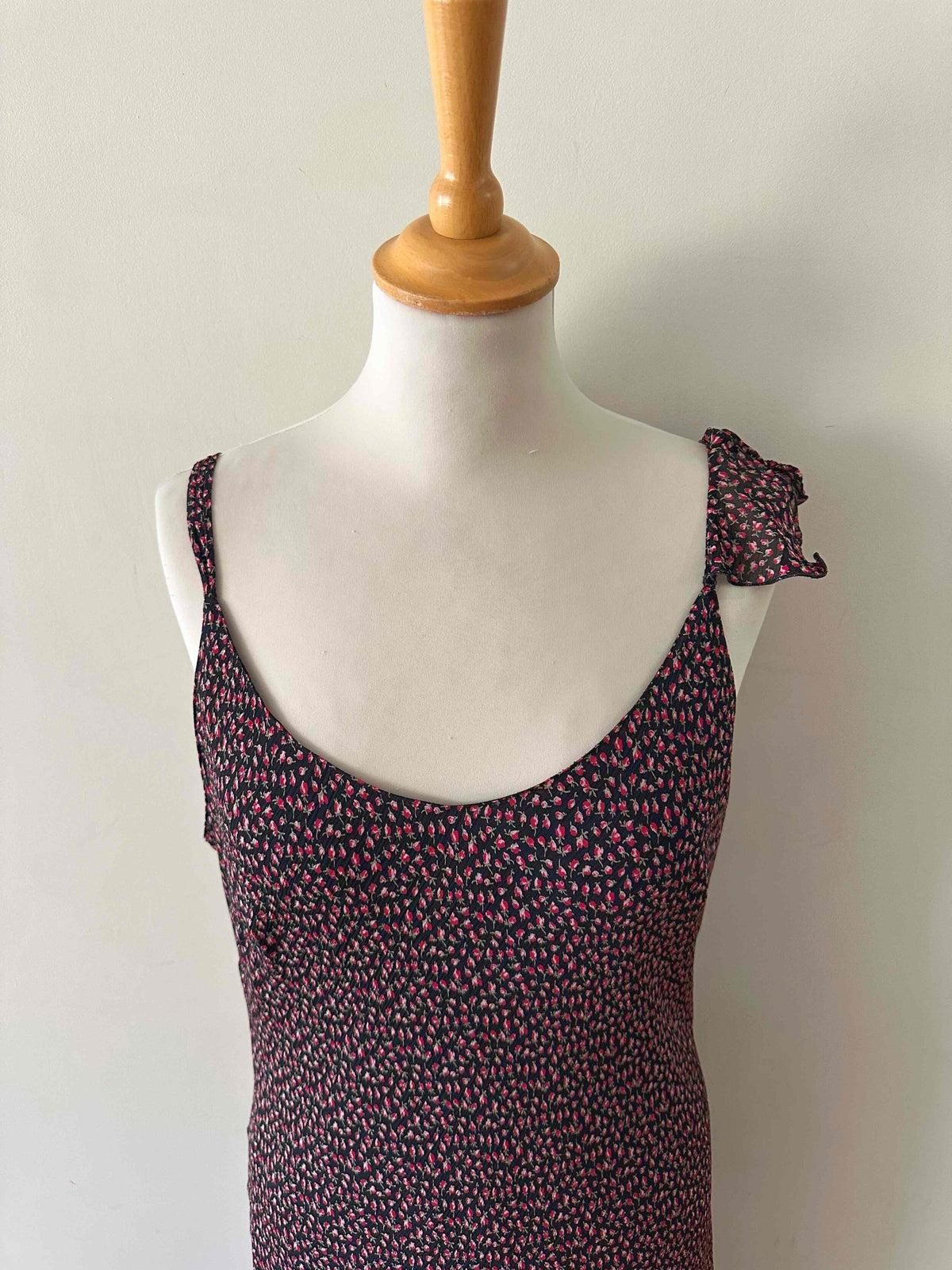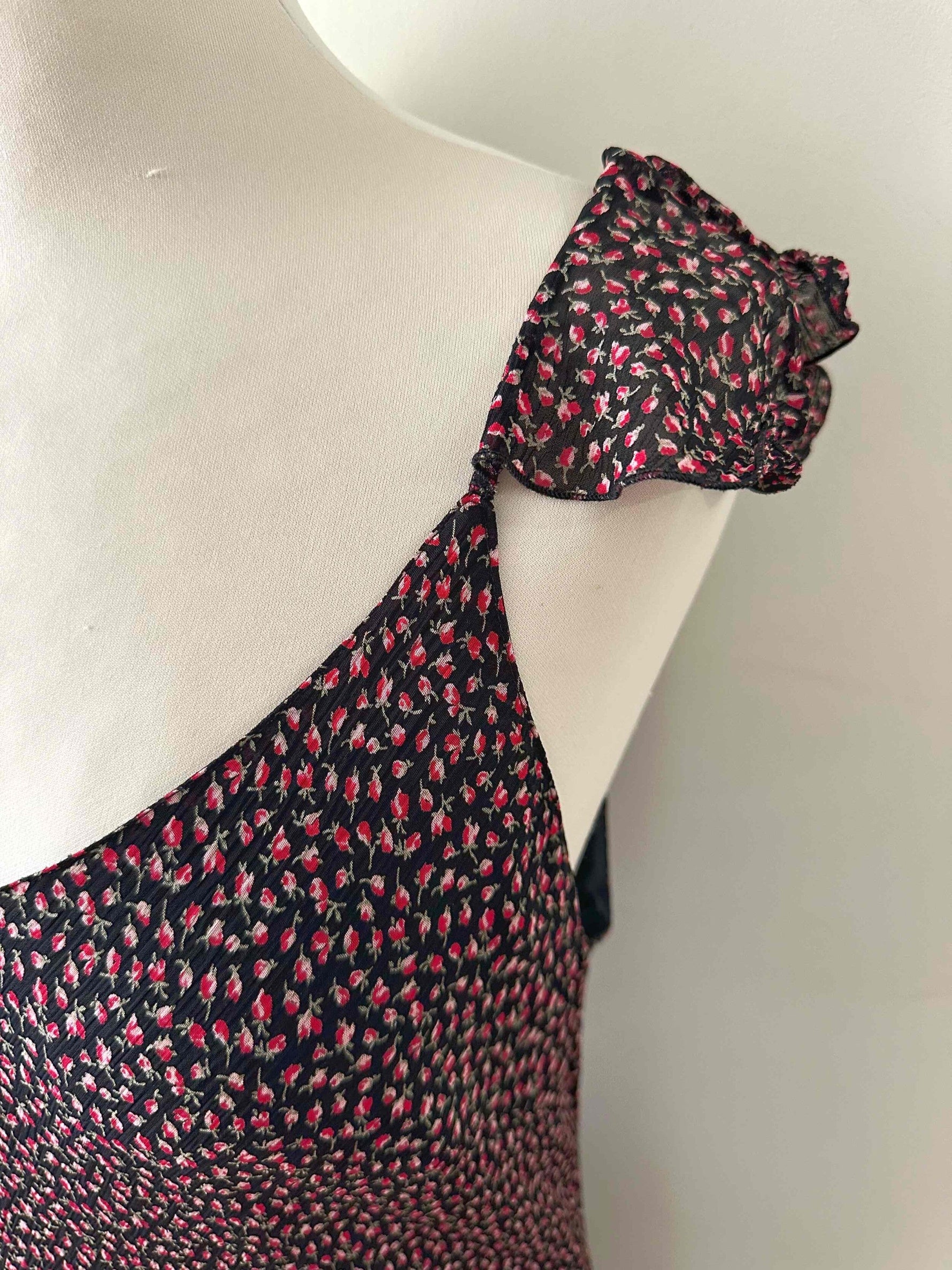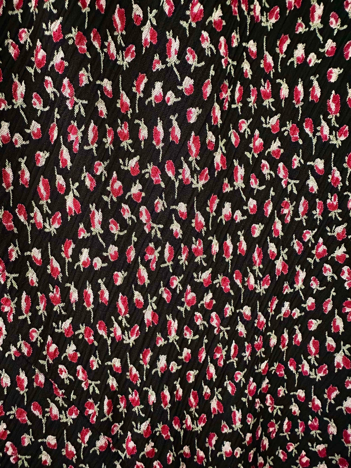 Prix unitaire parRobe nuisette à fleurs, en voile viscose doublée noire imprimée petits boutons de roses rouges.