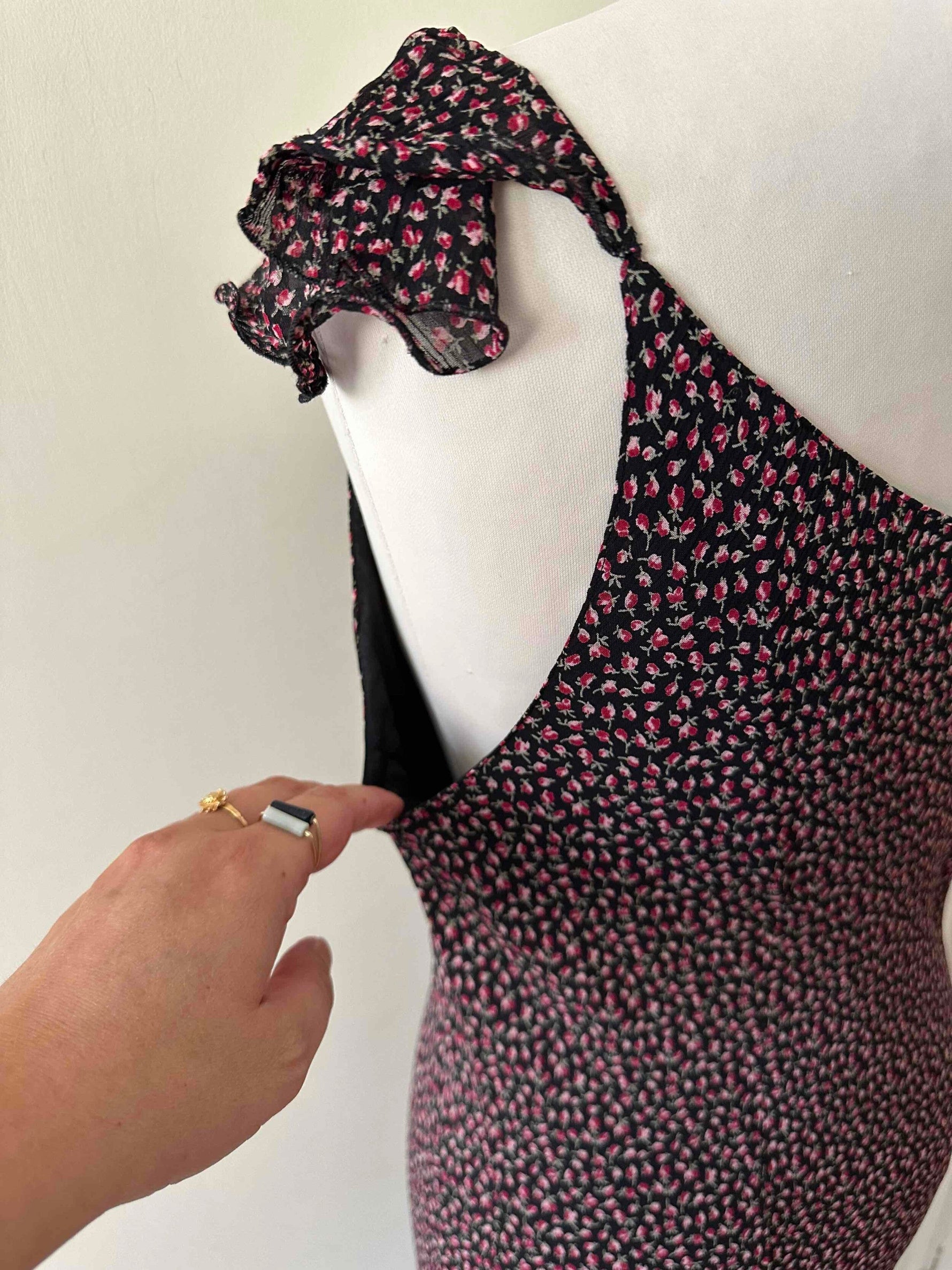 Bretelles spaghettis asymétriques, un côté volanté et un côté à trois bretelles.
