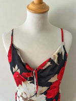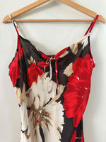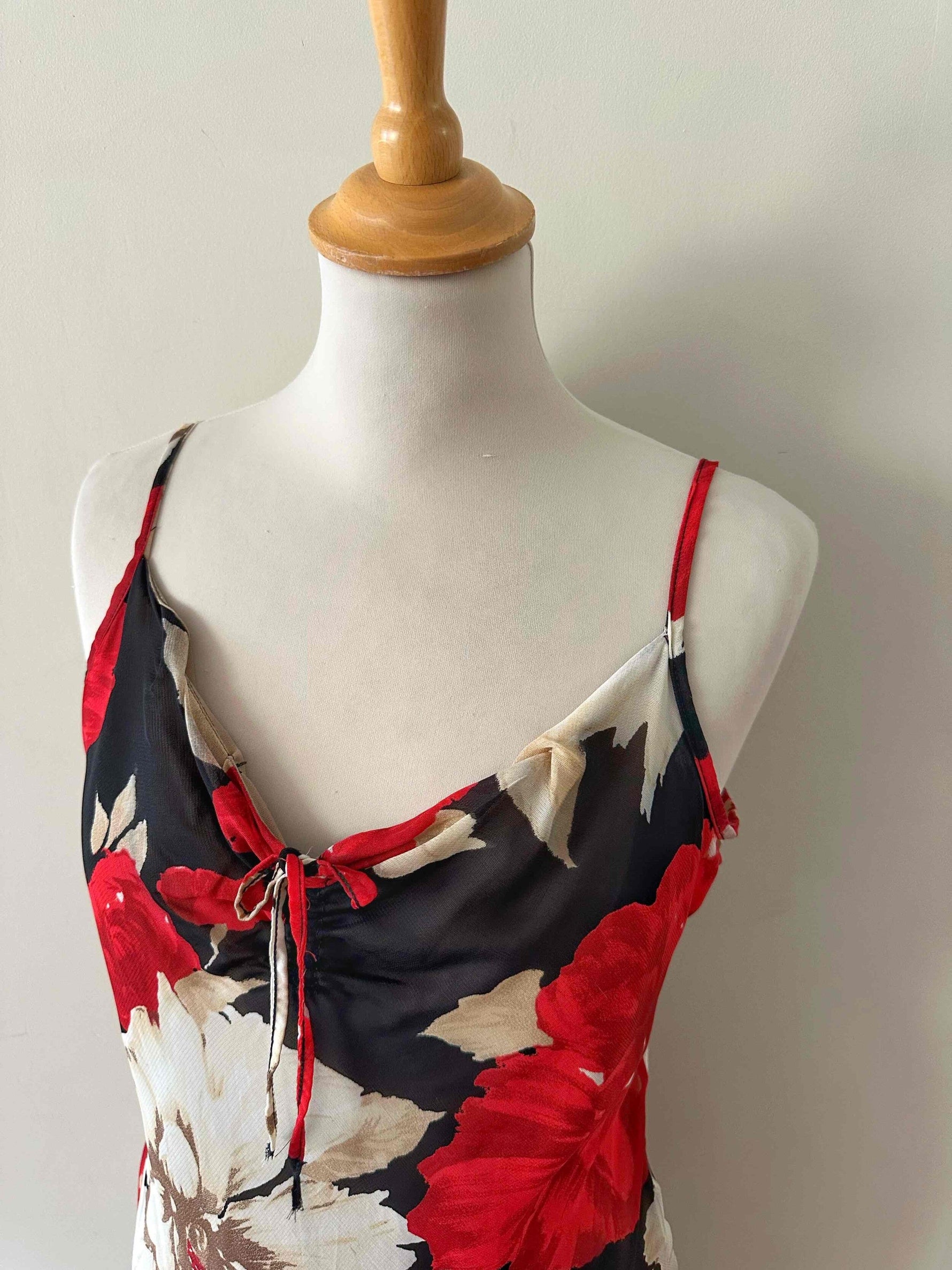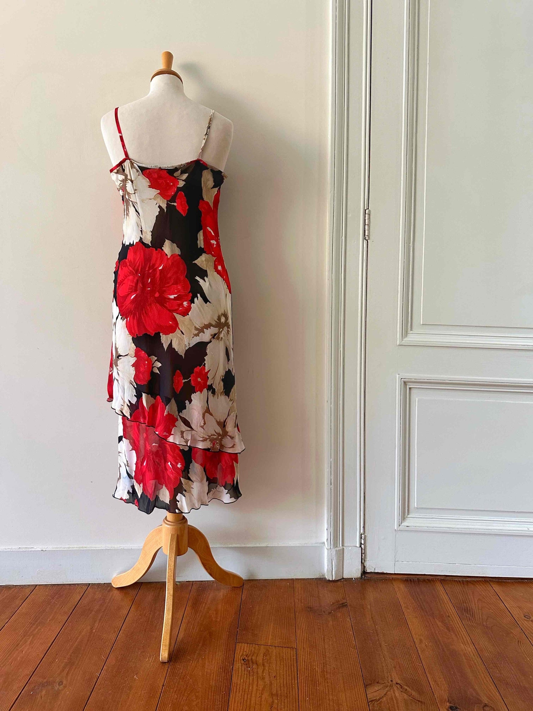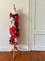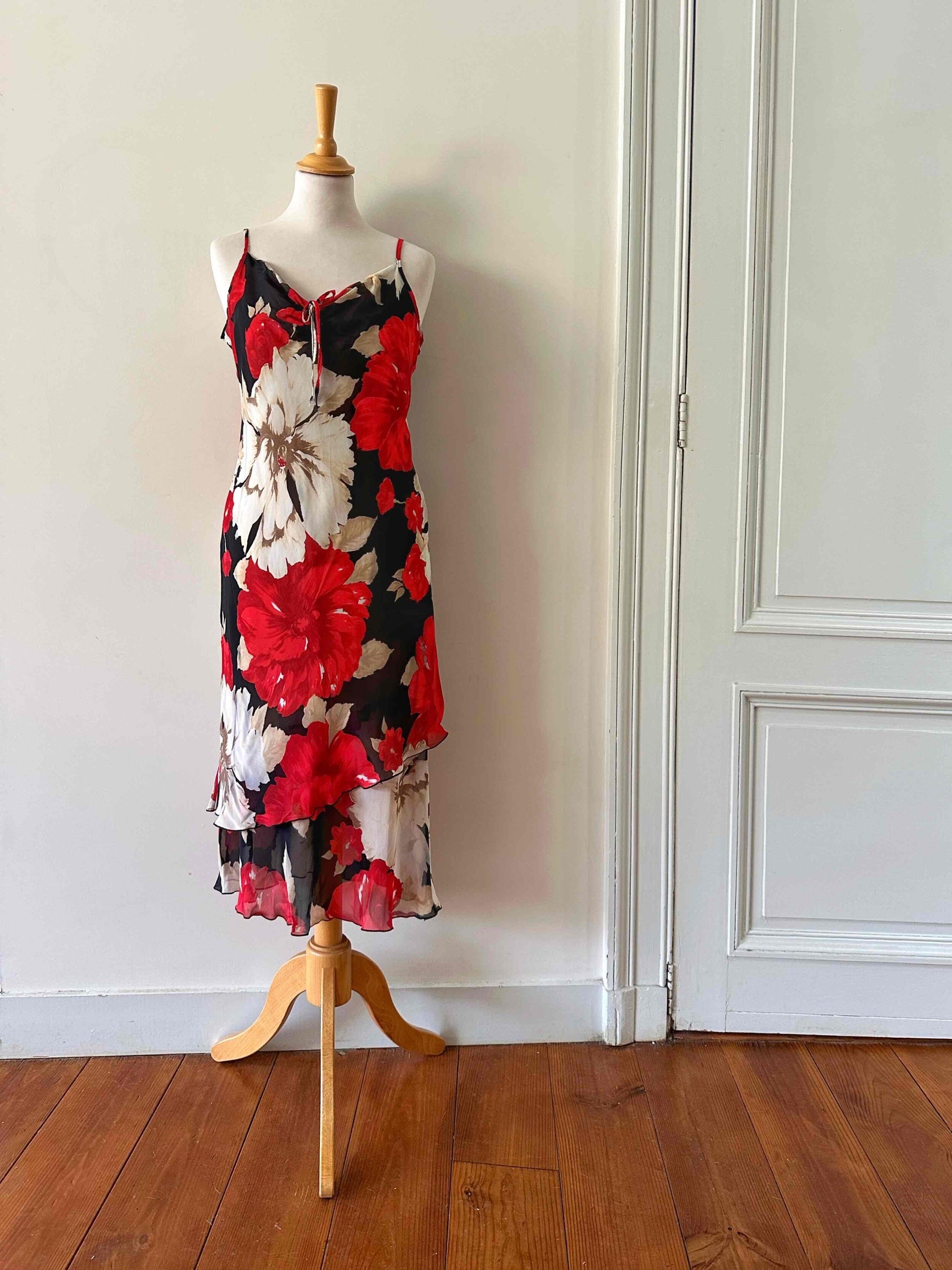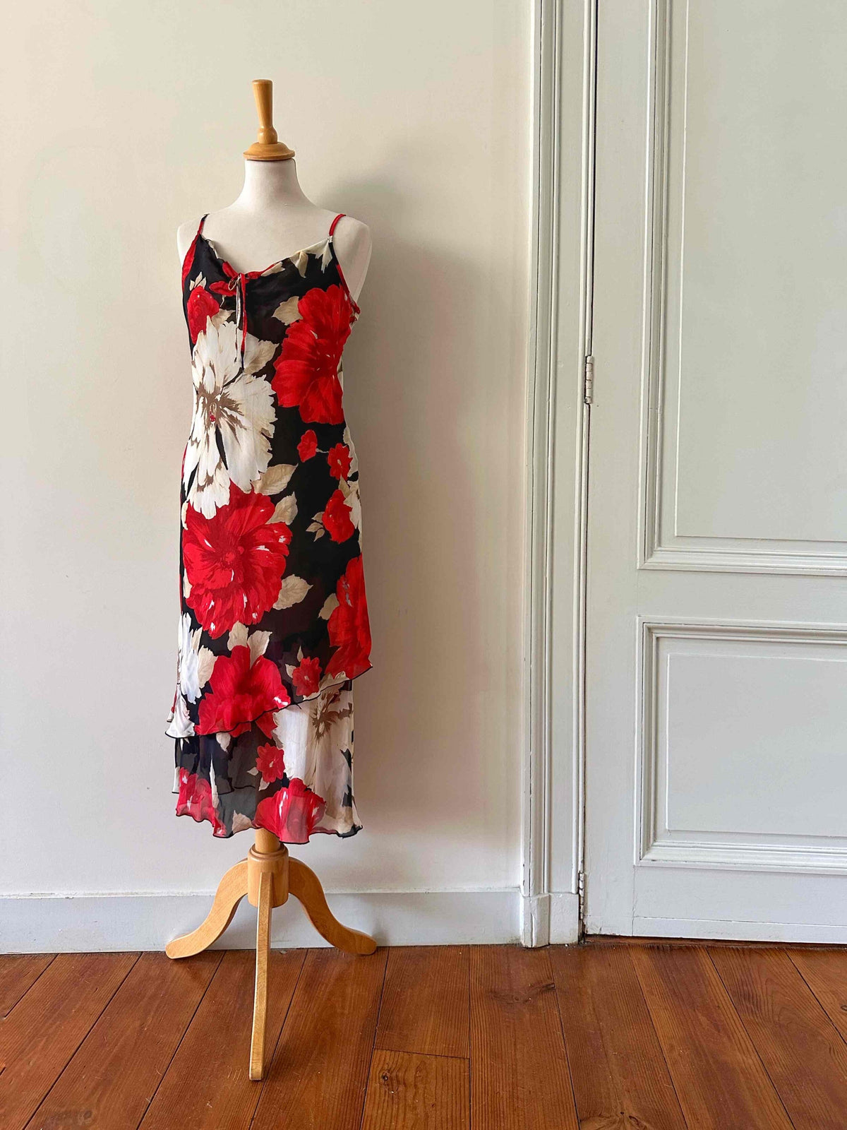 Prix unitaire parRobe nuisette à fleurs, en voile viscose doublée noire imprimée grandes fleurs rouges, beiges et blanches.