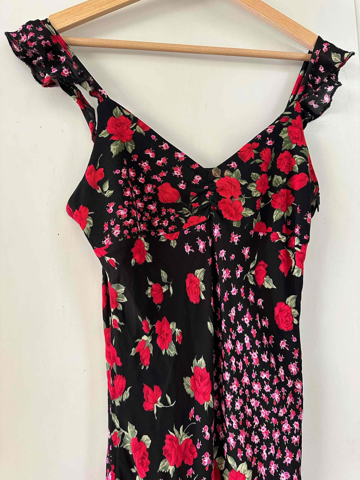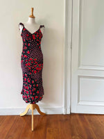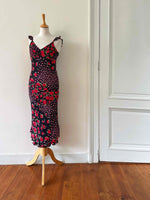 Prix unitaire parRobe nuisette à fleurs, en voile viscose noire motifs patchwork de roses rouges et vertes et fleurs roses fuschia.
