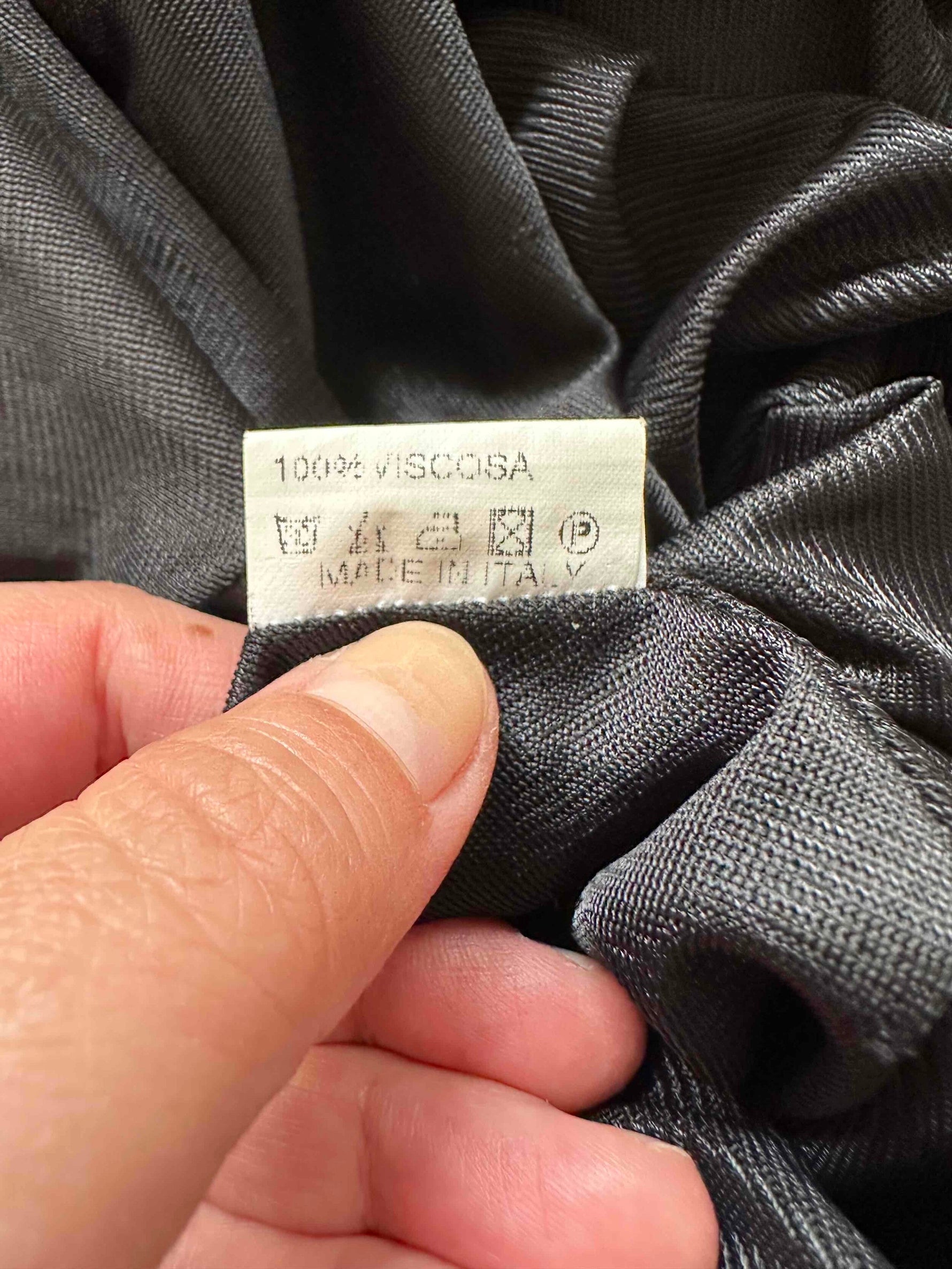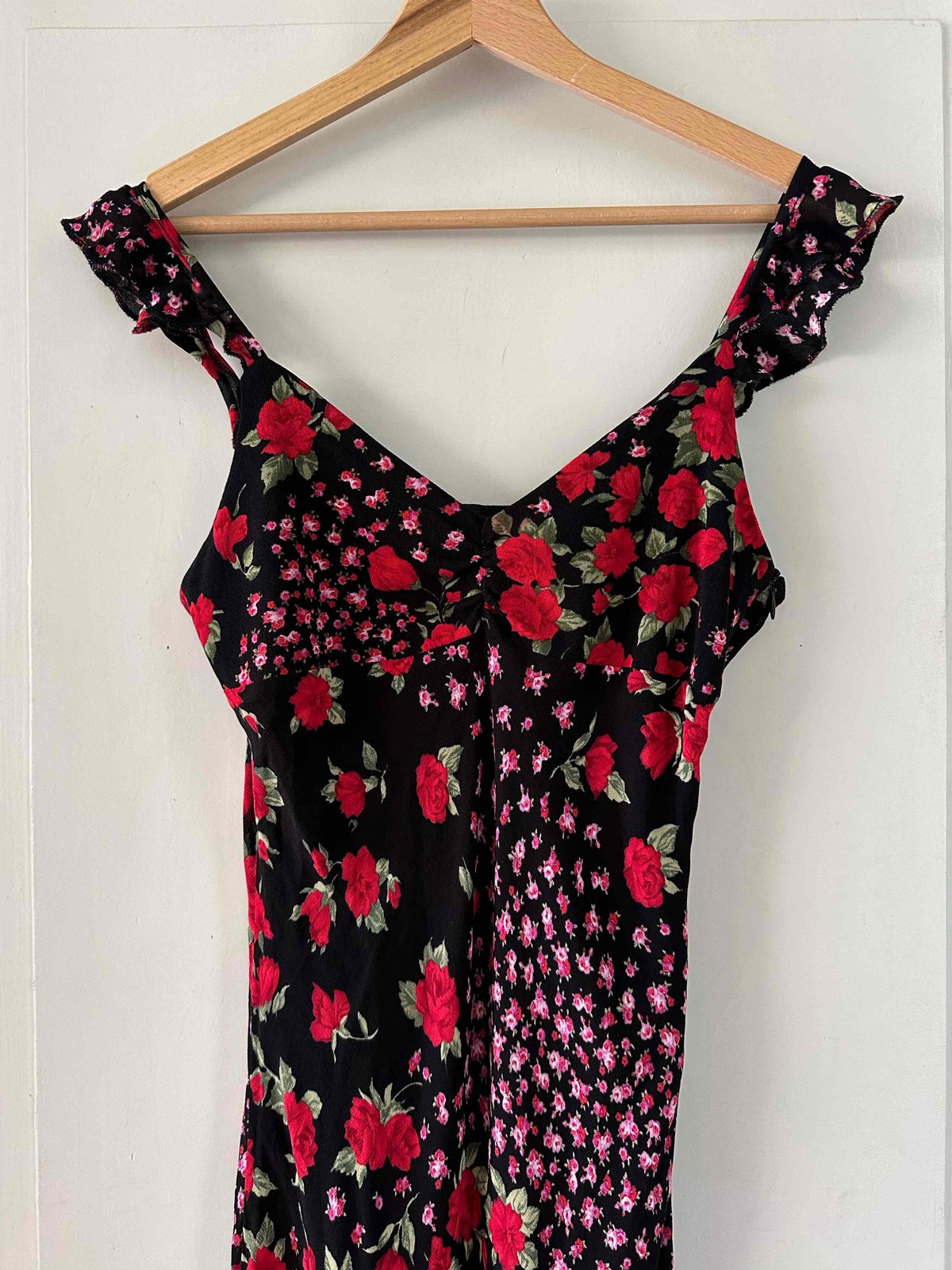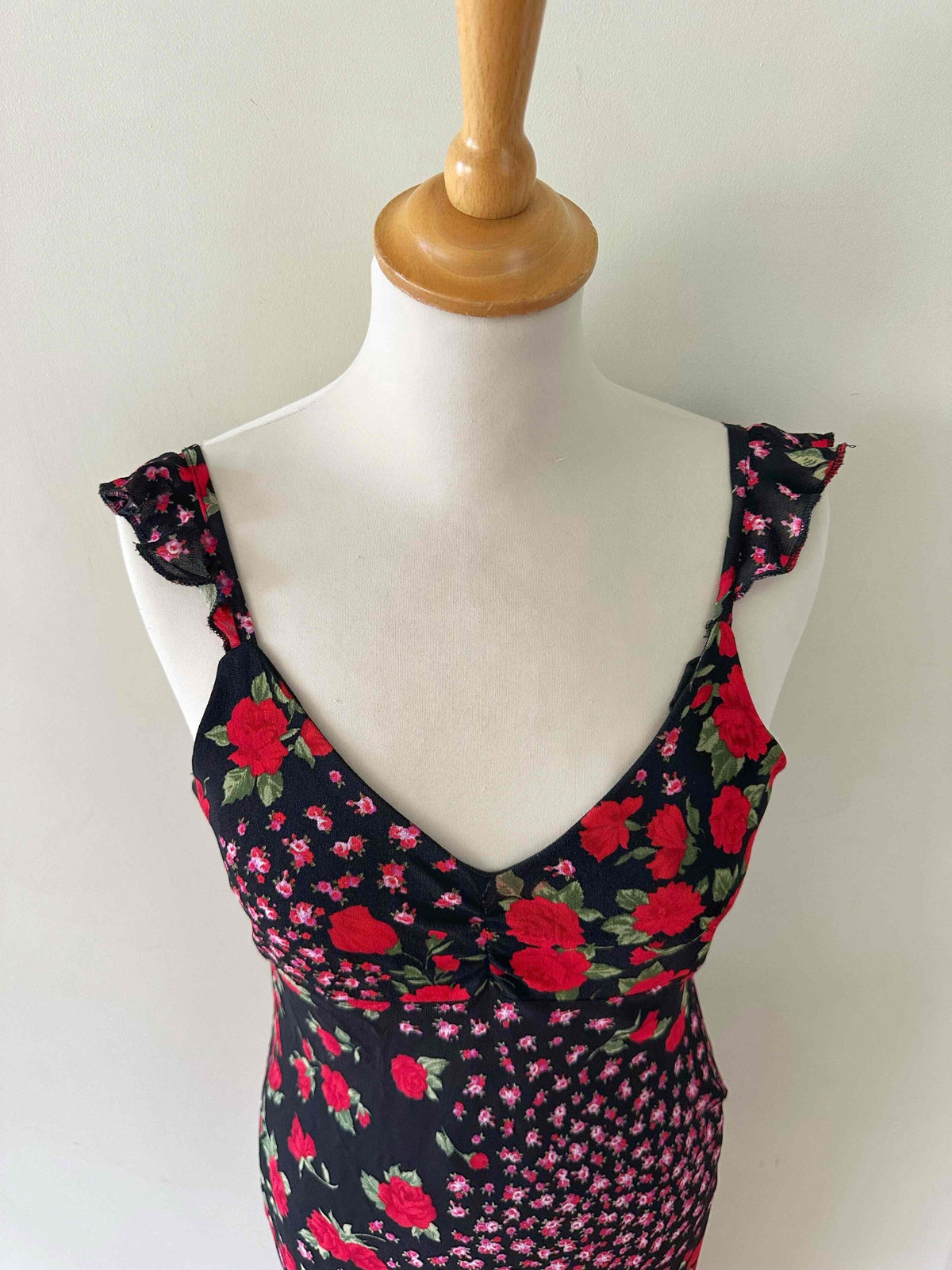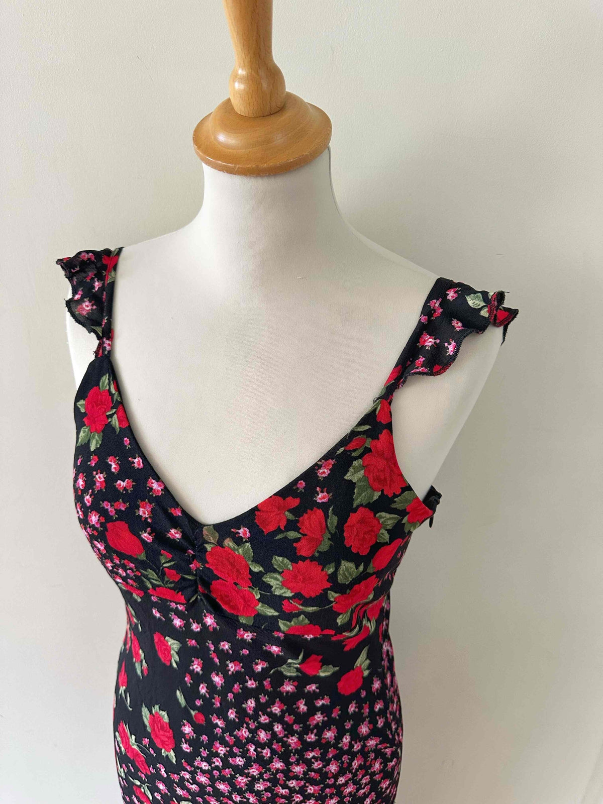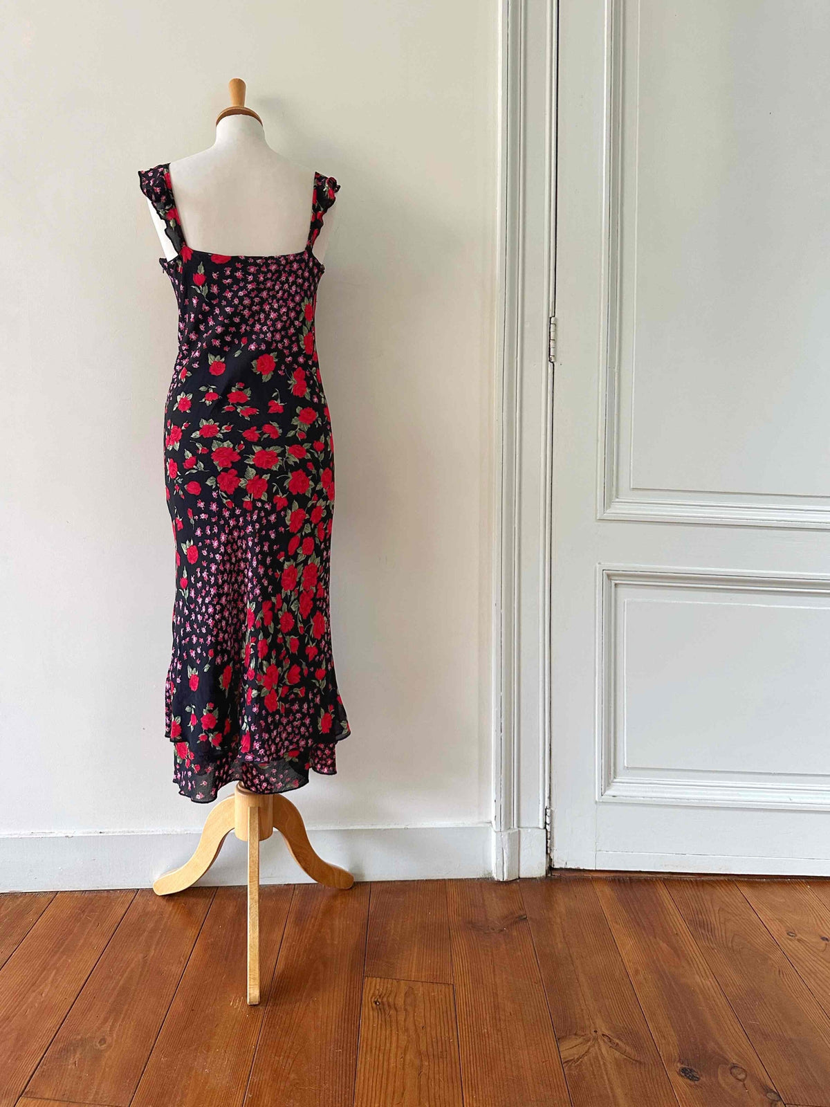Bretelles spaghettis à volants, encolure V, taillée en biais, fabriquée en Italie, taille 36 portée ici sur un mannequin T36, aisselles 43cm.