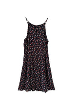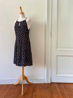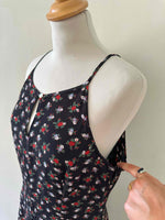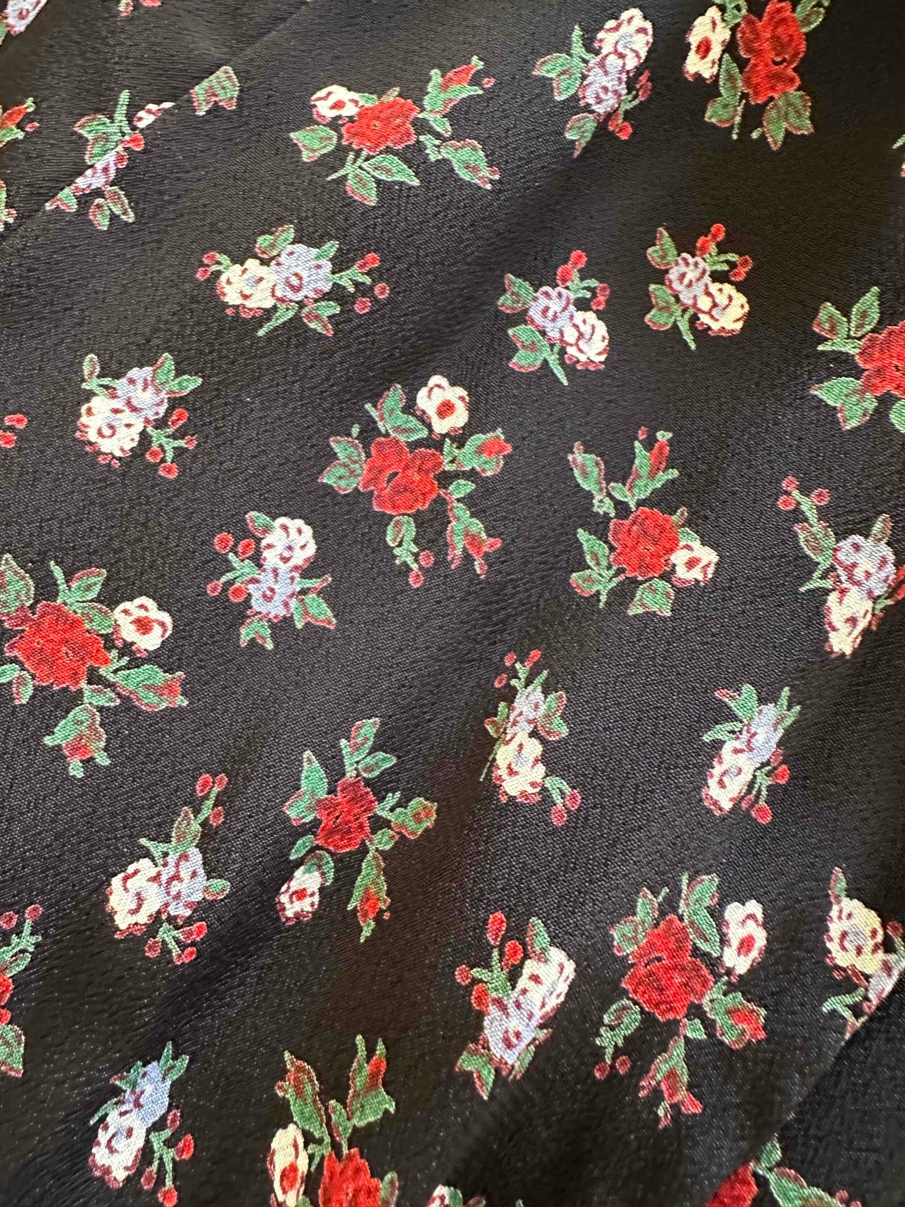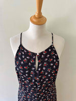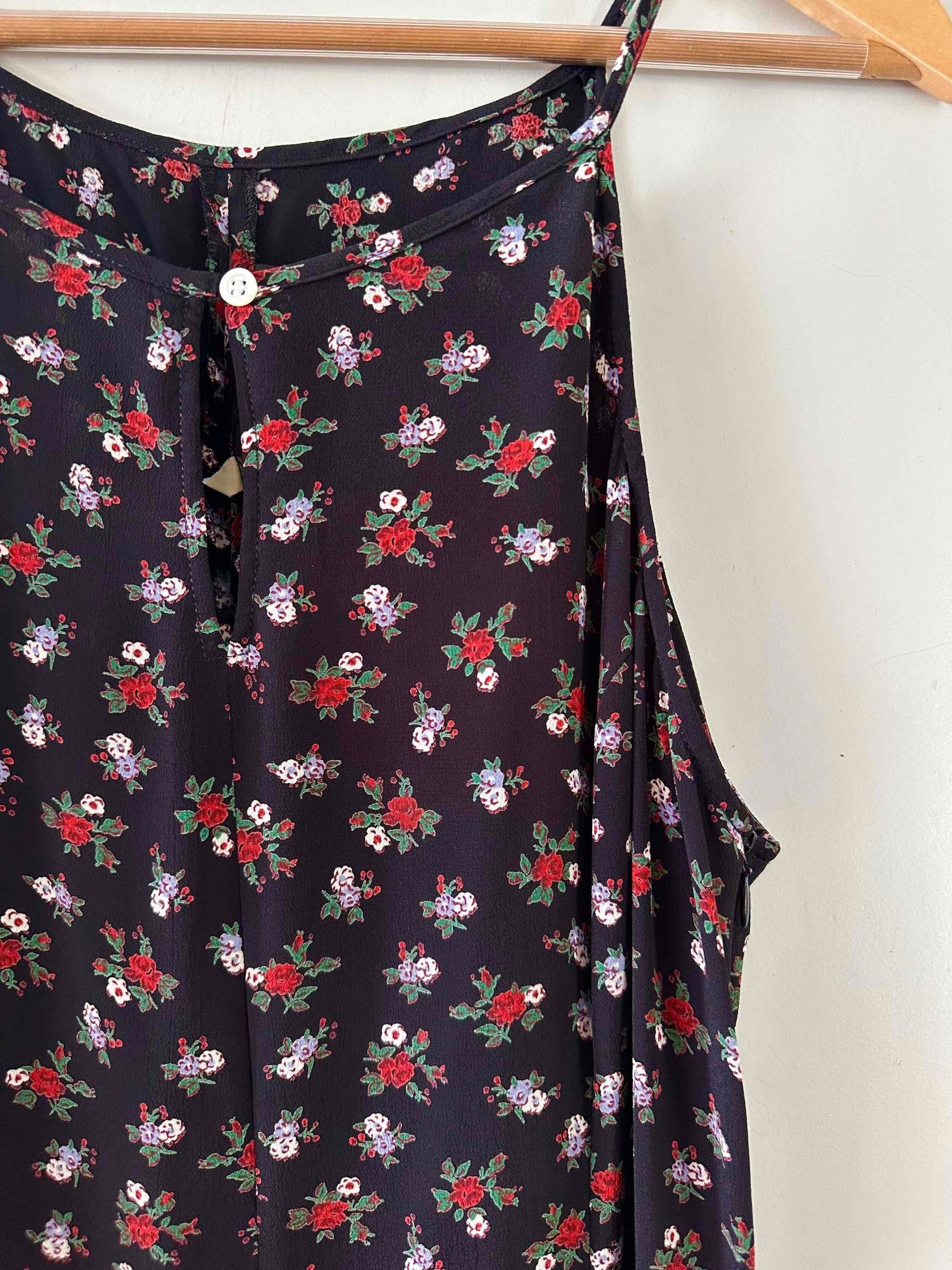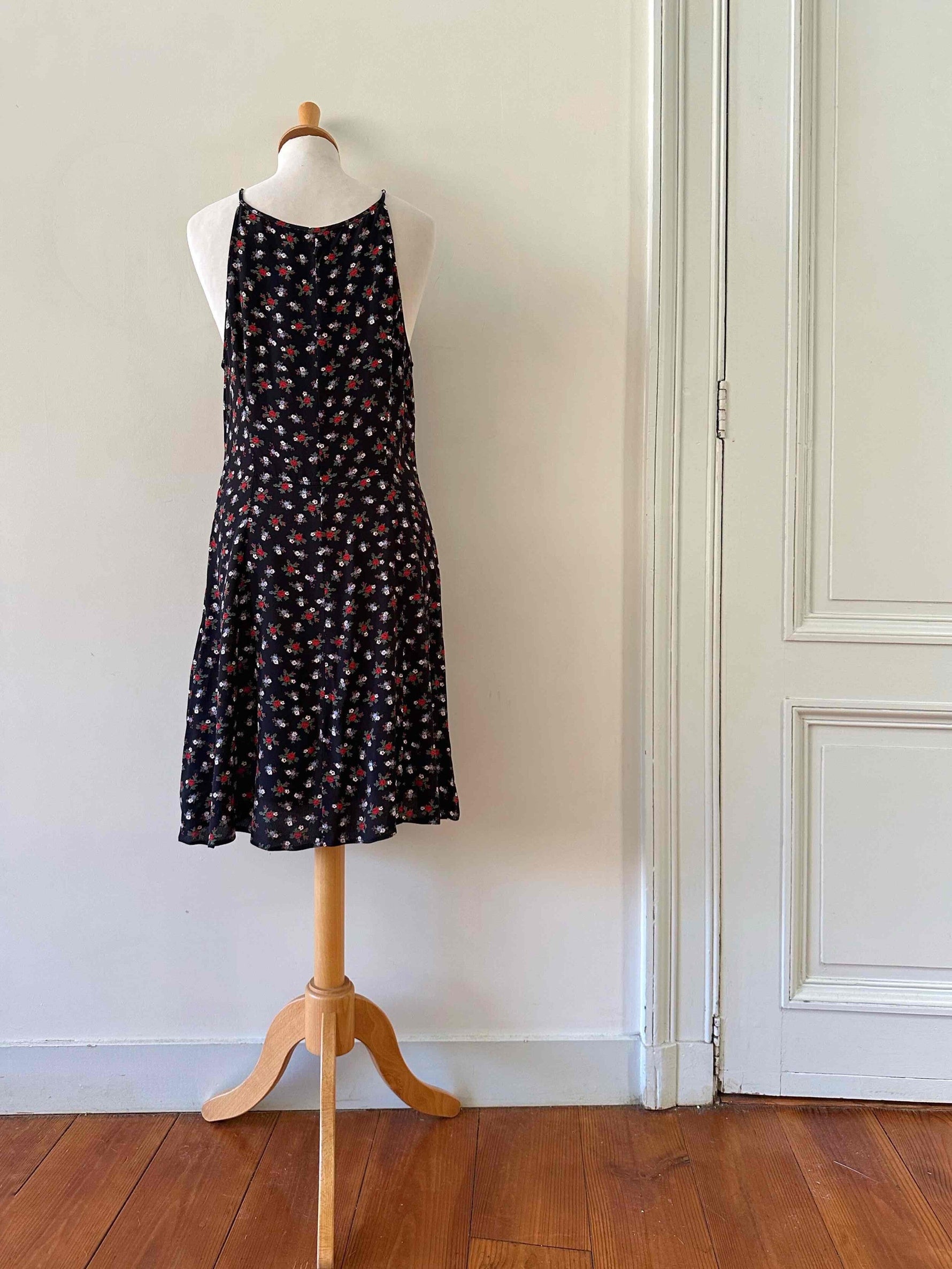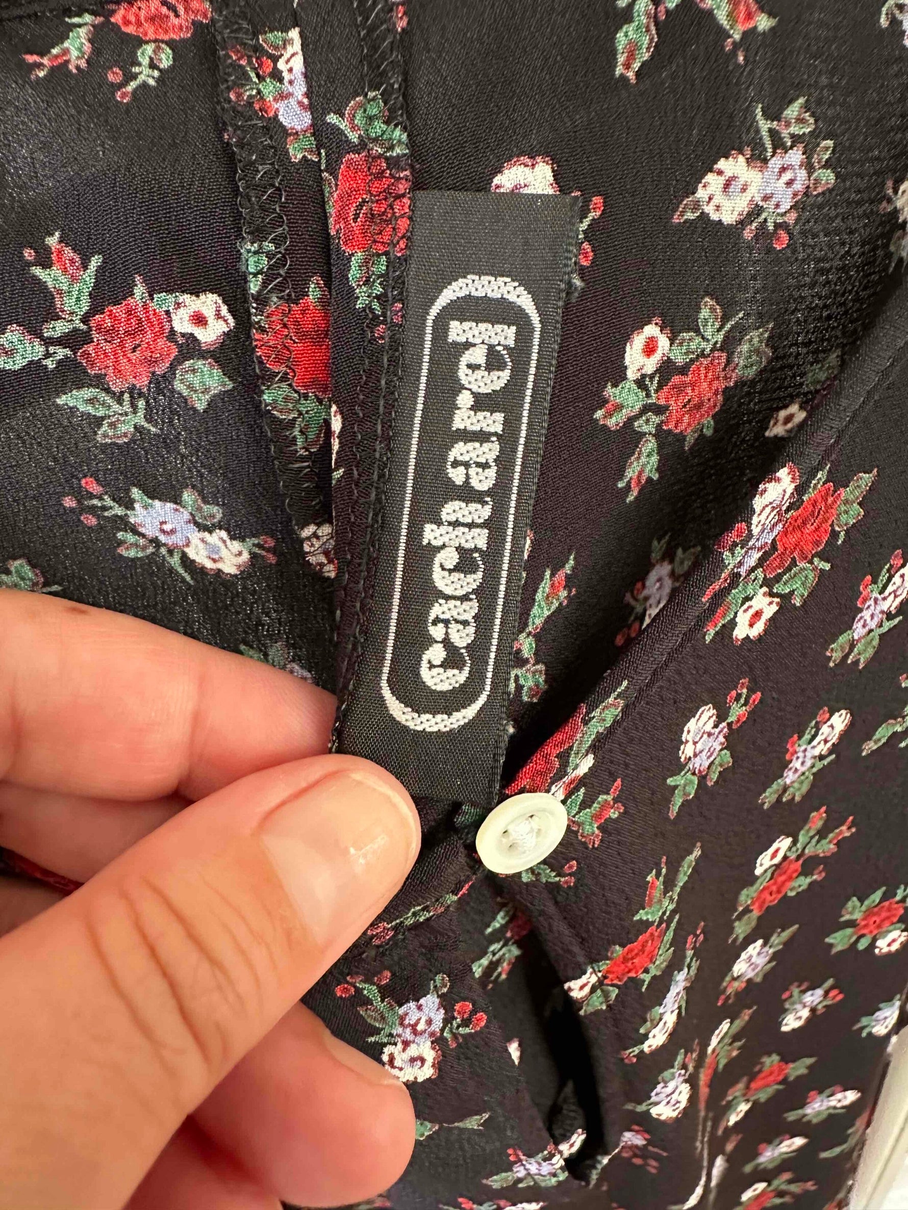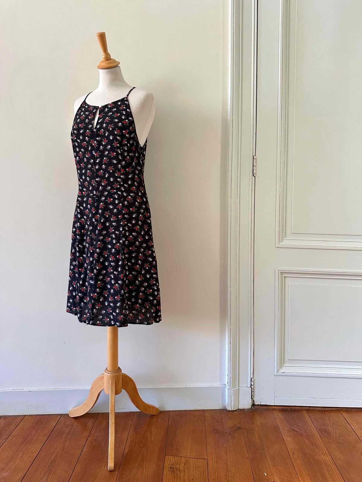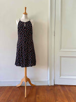Prix unitaire parRobe à fleurs Cacharel, en viscose noire imprimé motifs minis fleurs rouges, bretelles spaghettis en emmanchure américaines, goutte boutonnée devant, fermeture éclair côté, fabriquée en Italie, taille 38 portée ici sur un mannequin T36, aisselles 46cm.