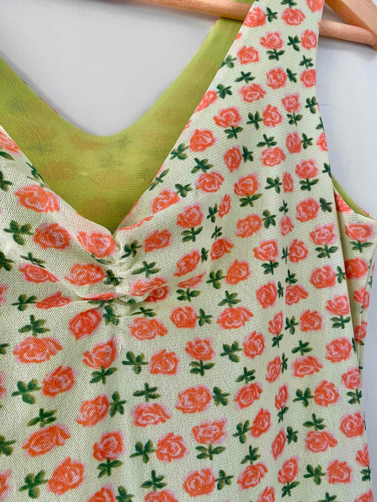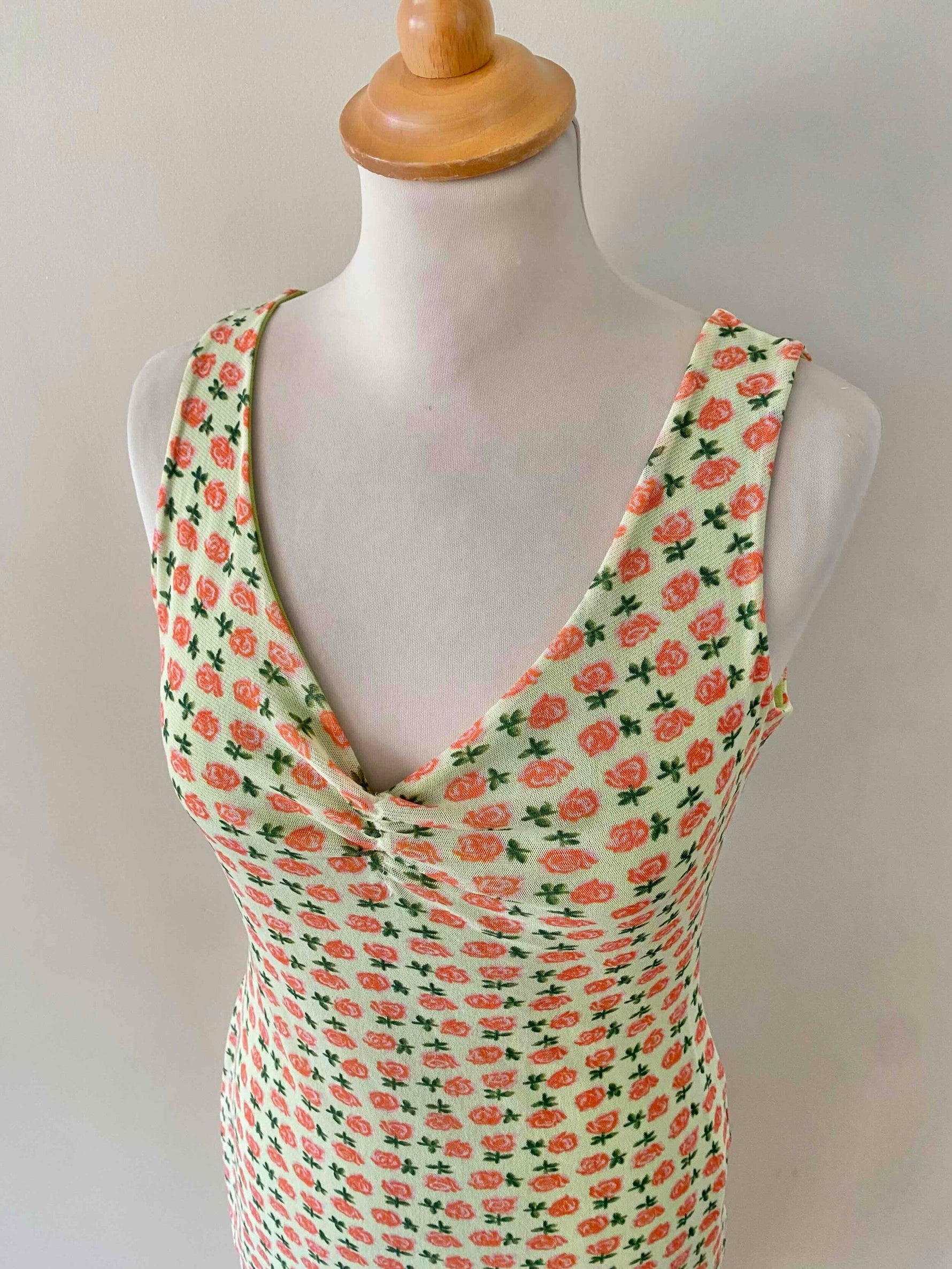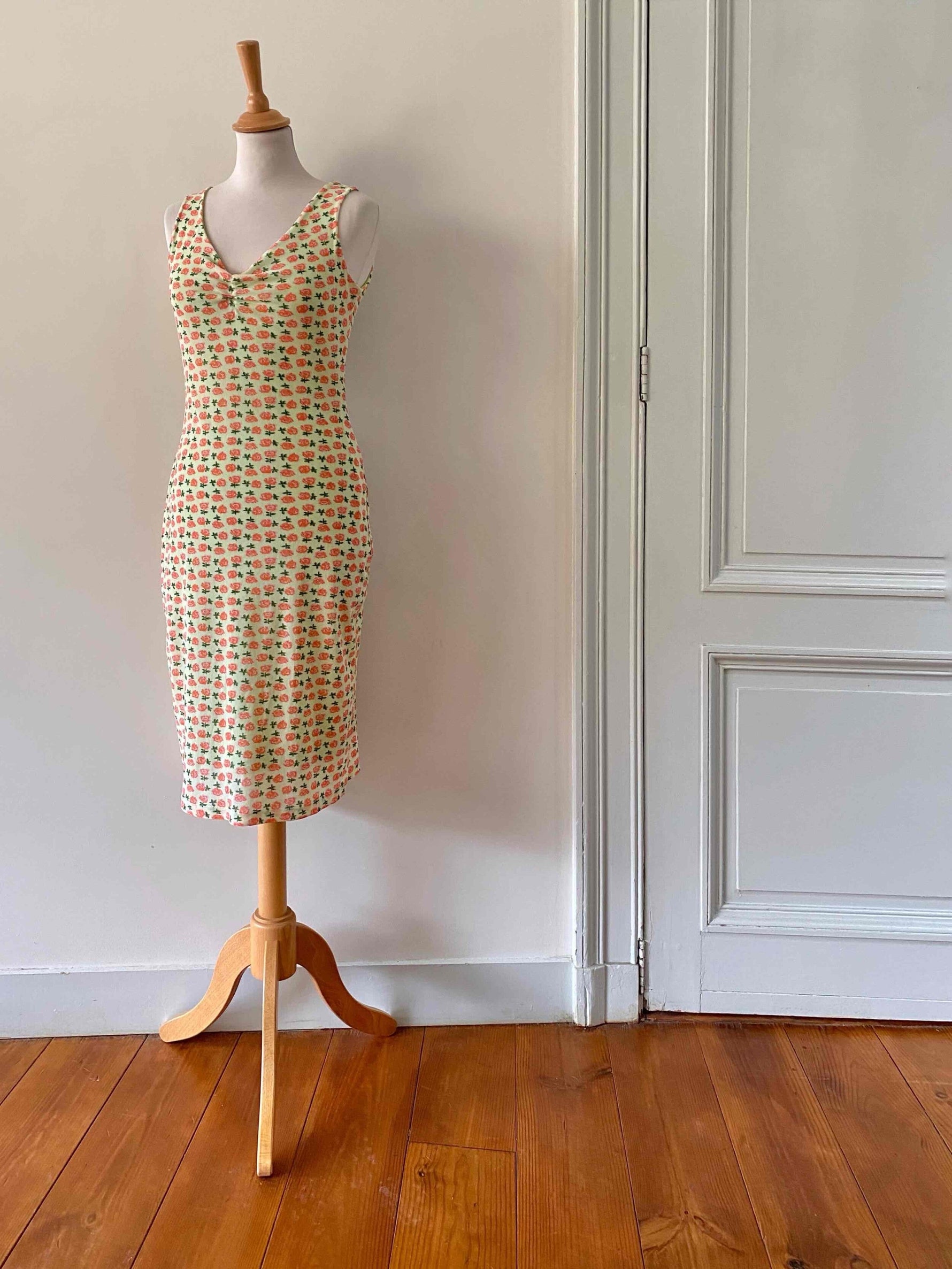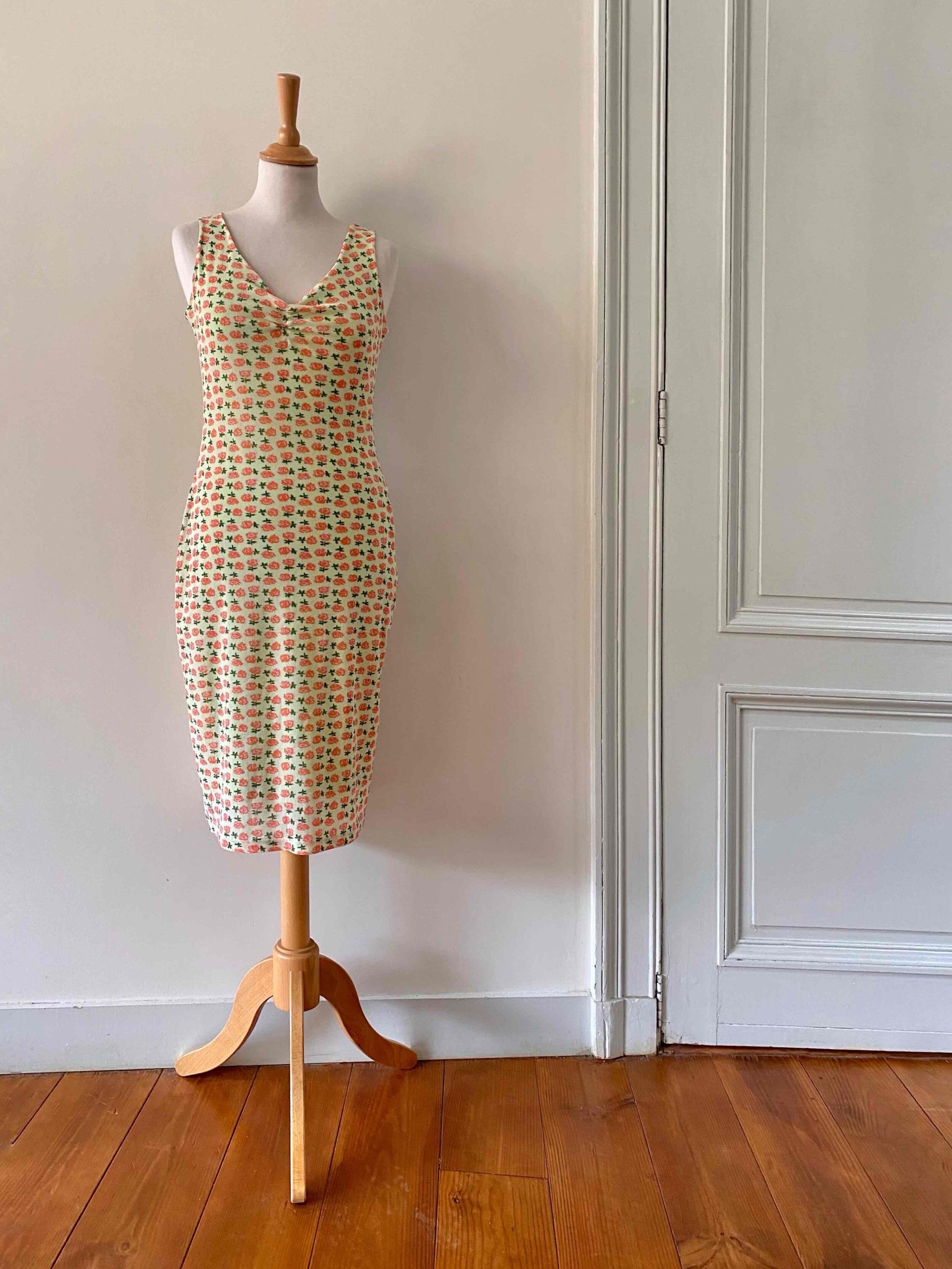 Prix unitaire parRobe fleurie en maille mesh, vert pistache imprimée petites fleurs roses et vertes, poitrine froncée, forme gainante, fabriquée en Europe, taille 36 portée ici sur un mannequin T36, aisselles 43cm.