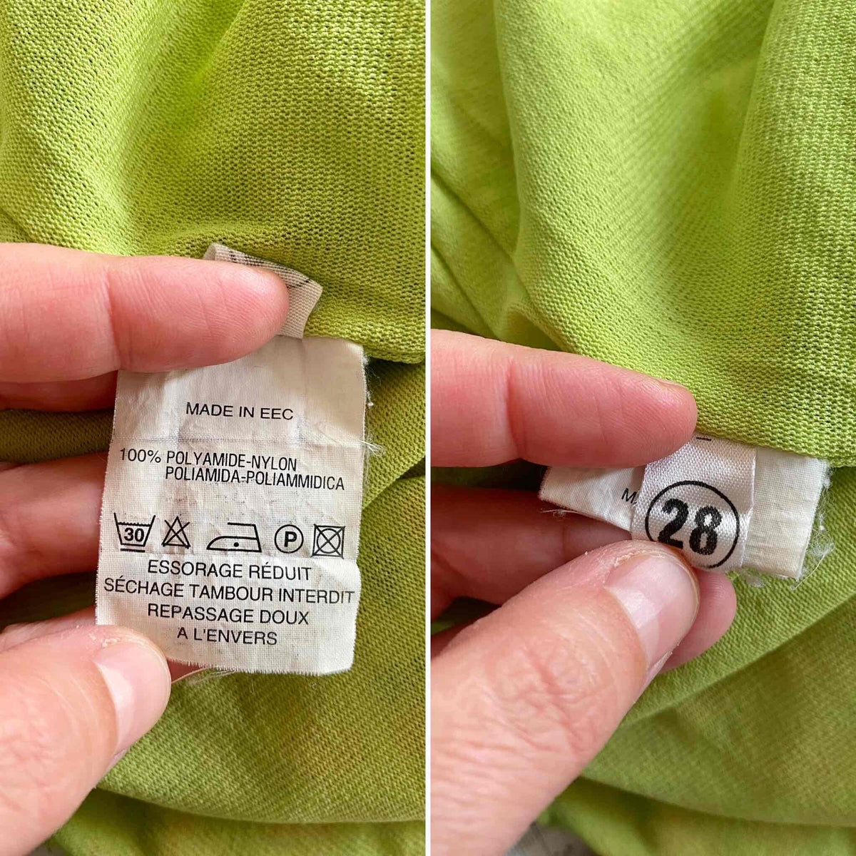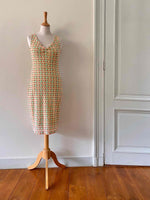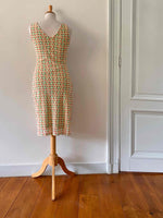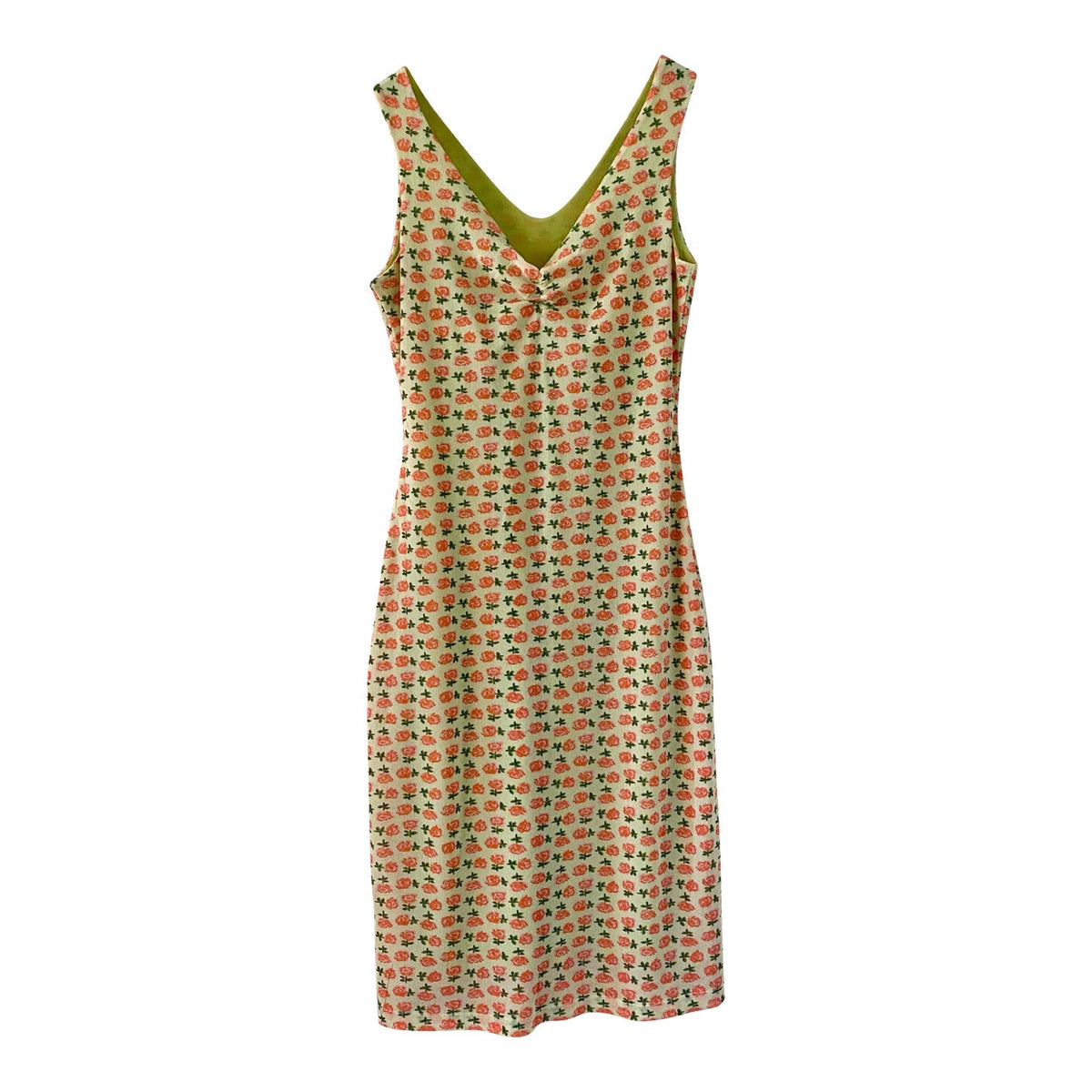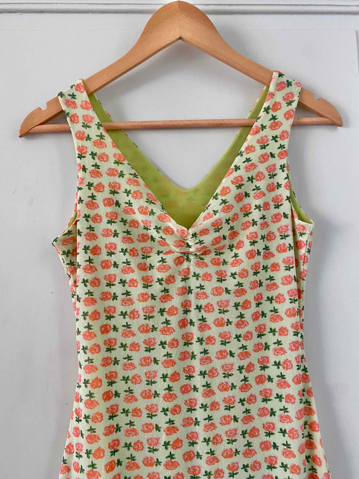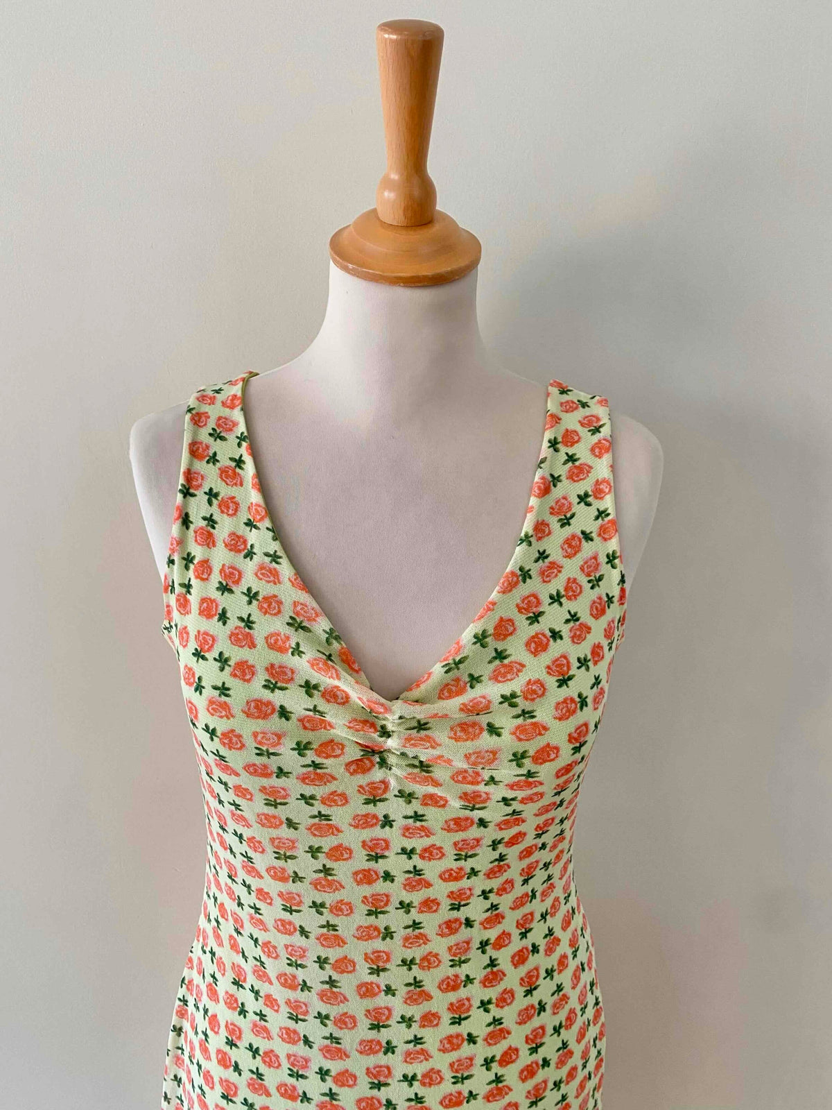 Prix unitaire parRobe fleurie en maille mesh, vert pistache imprimée petites fleurs roses et vertes, poitrine froncée, forme gainante, fabriquée en Europe, taille 36 portée ici sur un mannequin T36, aisselles 43cm.