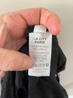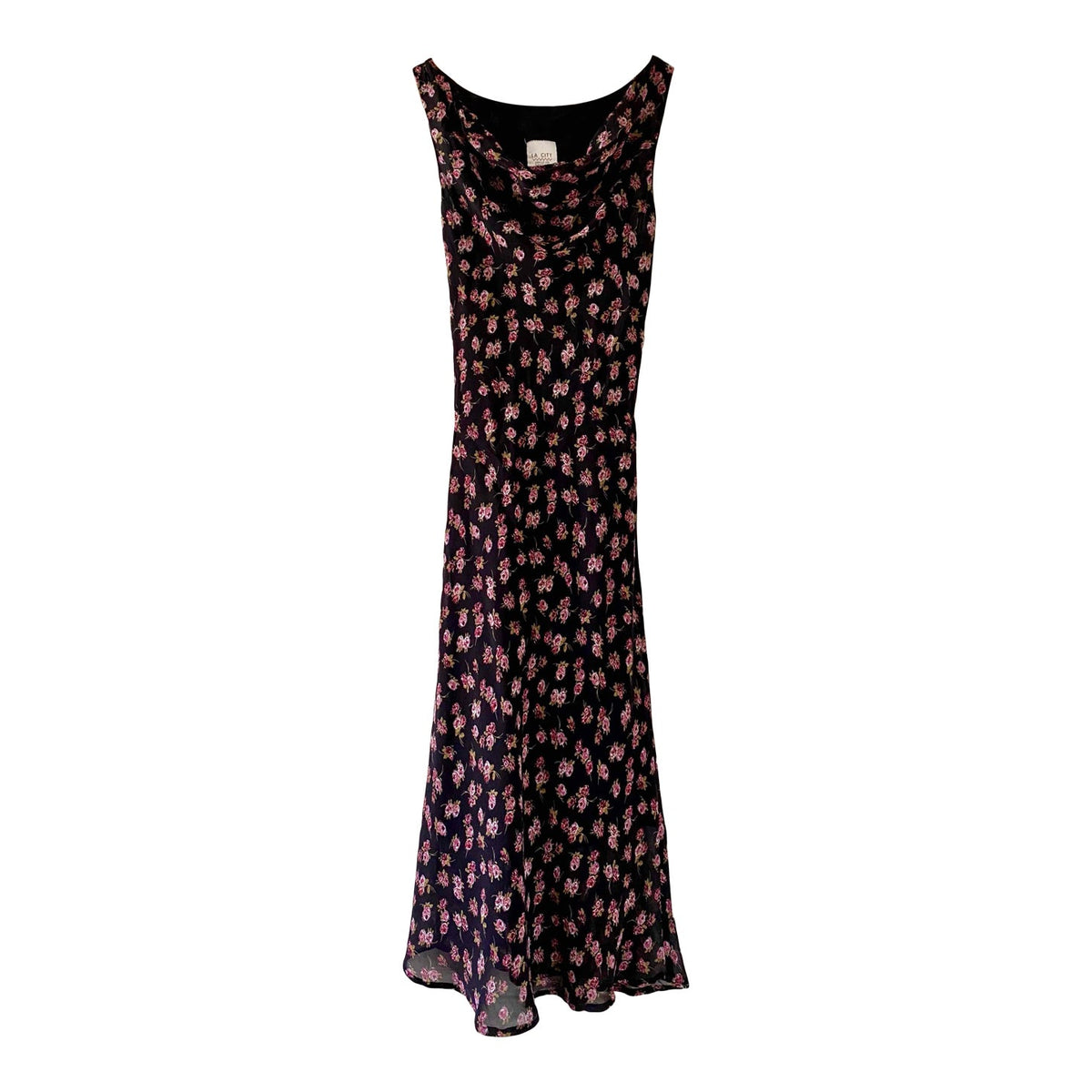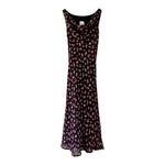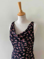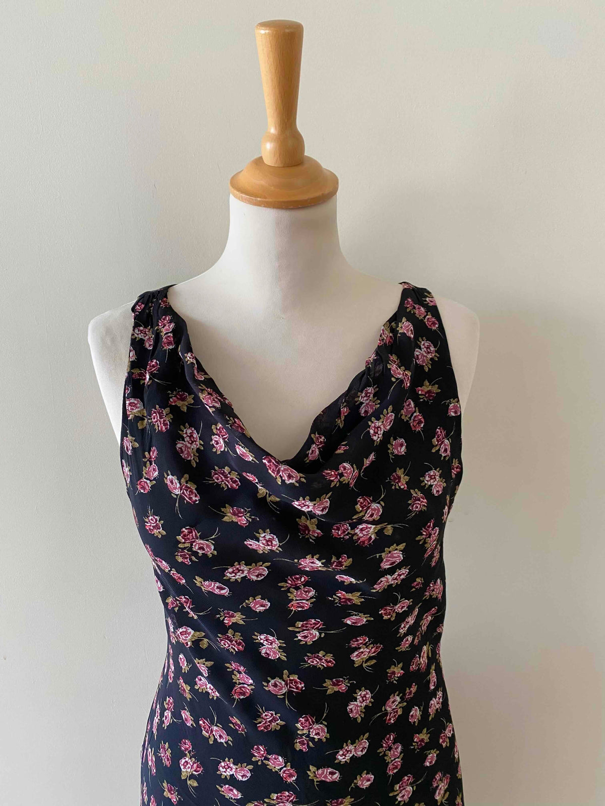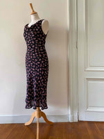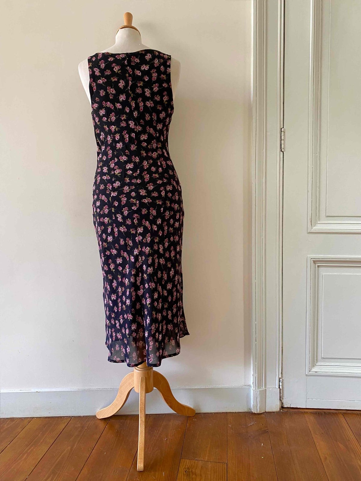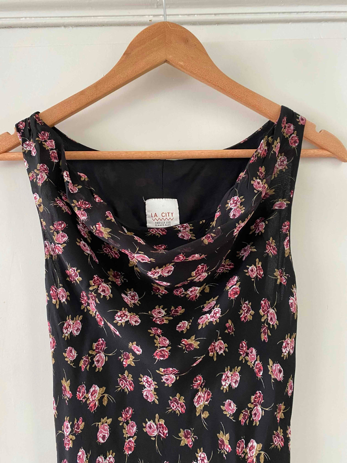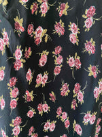 Prix unitaire parRobe midi à fleurs en voile viscose noire imprimée fleurs boutons de roses grenats, roses et vertes, encolure drappée benitier, fabriquée en France, taille 36 portée ici sur un mannequin T36.