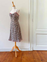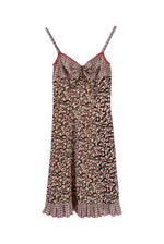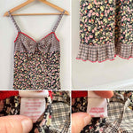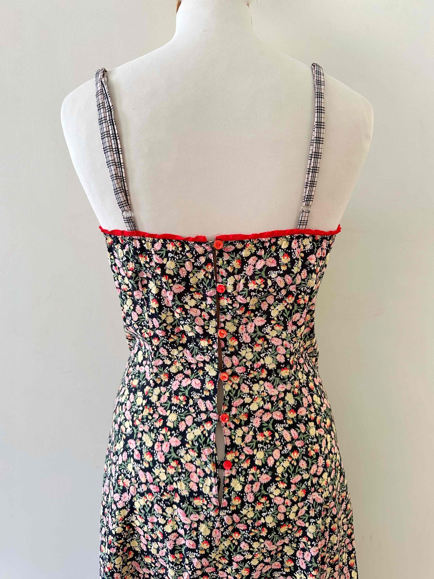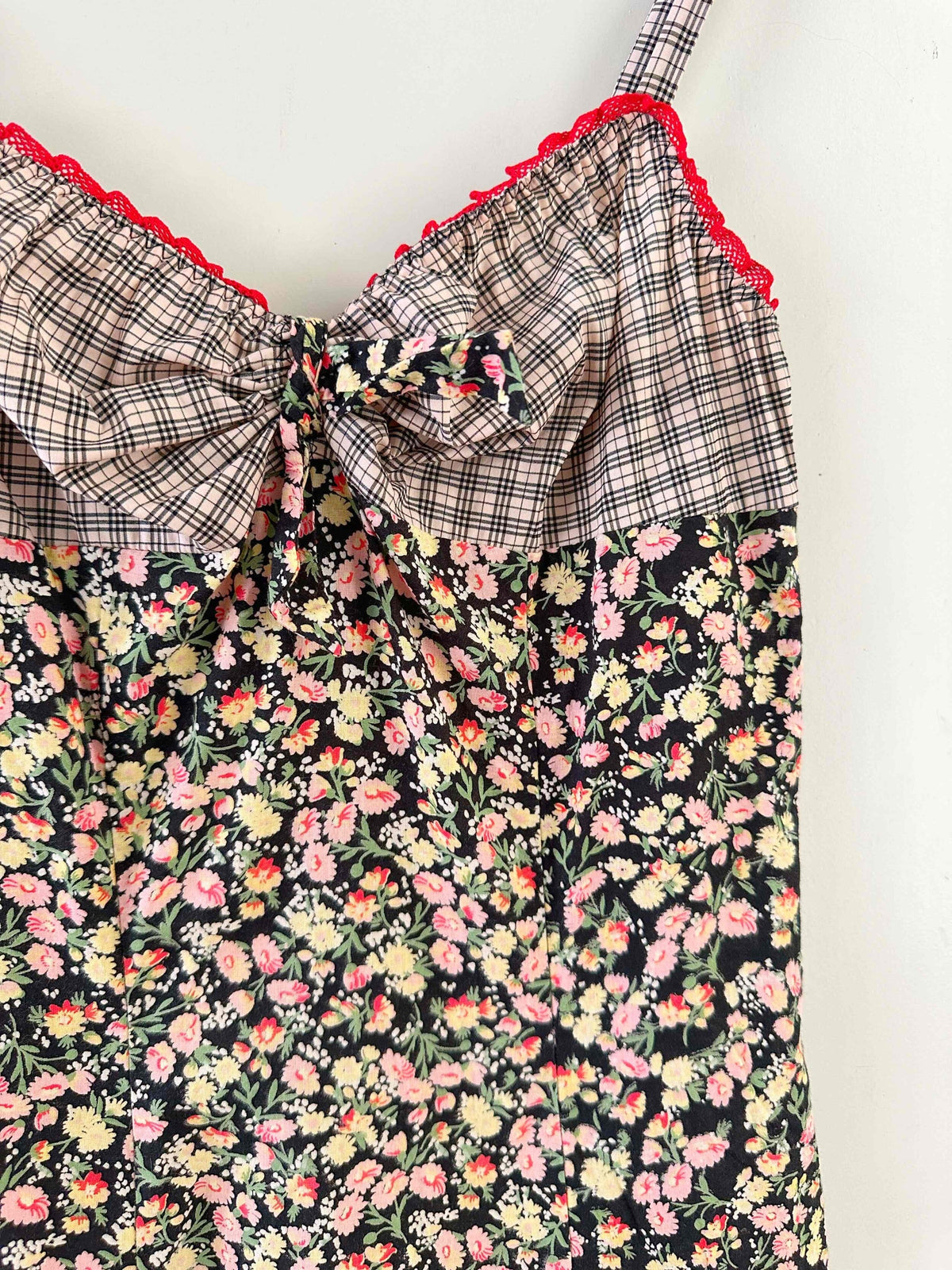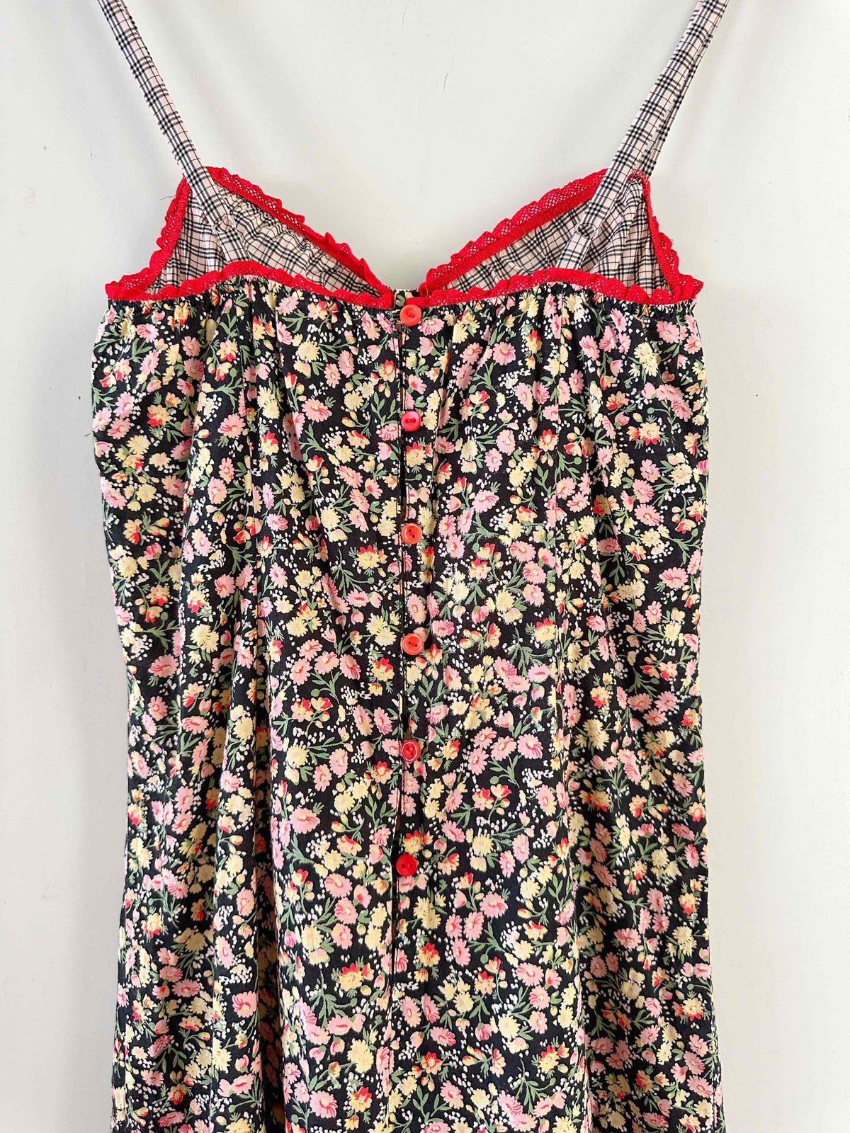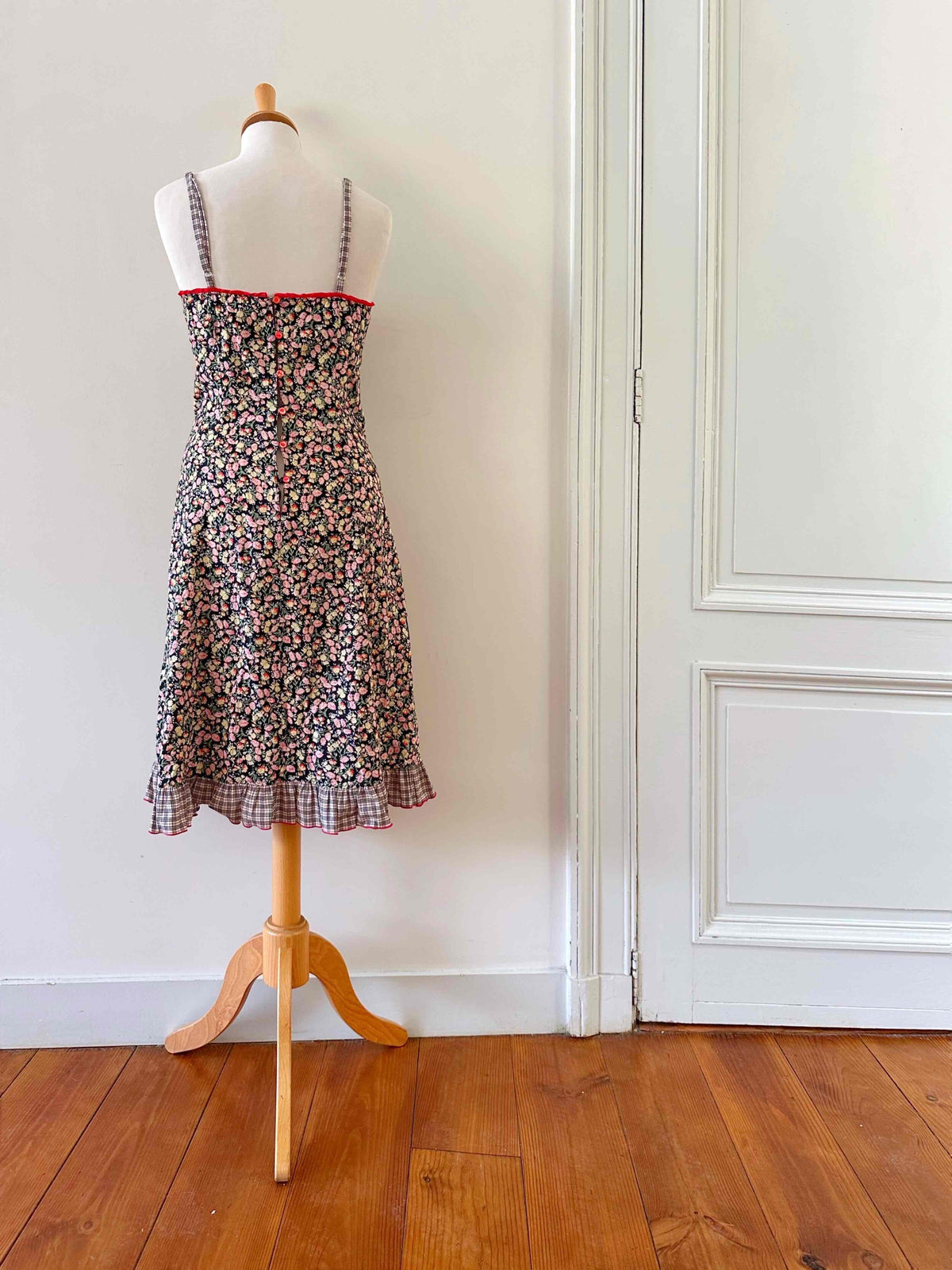 Prix unitaire parRobe nuisette fleurs et vichy, en coton et empiècements mélangés, conton noir à petites fleurs multicolores, poitrine et bretelles spaghettis réglables à carreaux vichy, bordure en dentelle rouge, dos plongeant à boutonner, fabriquée en France, taille 36 portée ici sur un mannequin T36, aisselles 43cm.