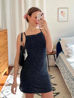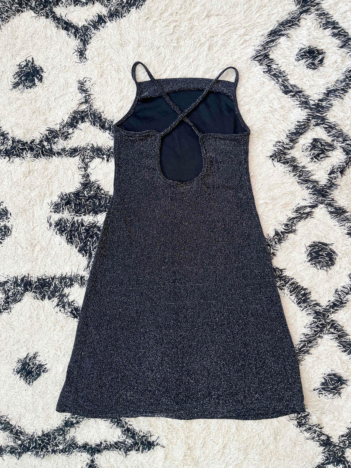Prix unitaire parRobe courte à paillettes, bretelles non ajustables qui se croisent dans le dos, fabriquée en France. Portée ici sur une T36 pour 1m64