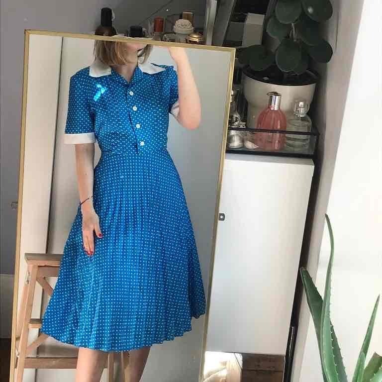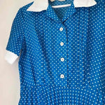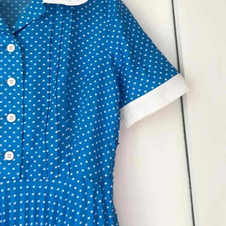 Prix unitaire parRobe longue bleu vif à pois, coupe typique des années 60s, haut chemisier col blanc et bas plissé - fluide et ample, entièrement doublée (Marque "Diolen"). Mesures supplémentaires : poitrine 50 cm.