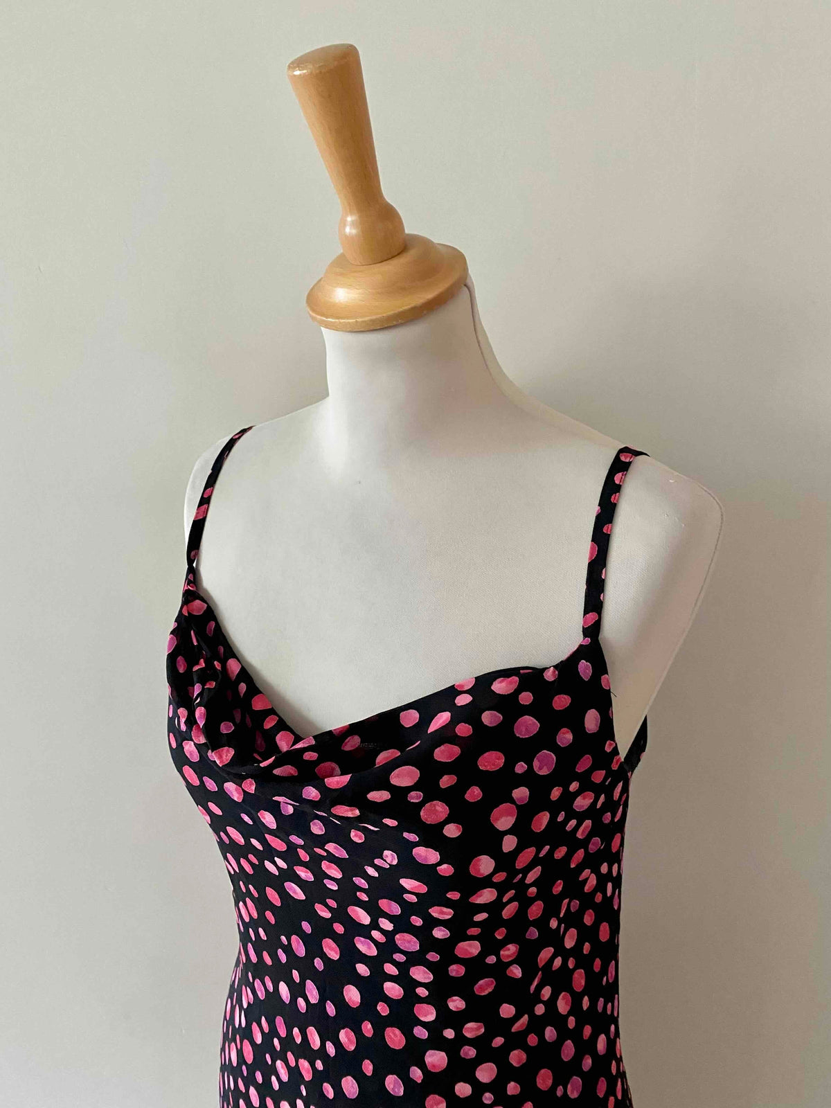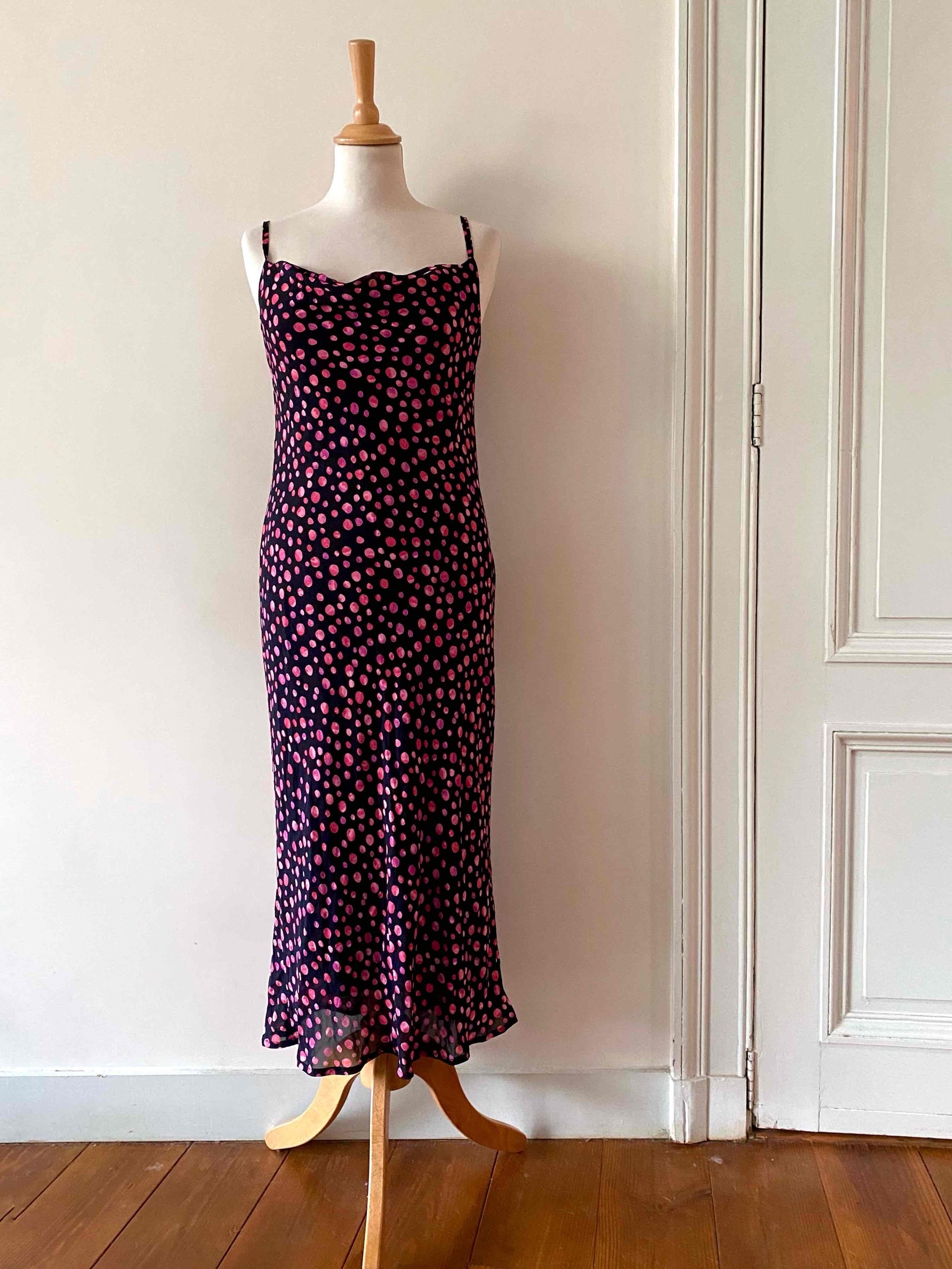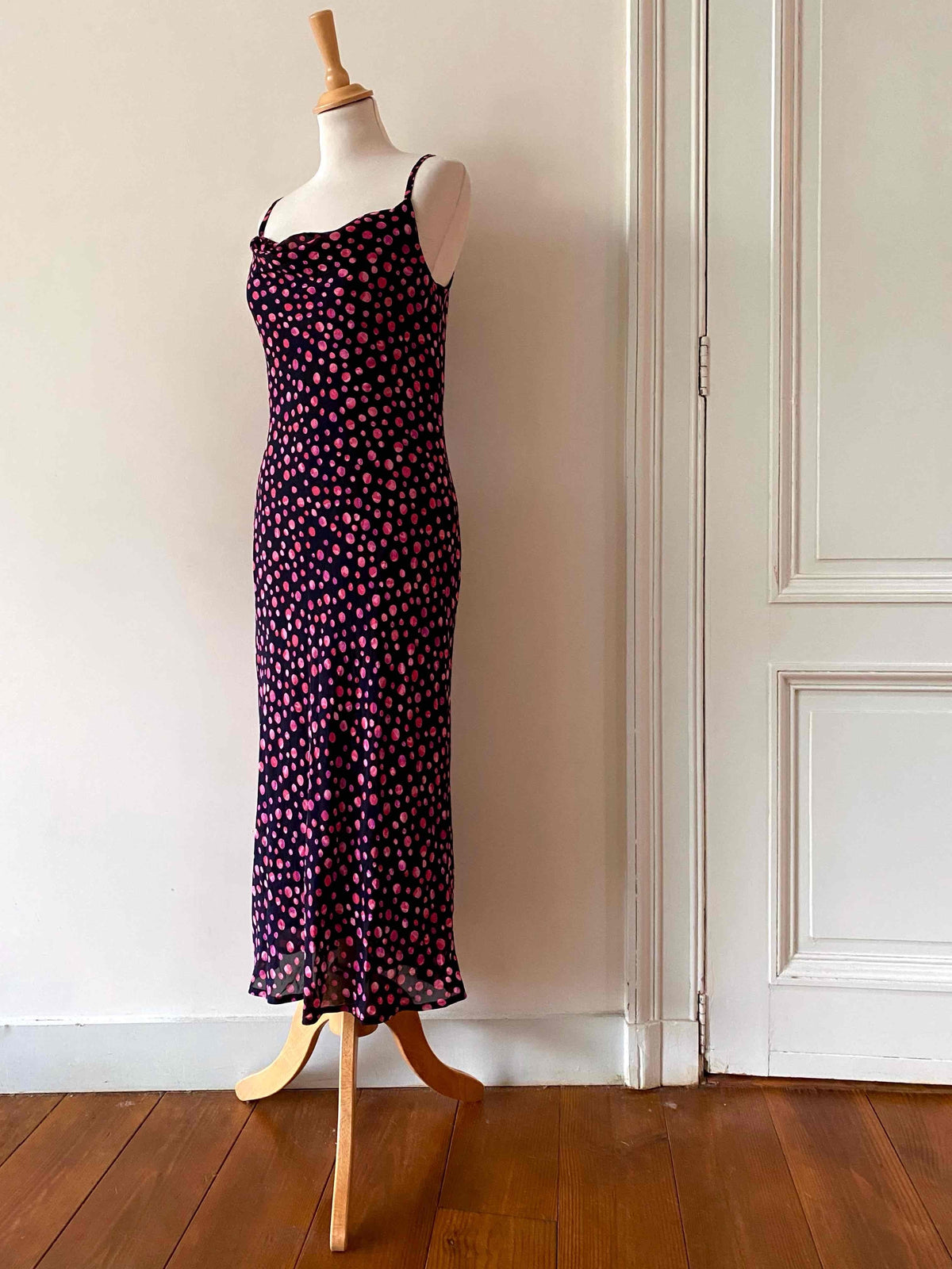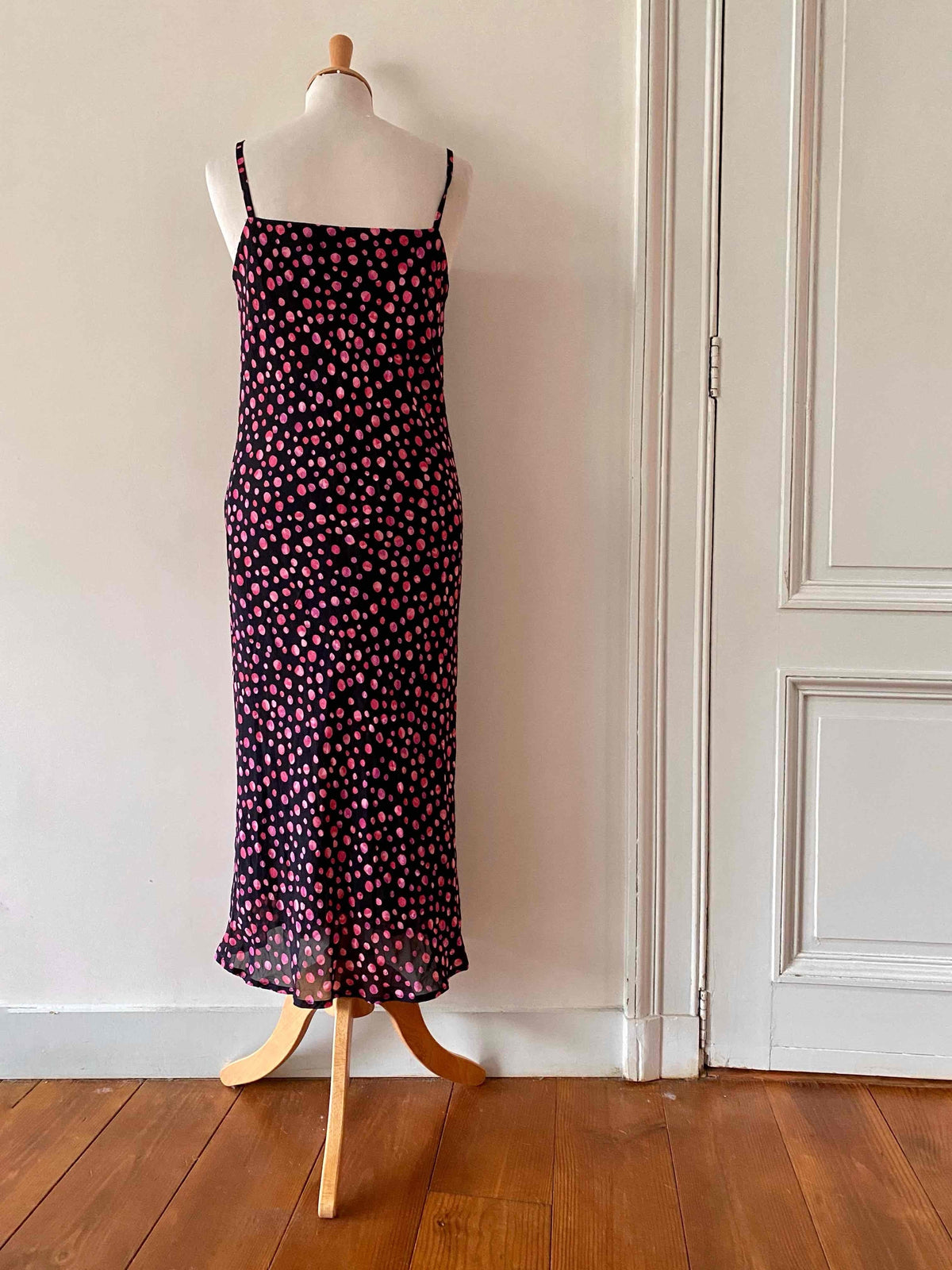 Prix unitaire parRobe longue à pois, en voile viscose noire imprimée pois roses fuschia dégradés violets et lilas, bretelles spaghettis, encolure benitier, forme fit and flare esprit sleep dress, fabriquée en France, taille 36 portée ici sur un mannequin T36, aisselles 43 cm.