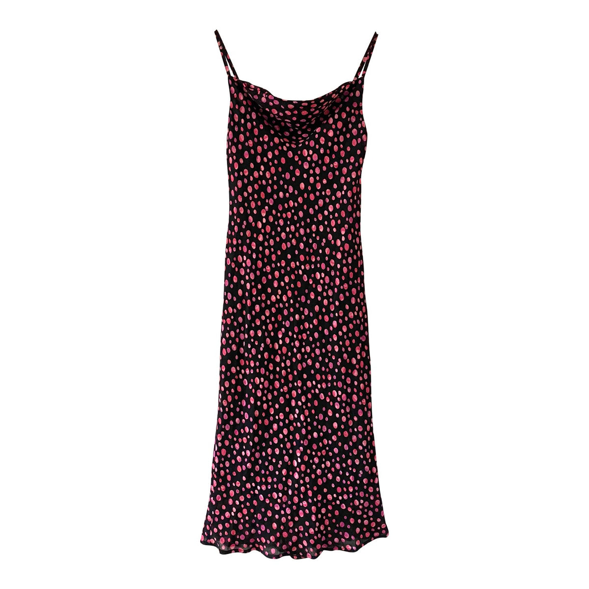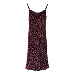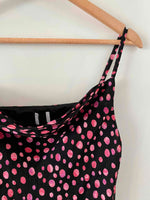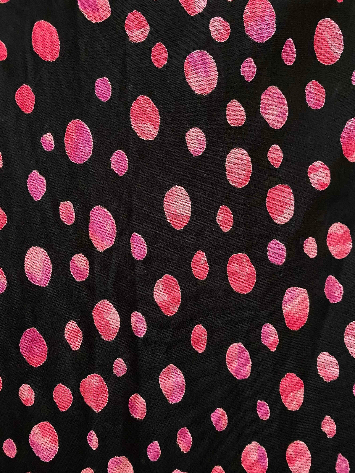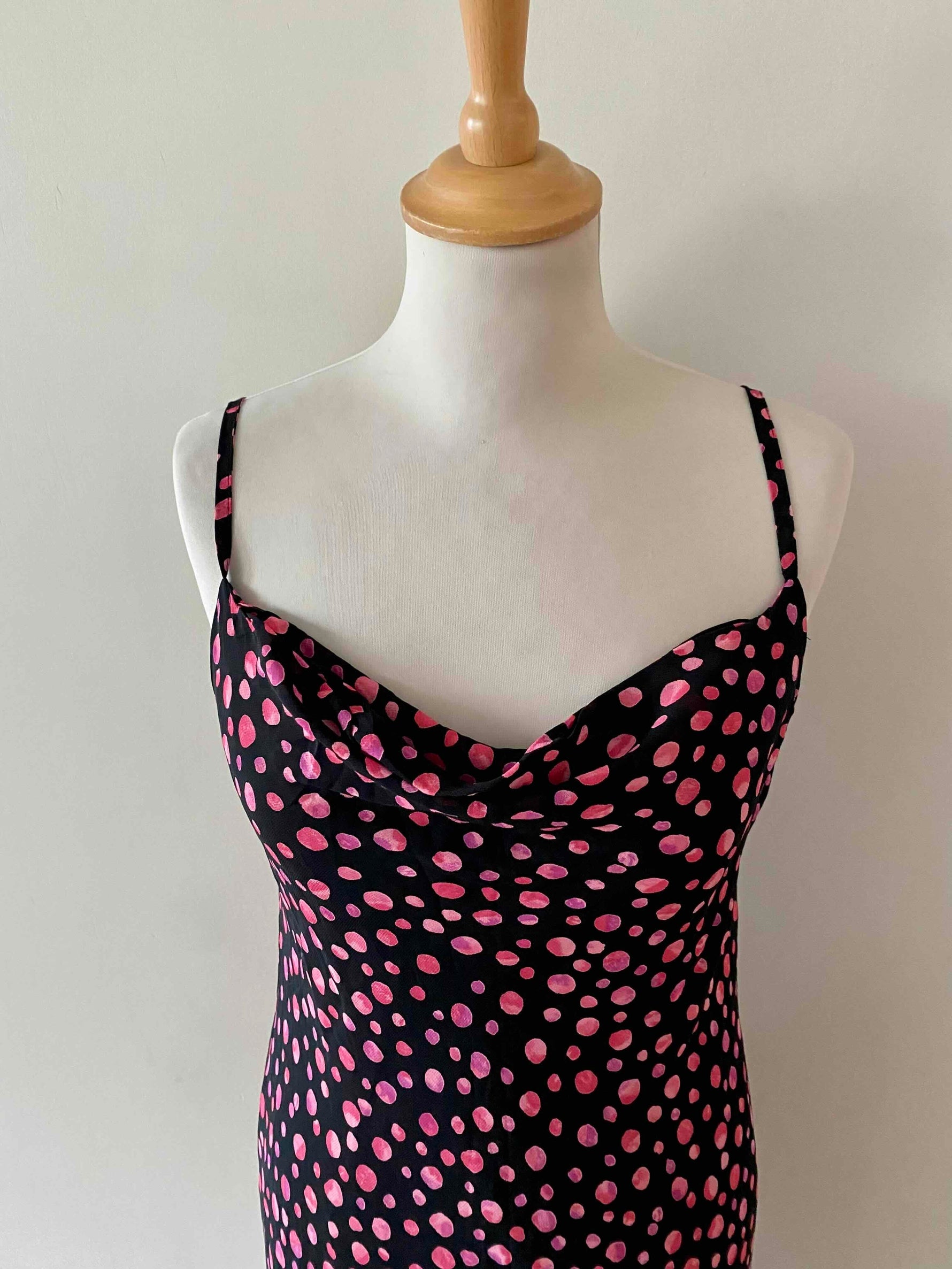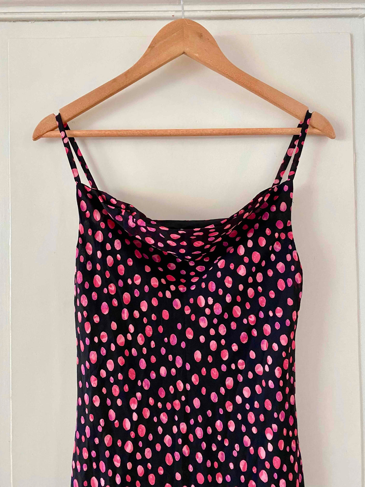 Prix unitaire parRobe longue à pois, en voile viscose noire imprimée pois roses fuschia dégradés violets et lilas, bretelles spaghettis, encolure benitier, forme fit and flare esprit sleep dress, fabriquée en France, taille 36 portée ici sur un mannequin T36, aisselles 43 cm.