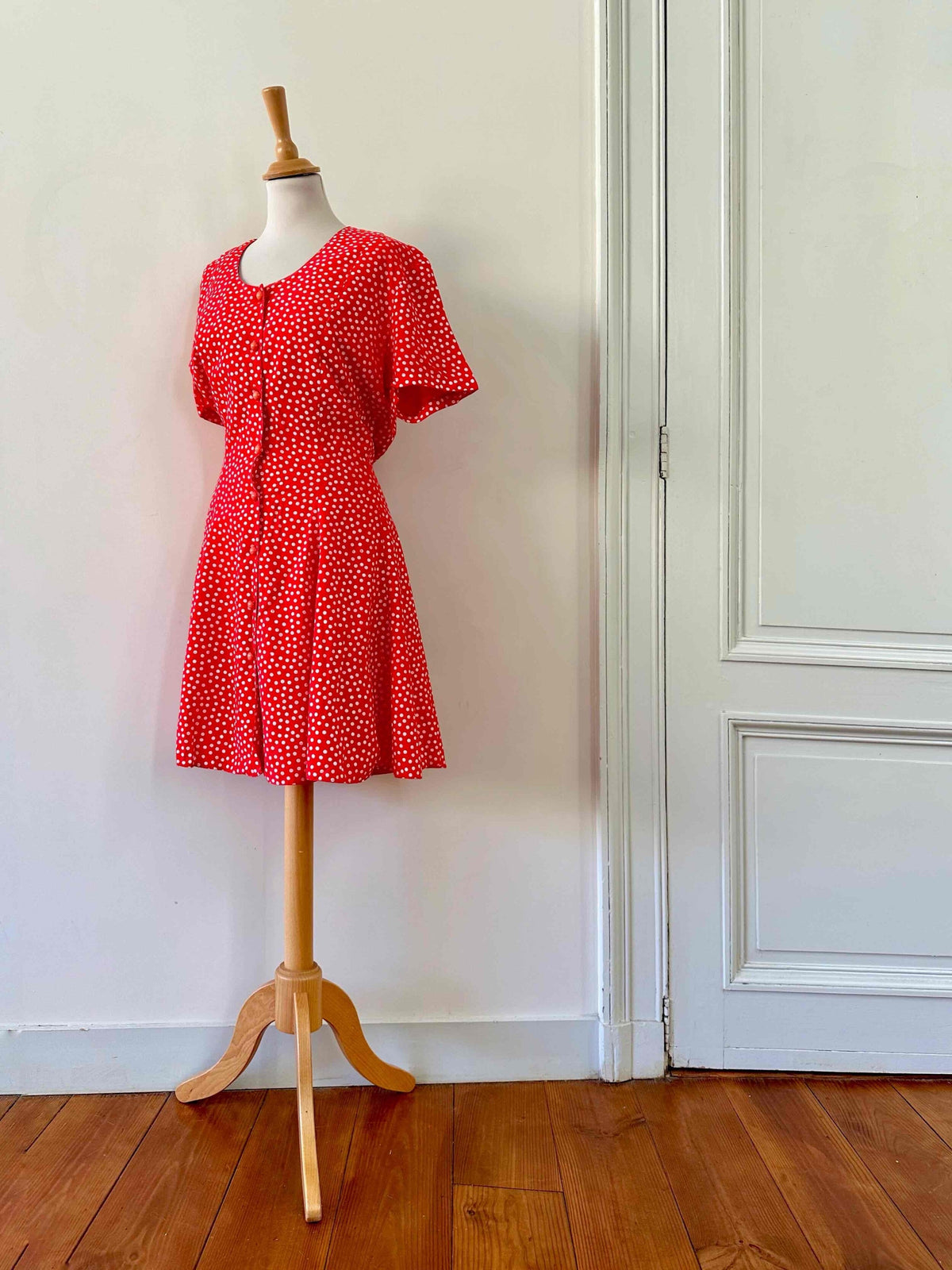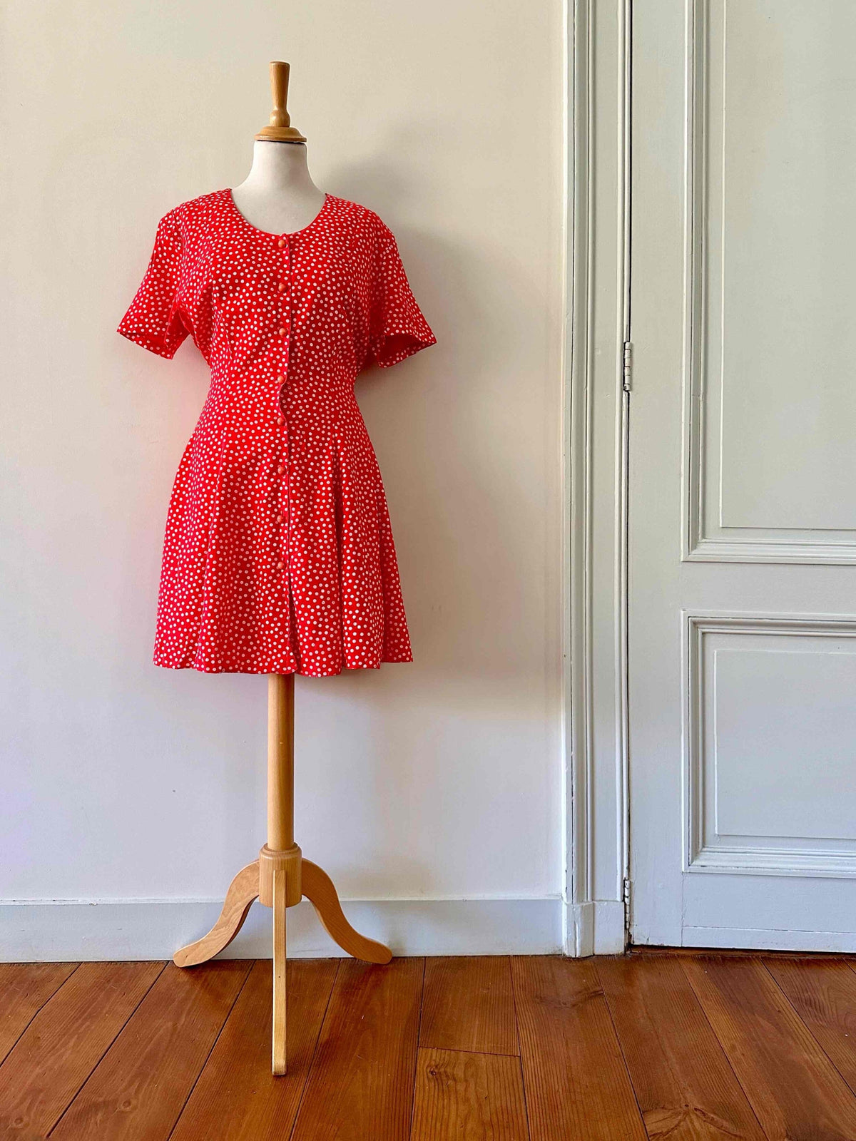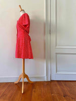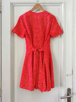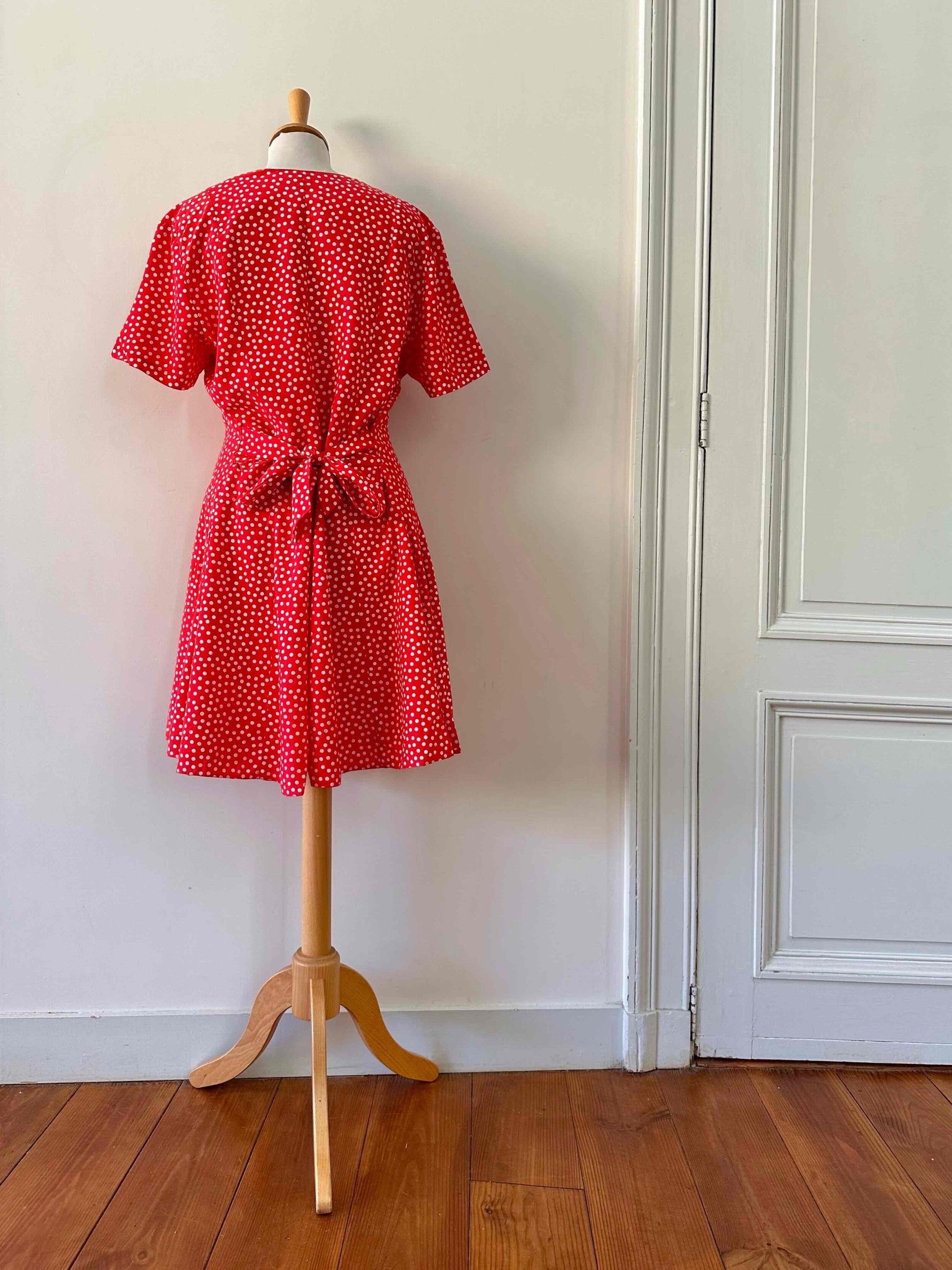 Prix unitaire parRobe boutonnée à pois, en viscose rouge vermillon imprimée pois blancs, boutonnée, large ceinture à nouer taille dos, fabriquée en France, taille 36 portée ici sur un mannequin T36, aisselles 44 cm.