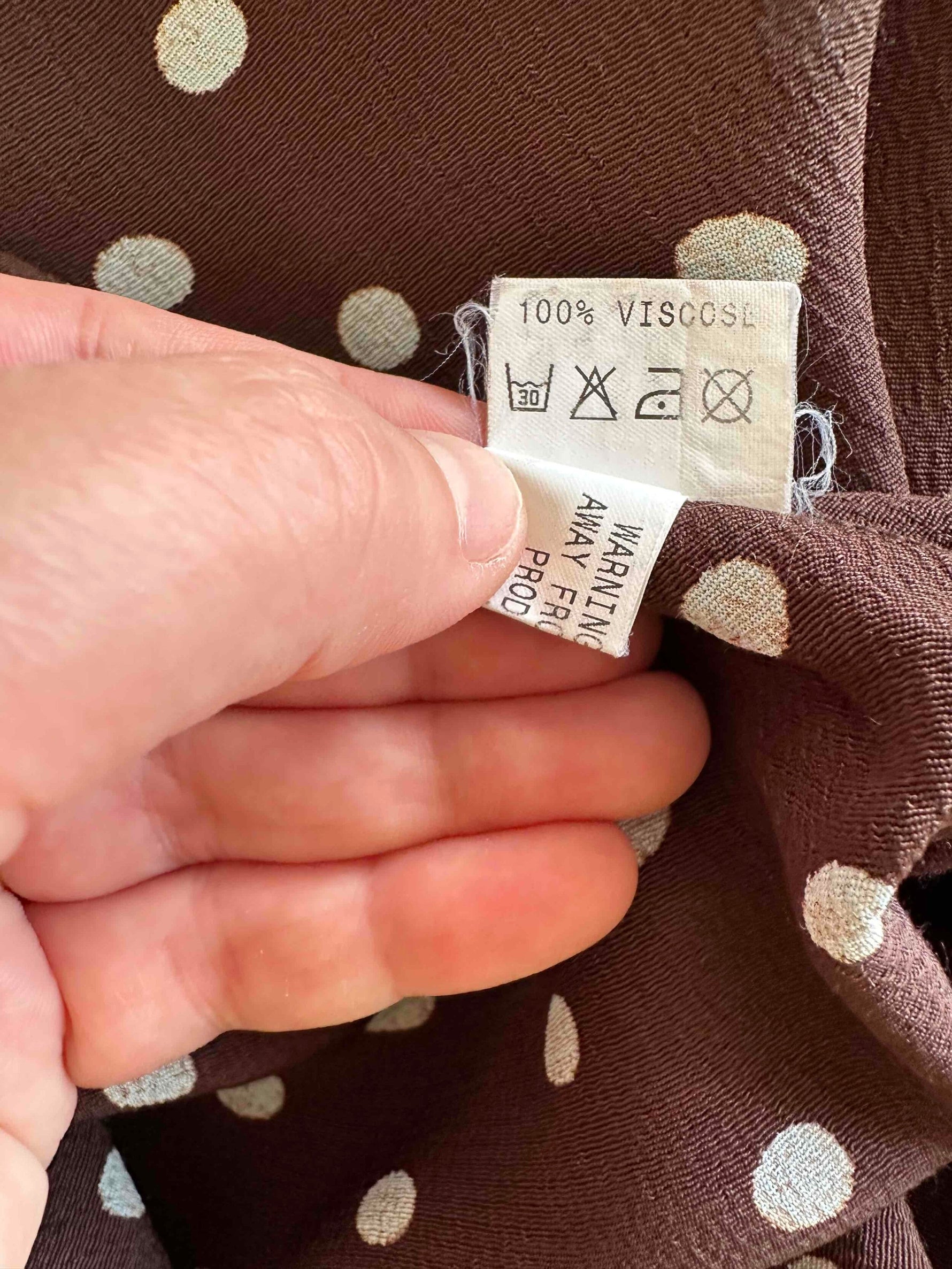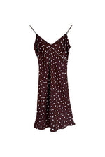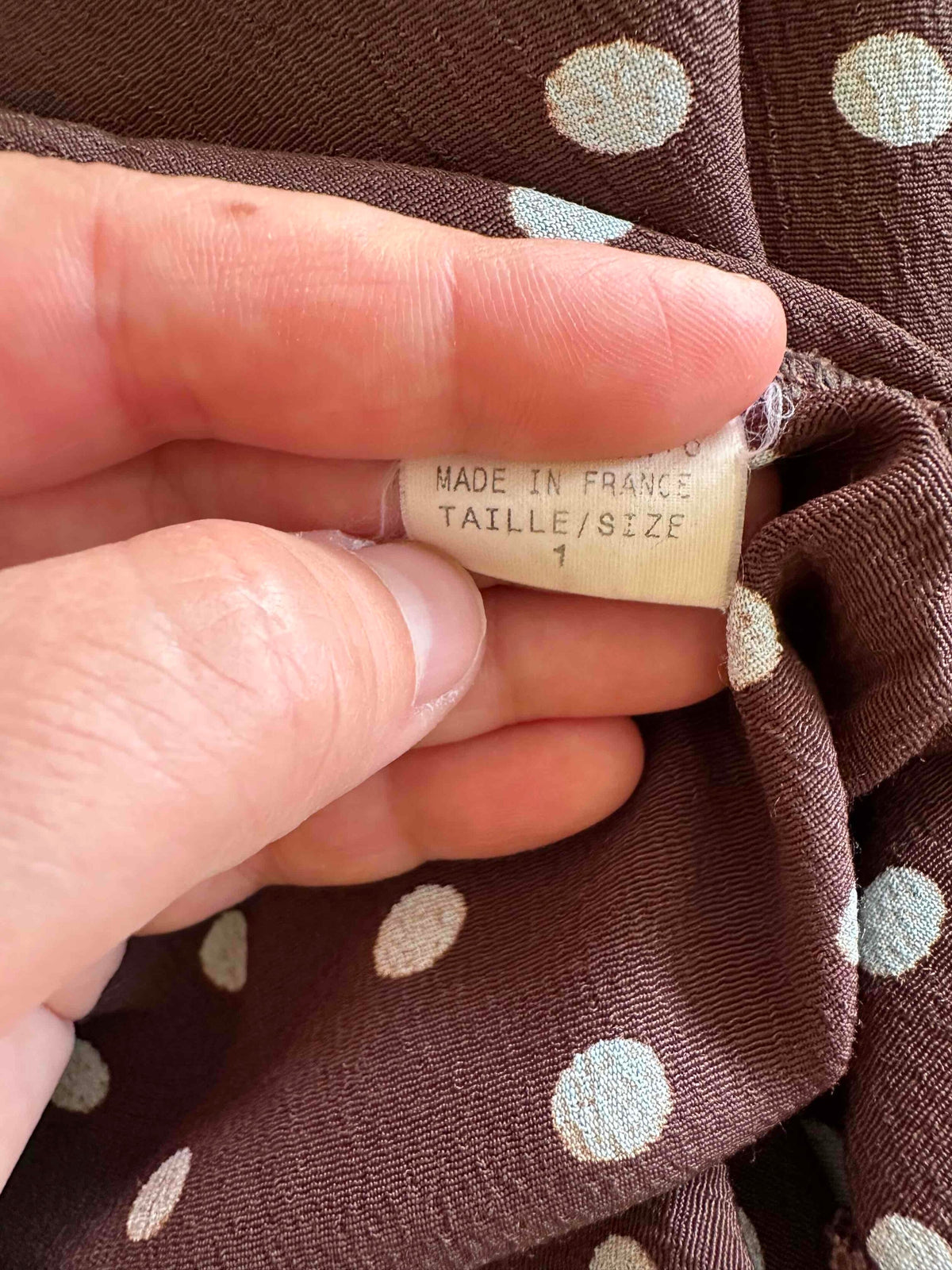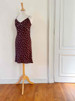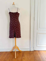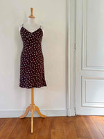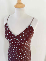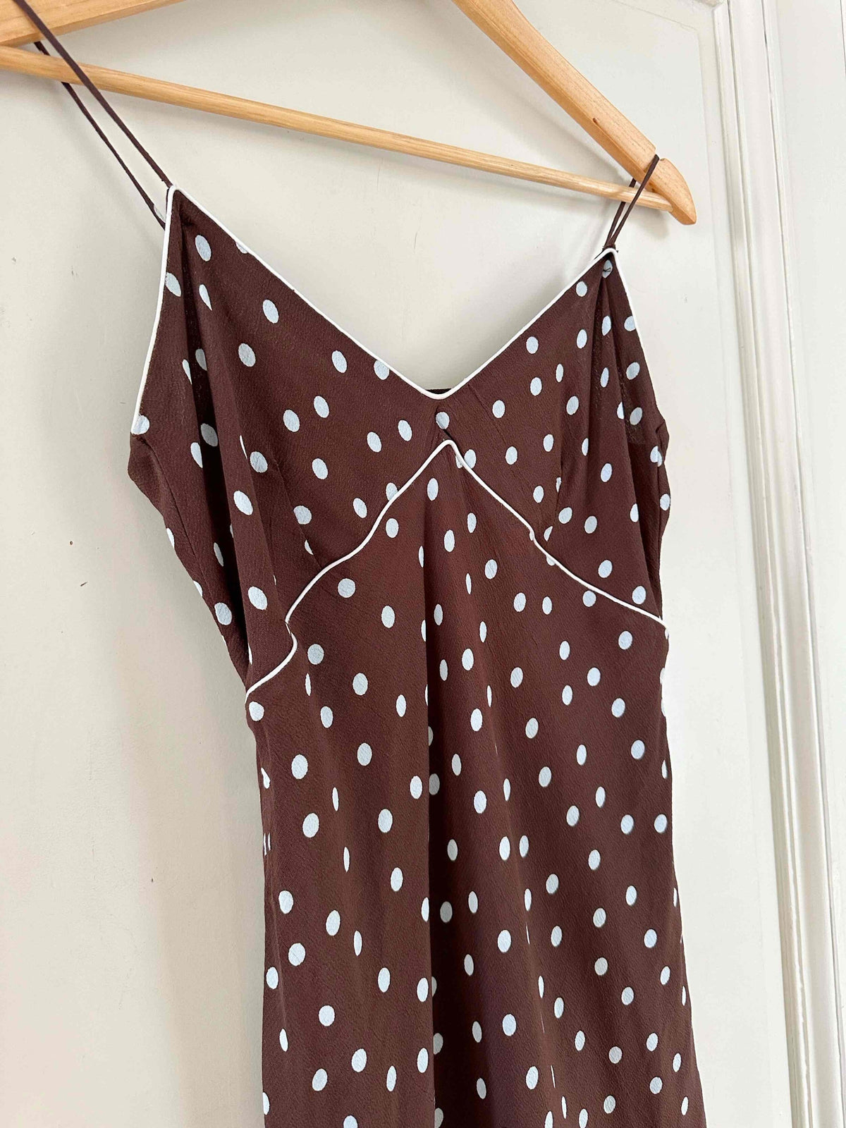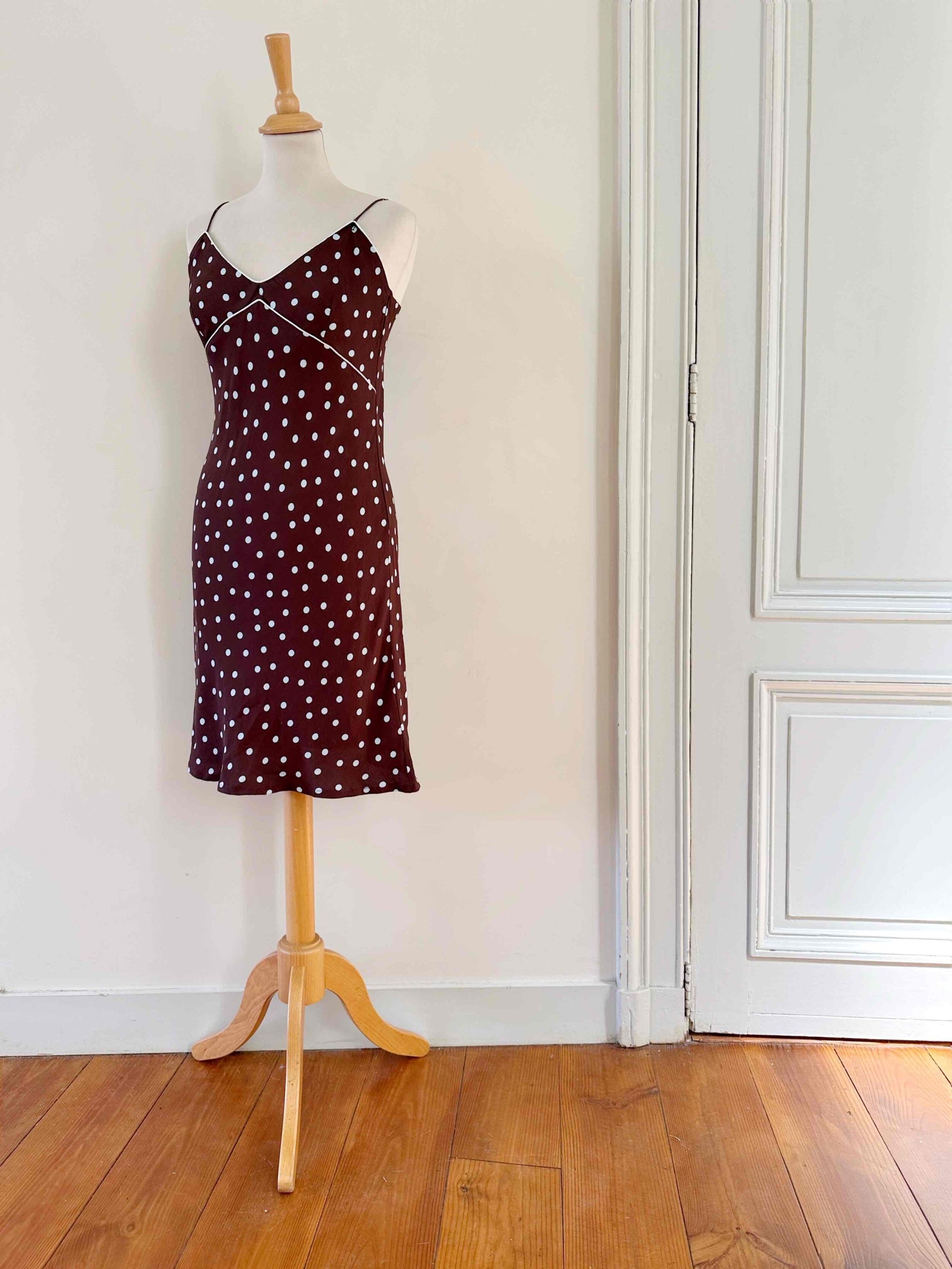 Prix unitaire parRobe nuisette à pois, en viscose chocolat imprimée pois bleu ciel, bretelles spaghettis, forme en biais, fabriquée en France, taille 36, portée ici sur un mannequin T36, aisselles 43 cm.