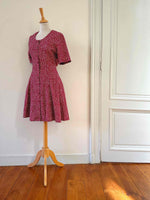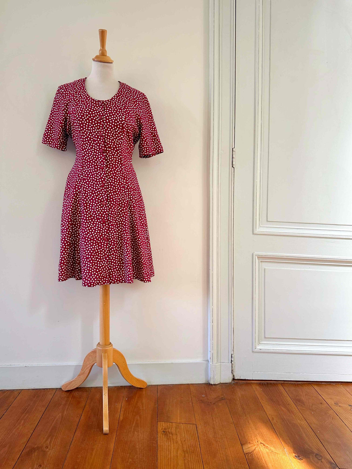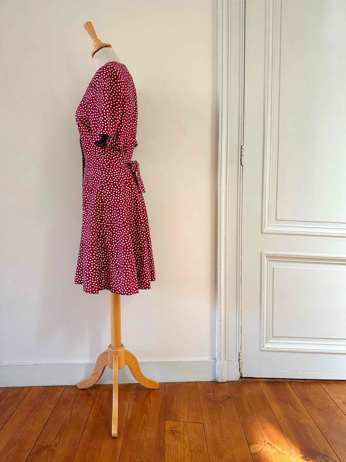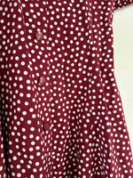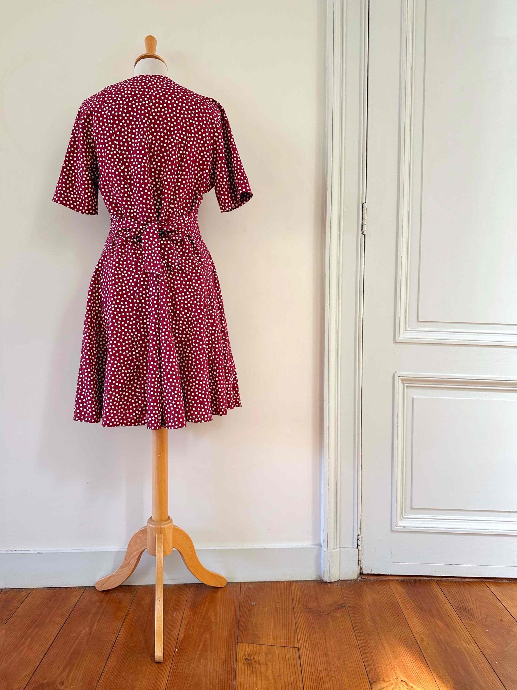Prix unitaire parRobe mini à pois, en viscose rouge bordeaux imprimée pois blancs, boutonnée, taille dos à nouer, fabriquée en France, taille 36, portée ici sur un mannequin T36, aisselles 44 cm.