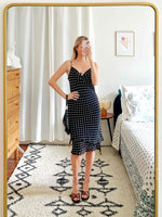Prix unitaire parRobe à pois, longueur midi, décolleté en V, bretelles non ajustables, volants en bas de la robe, fabriquée en France.