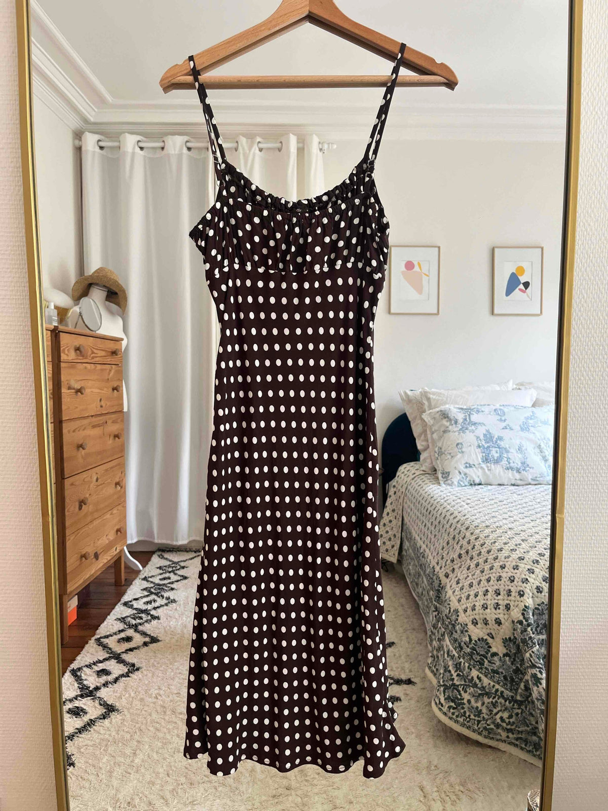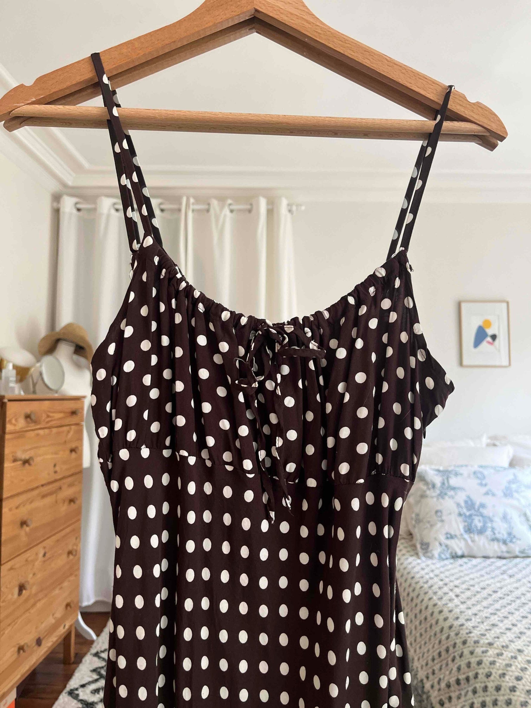 Prix unitaire parRobe marron à pois, décolleté et bretelles ajustables, tissu fluide et non transparent, portée ici sur une T36 pour 1,64 m