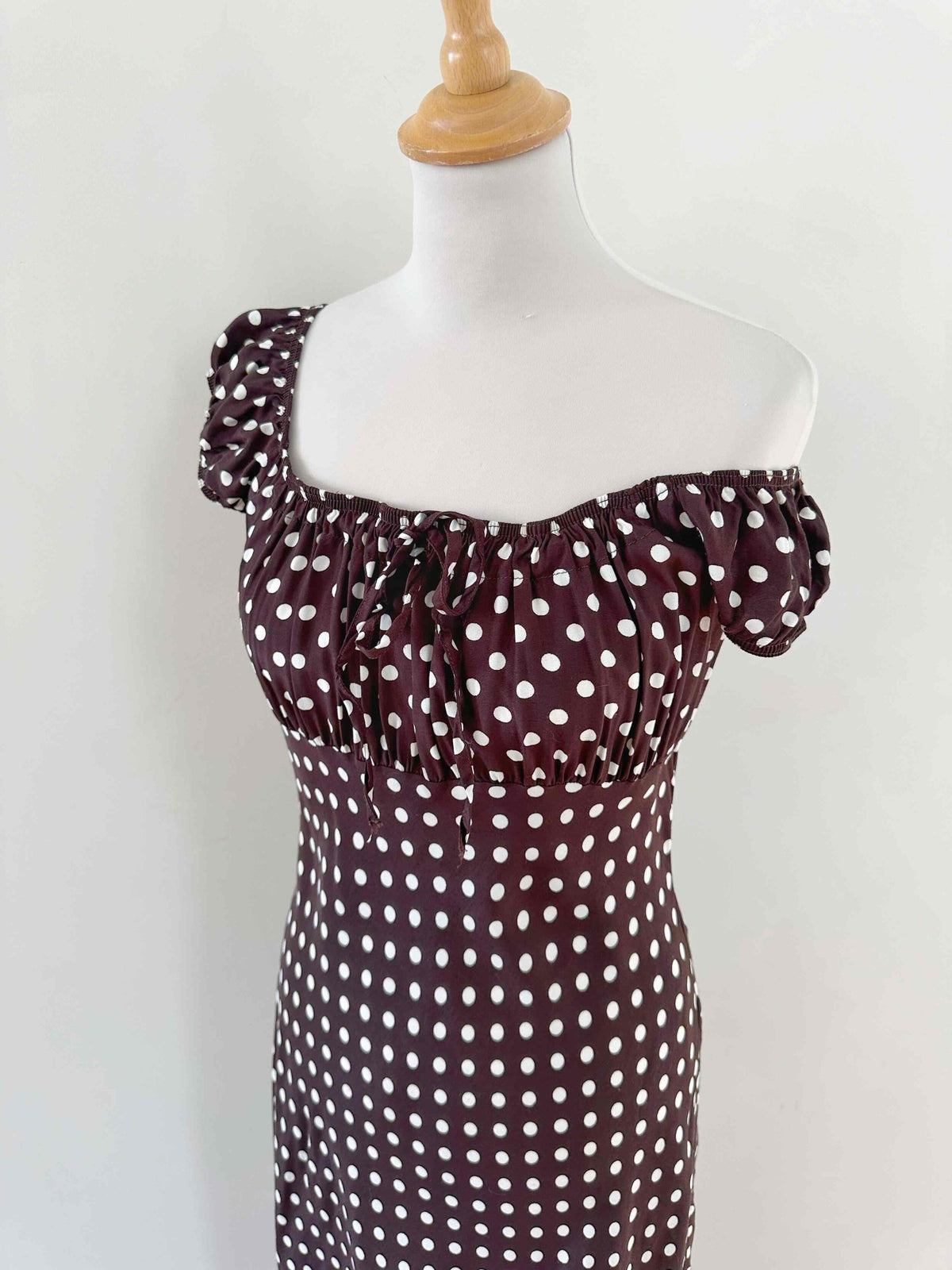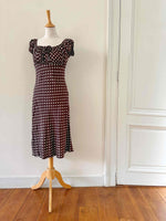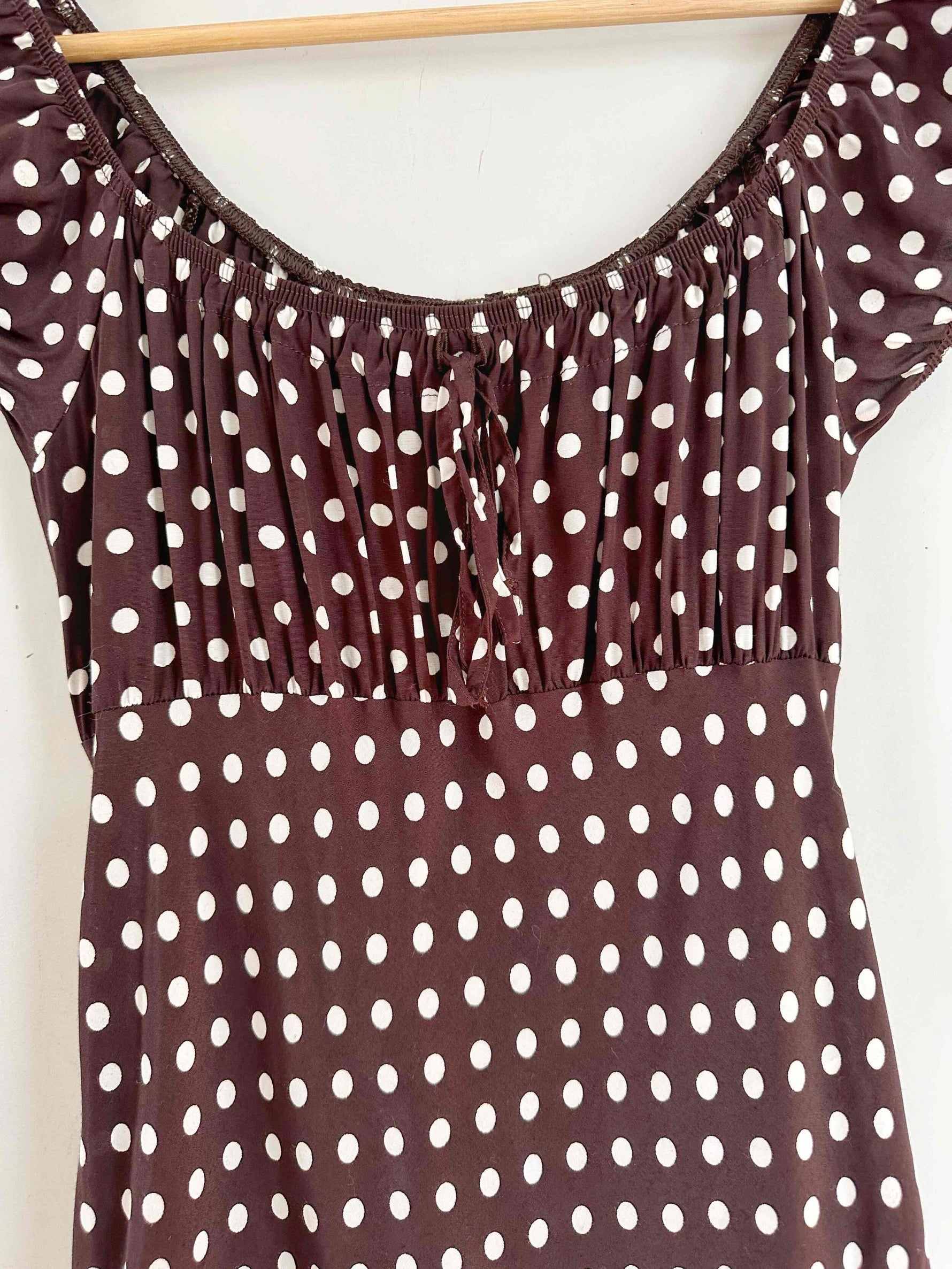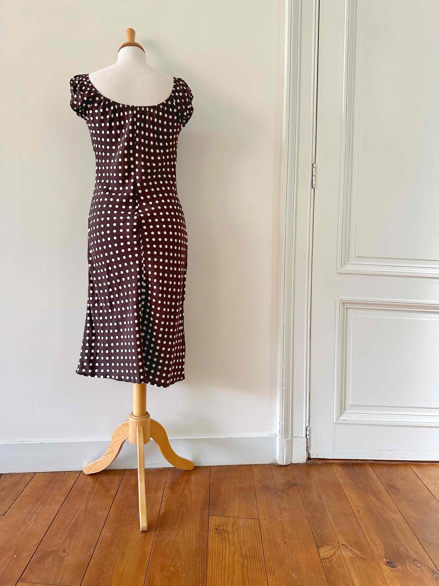 Prix unitaire parRobe à pois, en viscose chocolat à pois blancs, encolure elastiques et manches ballons à porter open shoulders, poitrine froncée à nouer, taillée en biais, fabriquée en France, taille 36 portée ici sur un mannequin T36, aisselles 43cm.