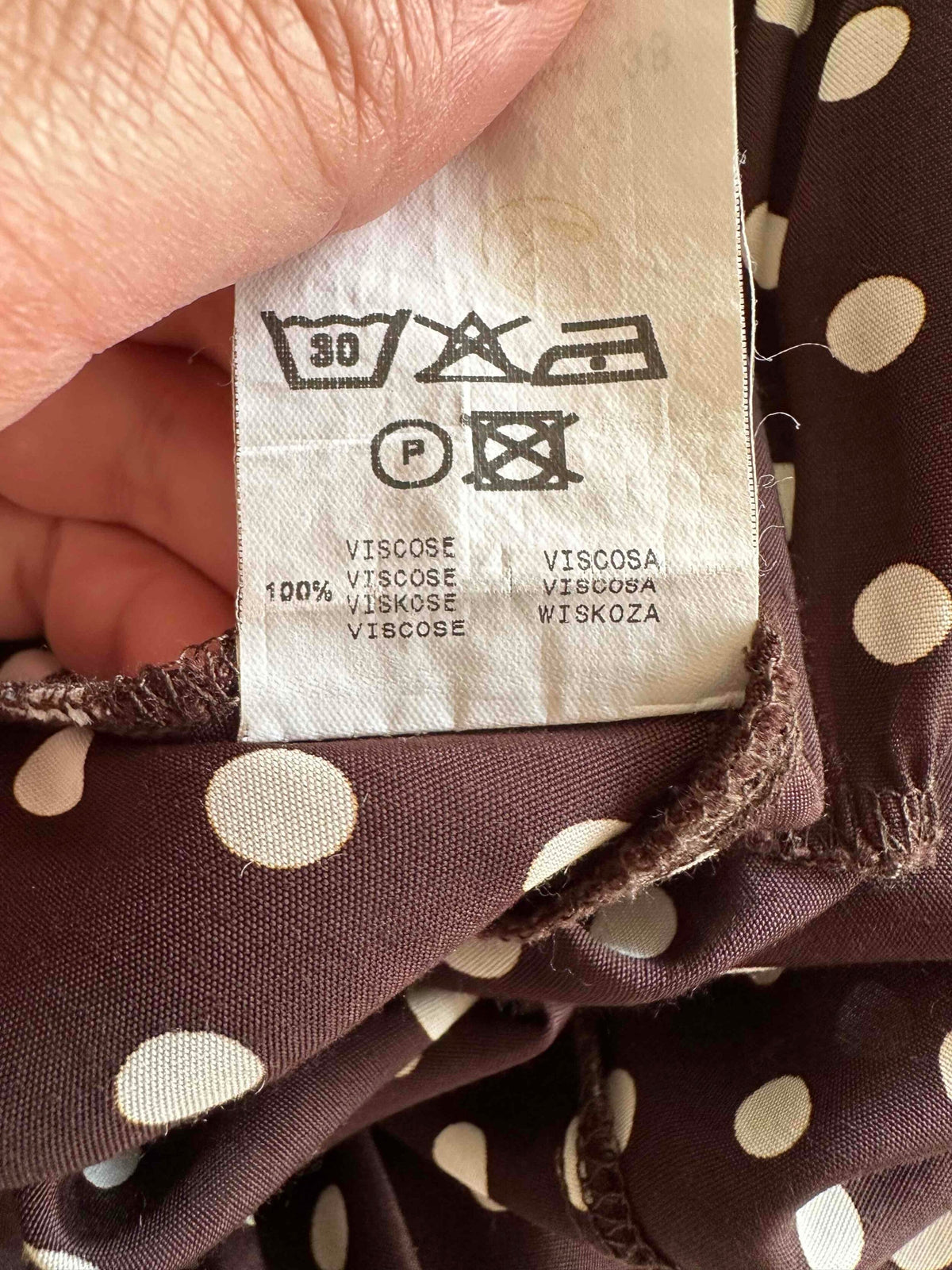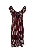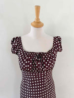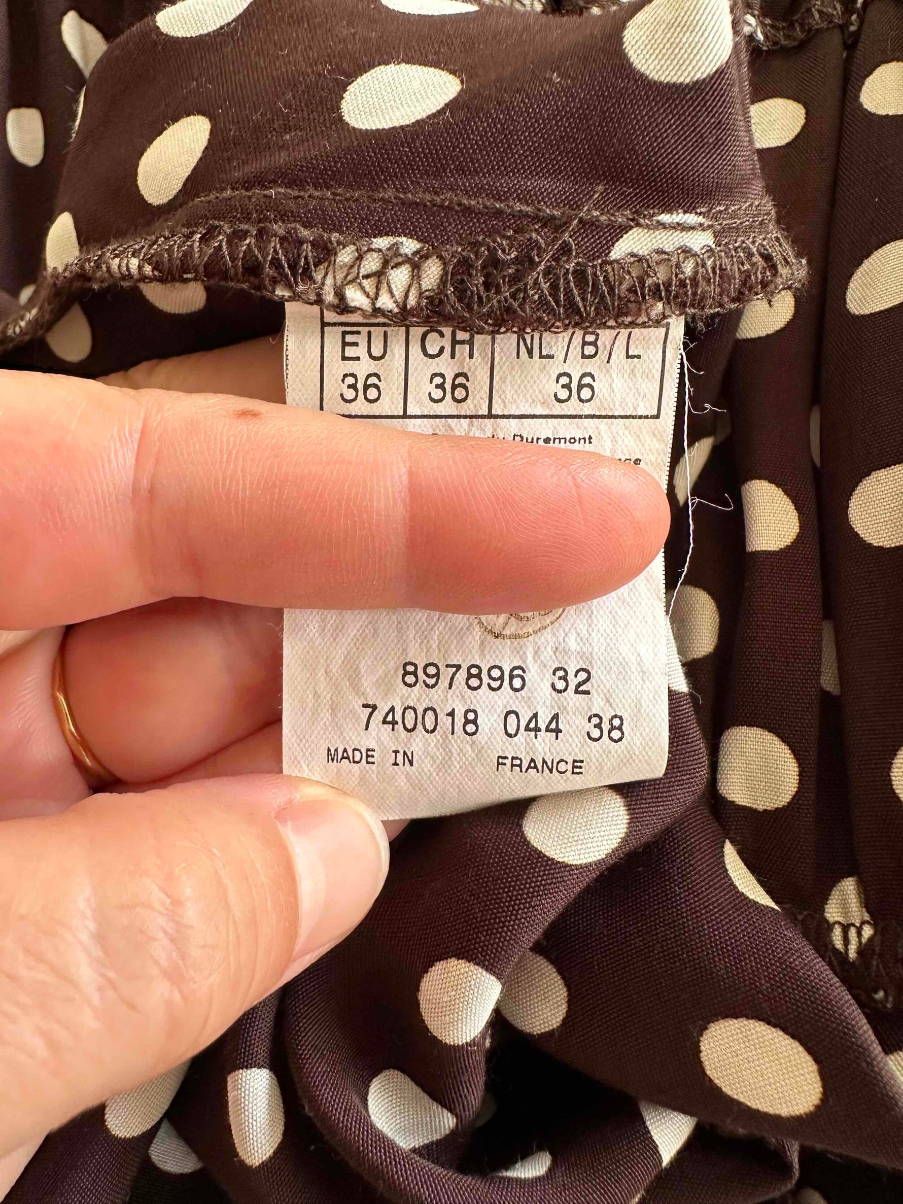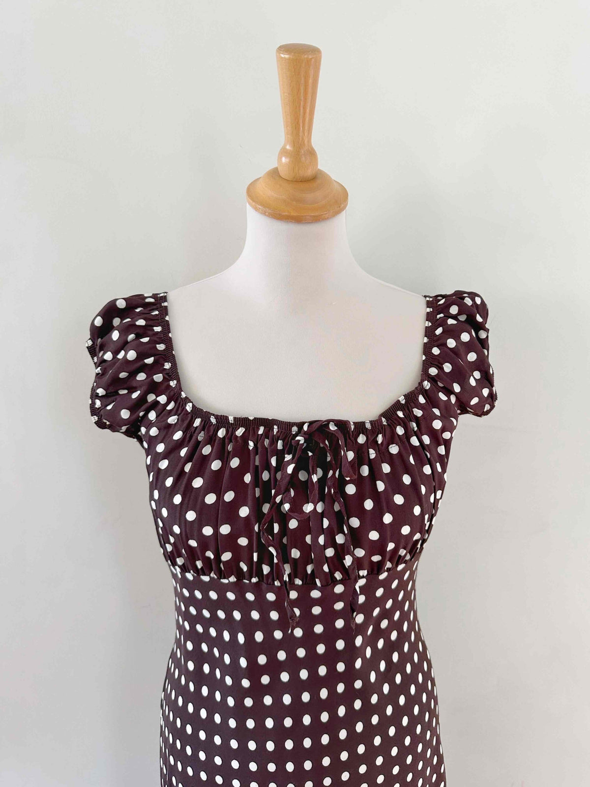 Prix unitaire parRobe à pois, en viscose chocolat à pois blancs, encolure elastiques et manches ballons à porter open shoulders, poitrine froncée à nouer, taillée en biais, fabriquée en France, taille 36 portée ici sur un mannequin T36, aisselles 43cm.