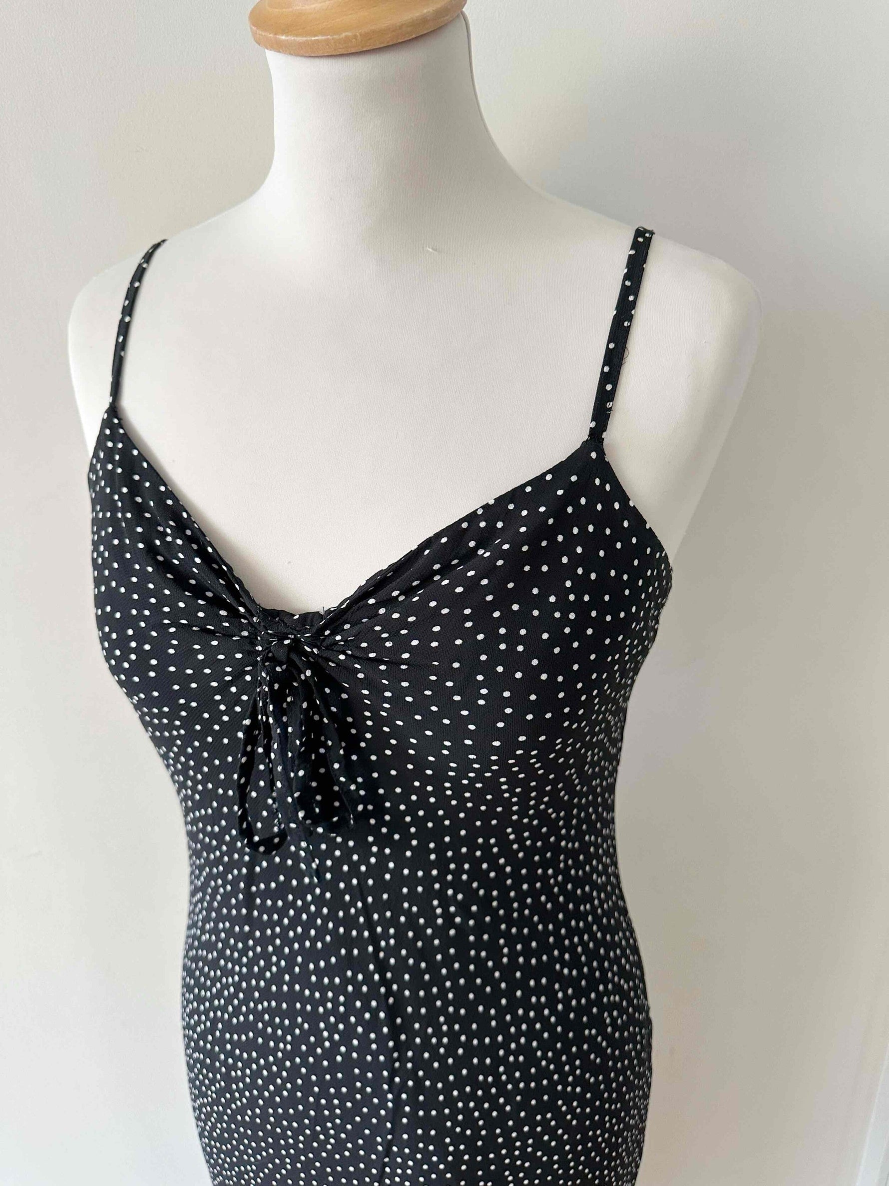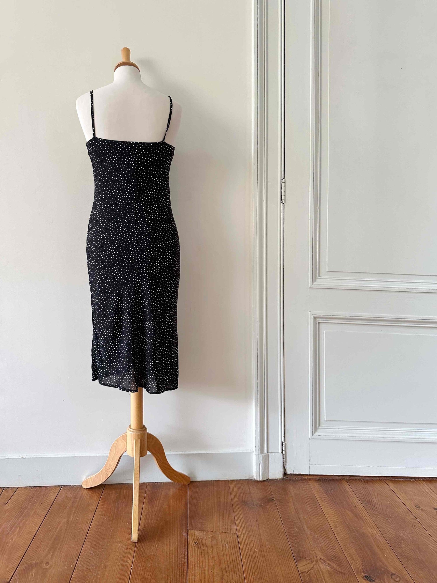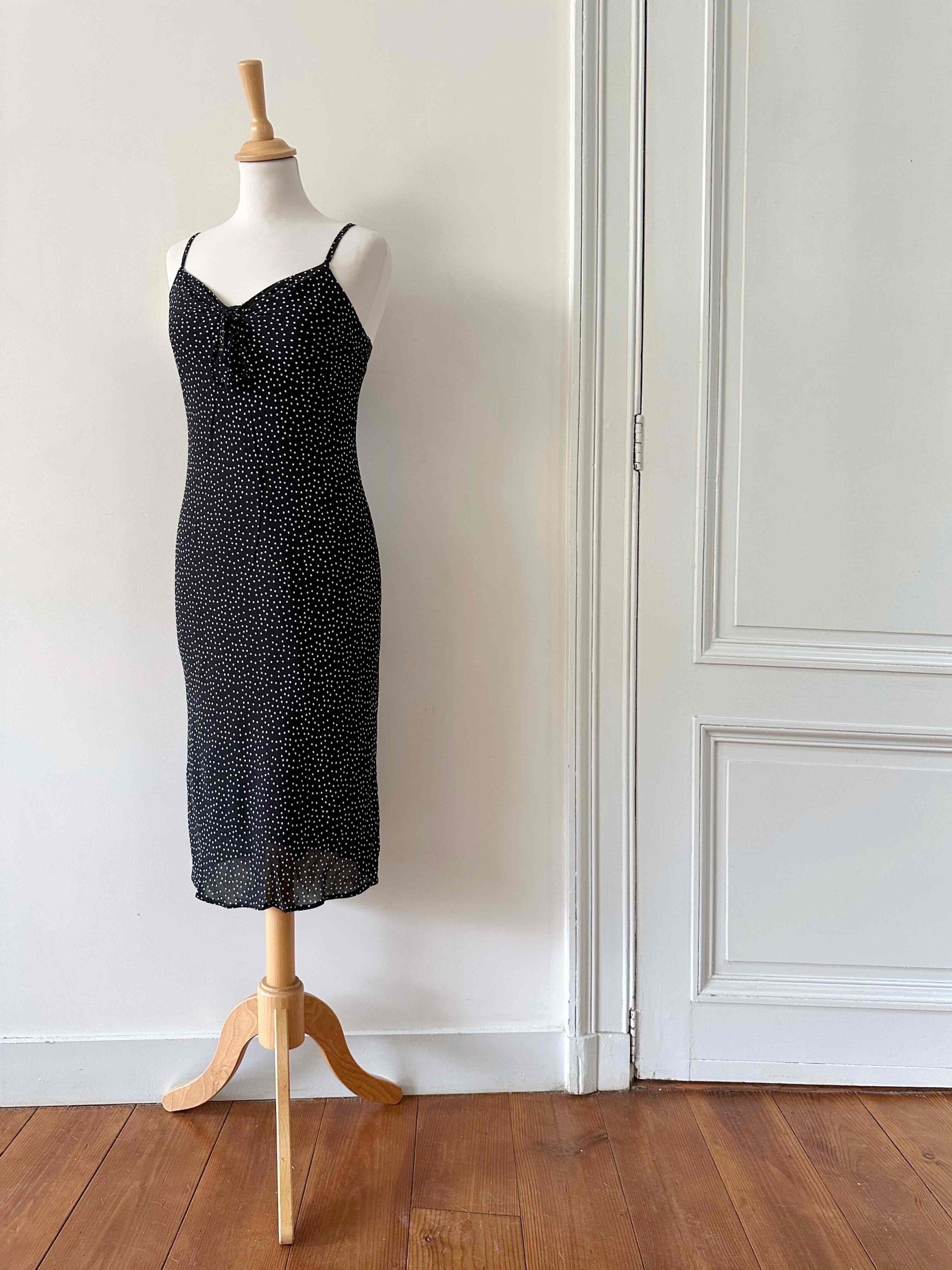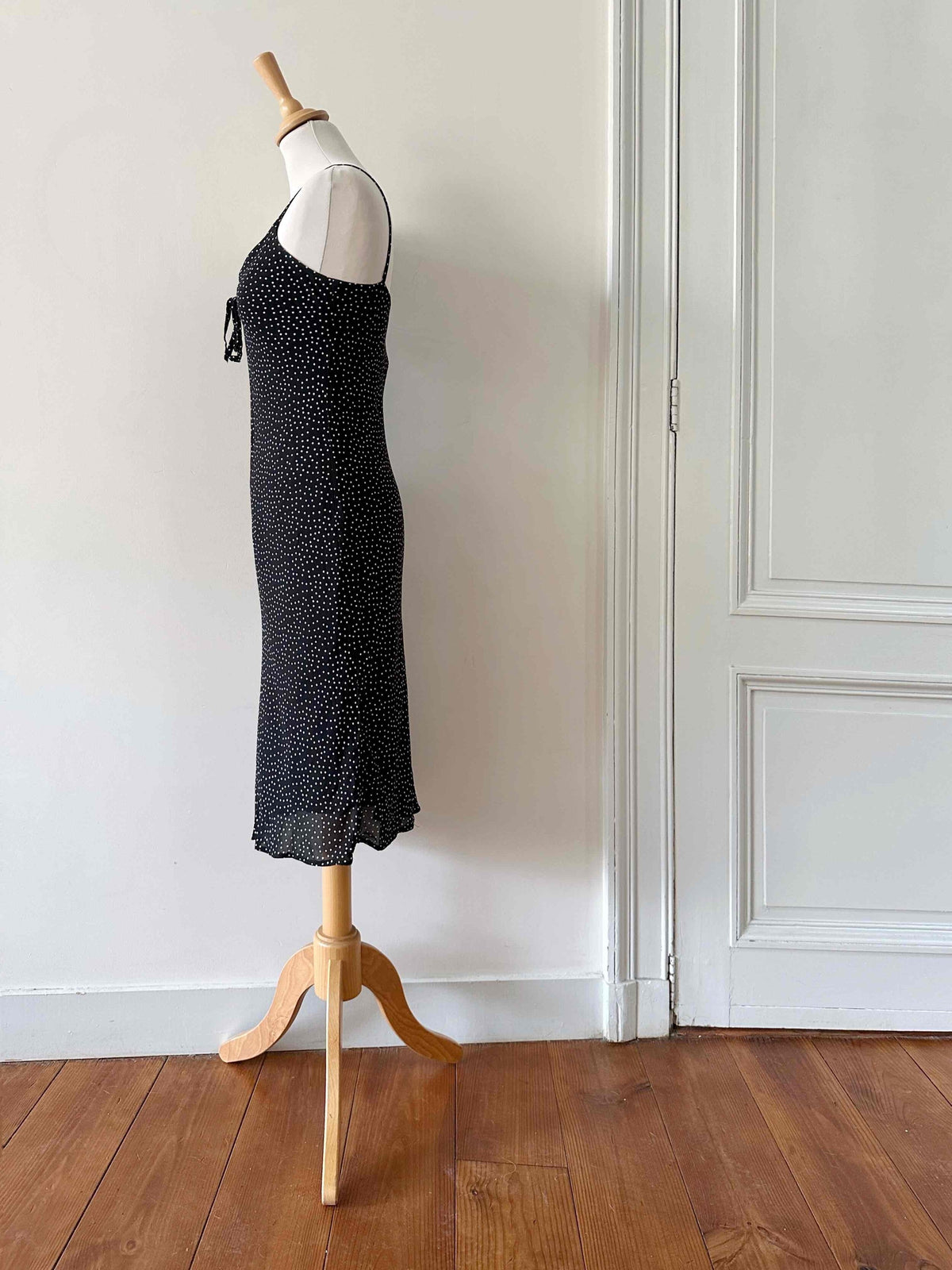 Prix unitaire parRobe nuisette à pois, en voile viscose doublée noire imprimée minis pois blancs, poitrine froncée à nouer, fines bretelles, taillée en biais, fabriquée en France, taille 36 portée ici sur un mannequin T36, aisselles 43 cm.