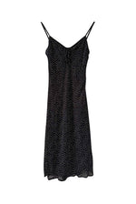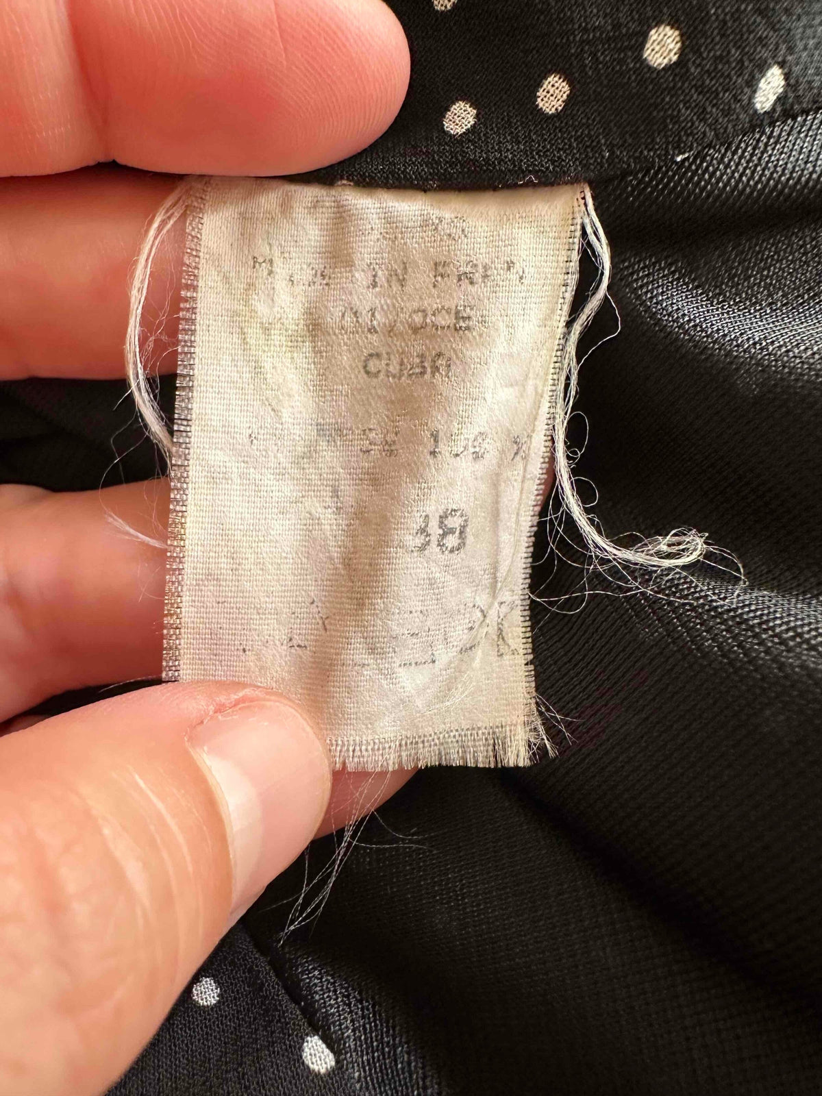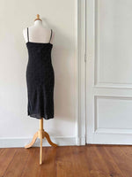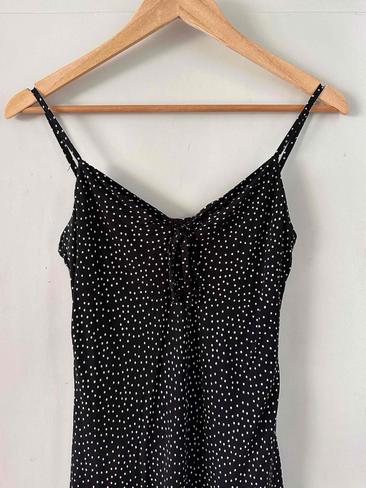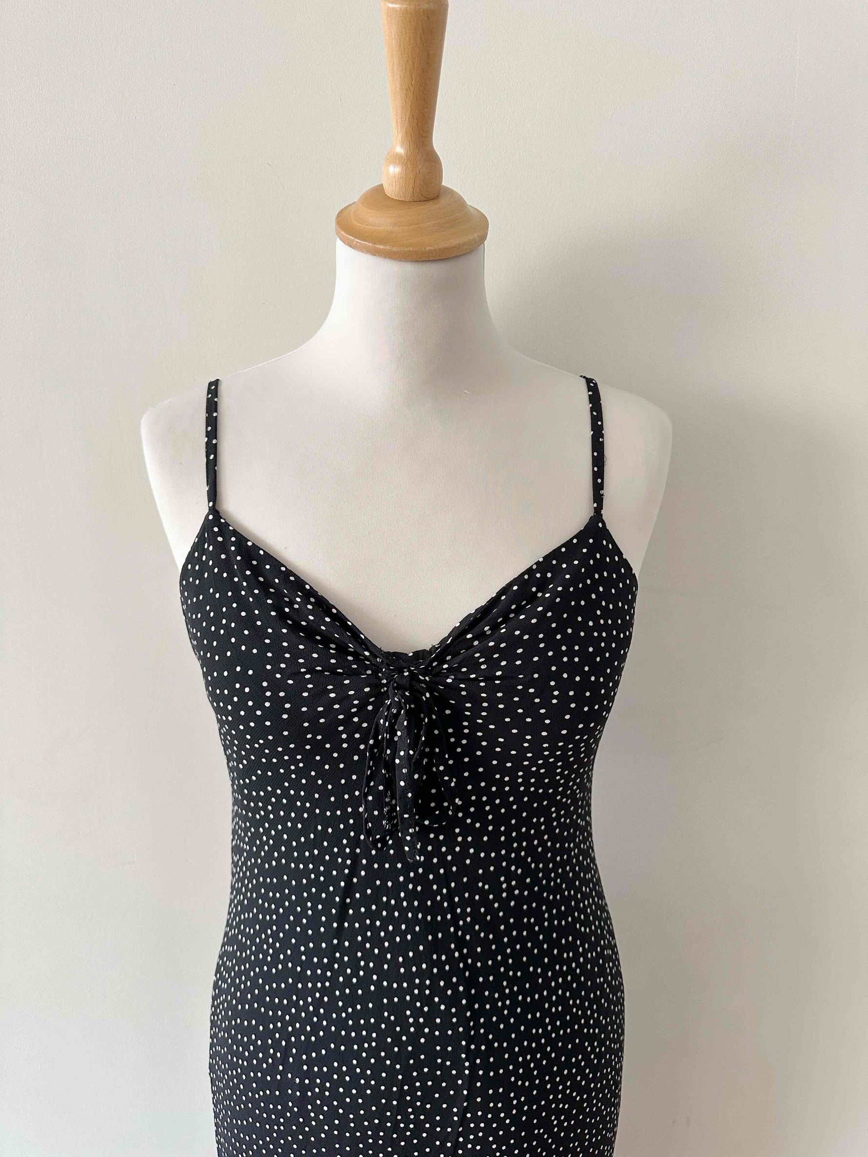 Prix unitaire parRobe nuisette à pois, en voile viscose doublée noire imprimée minis pois blancs, poitrine froncée à nouer, fines bretelles, taillée en biais, fabriquée en France, taille 36 portée ici sur un mannequin T36, aisselles 43 cm.