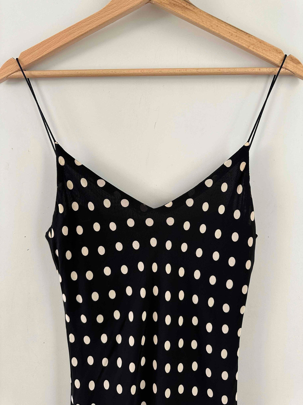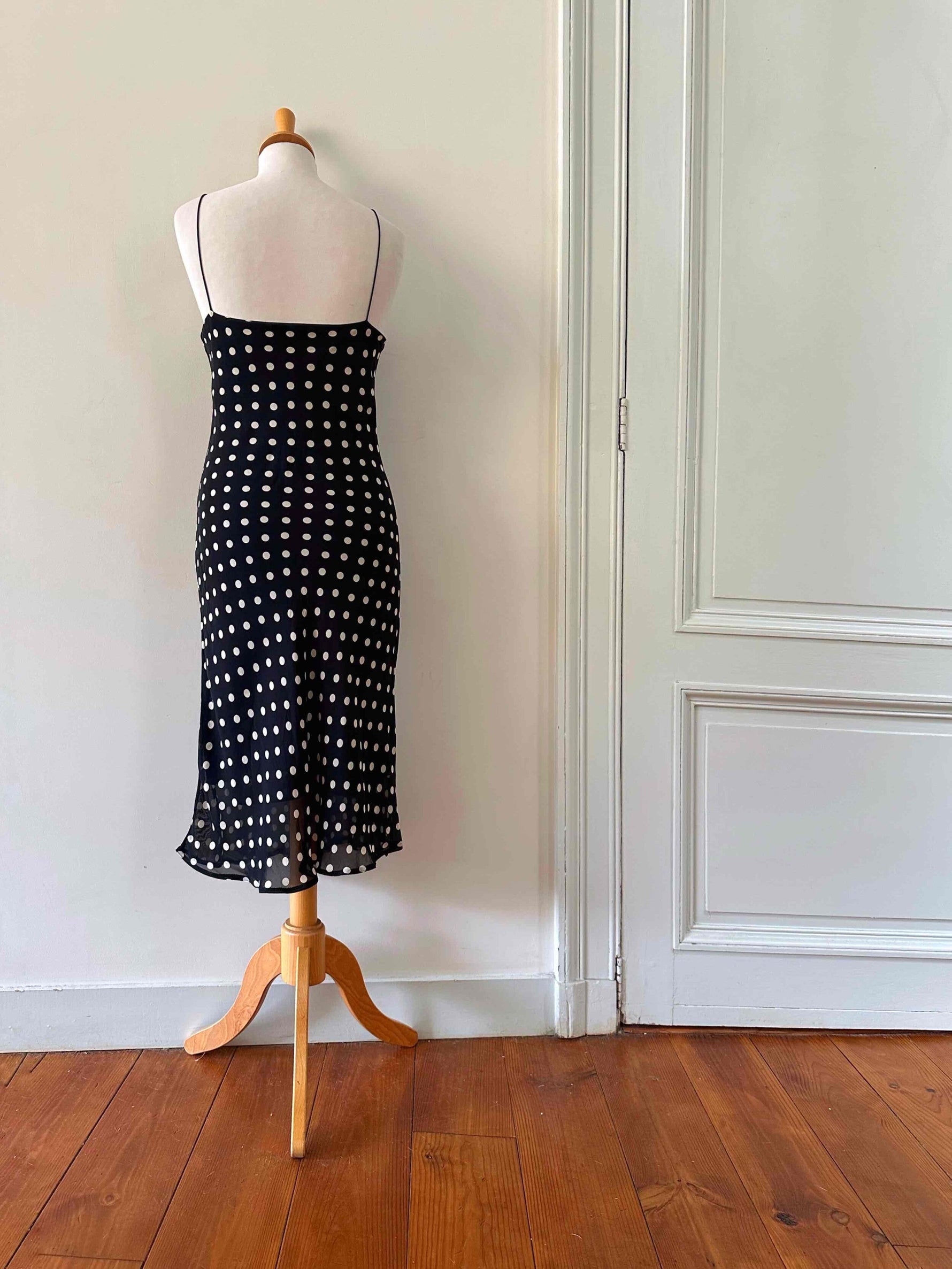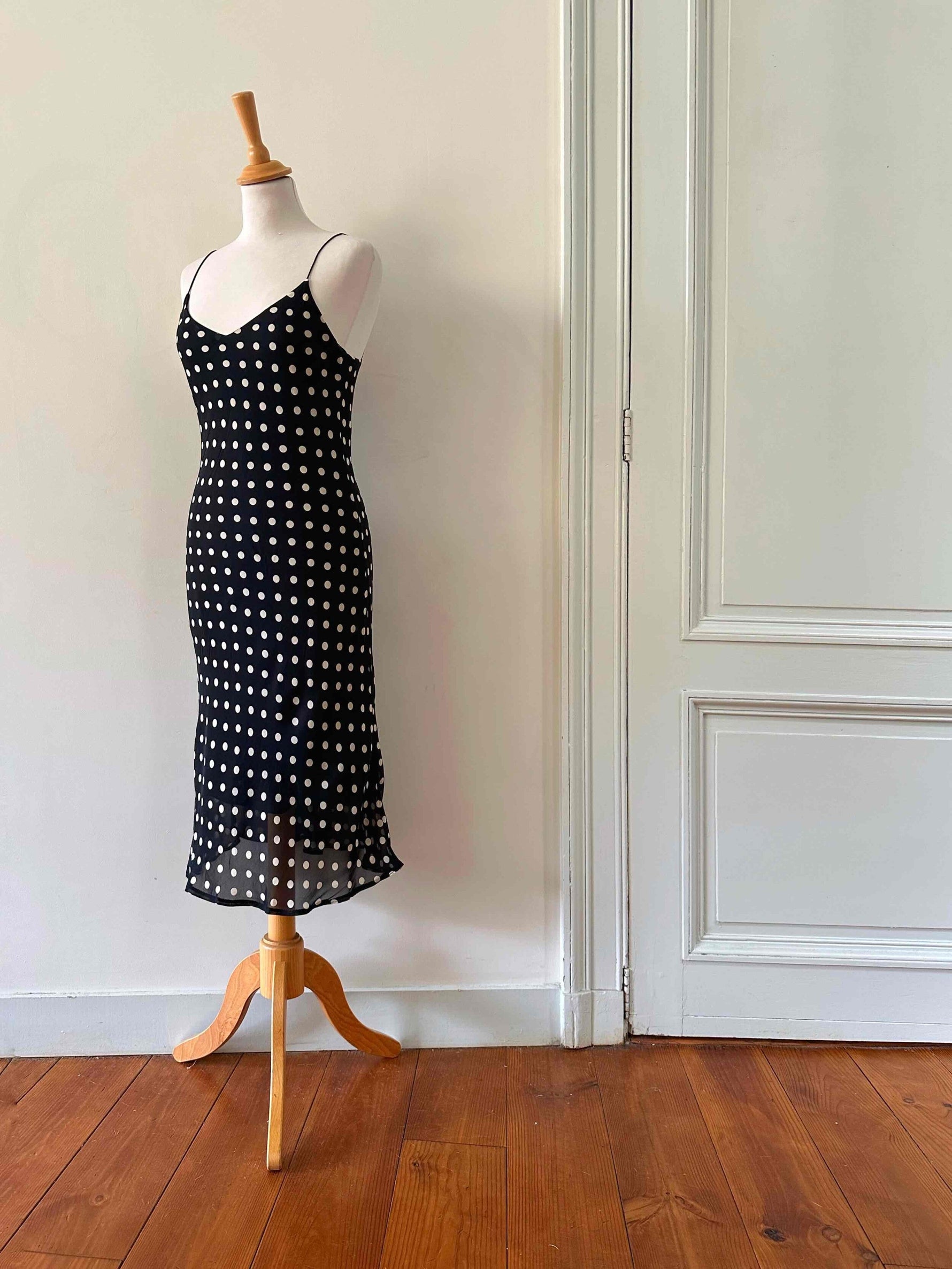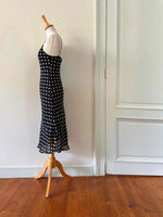 Prix unitaire parRobe nuisette à pois, en voile viscose doublée noire à pois blancs écrus, bretelles spaghettis satin noir, col v, taillée en biais, fabriquée en France, taille 36 portée ici sur un mannequin T36, aisselles 43cm.