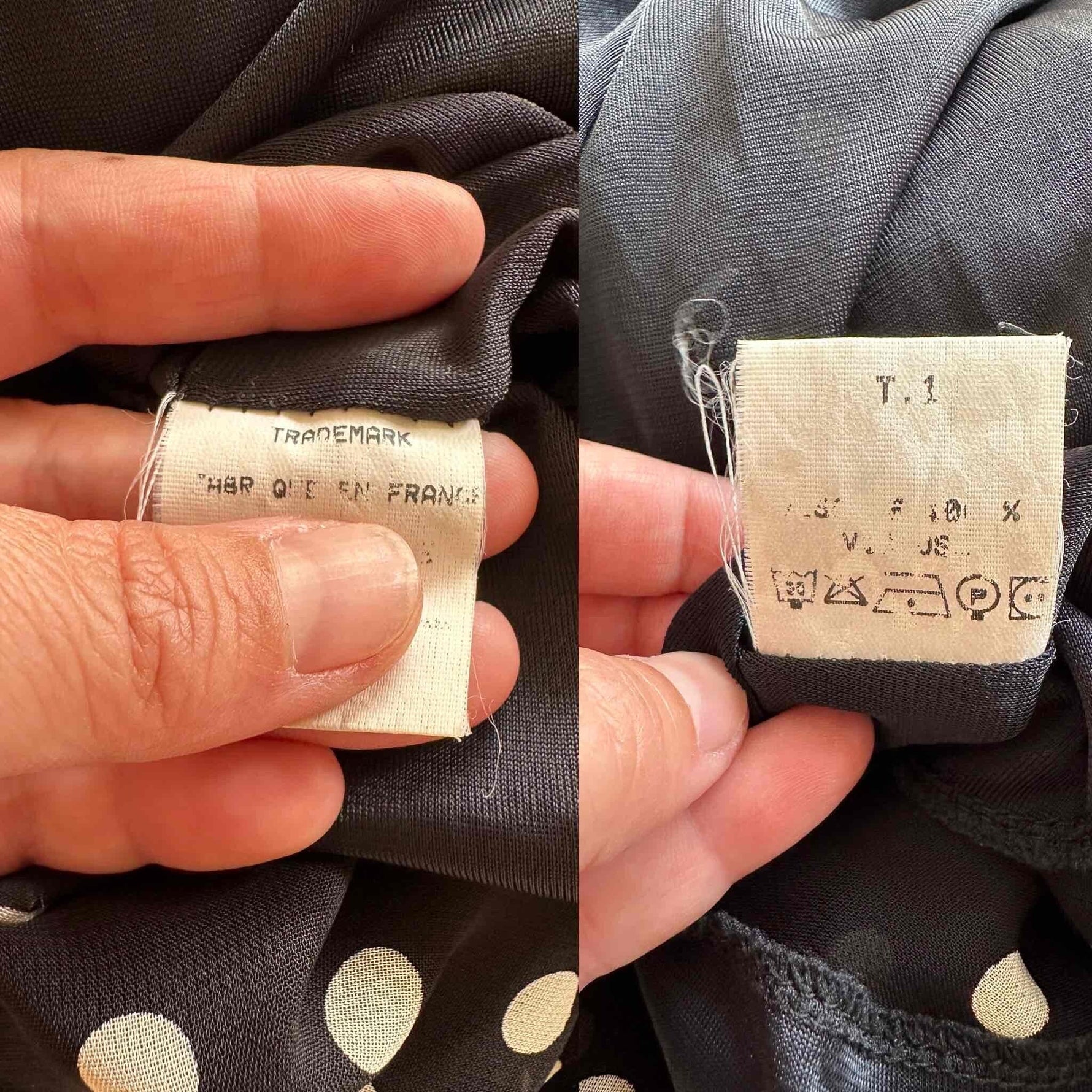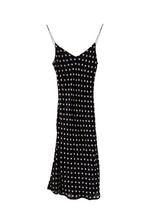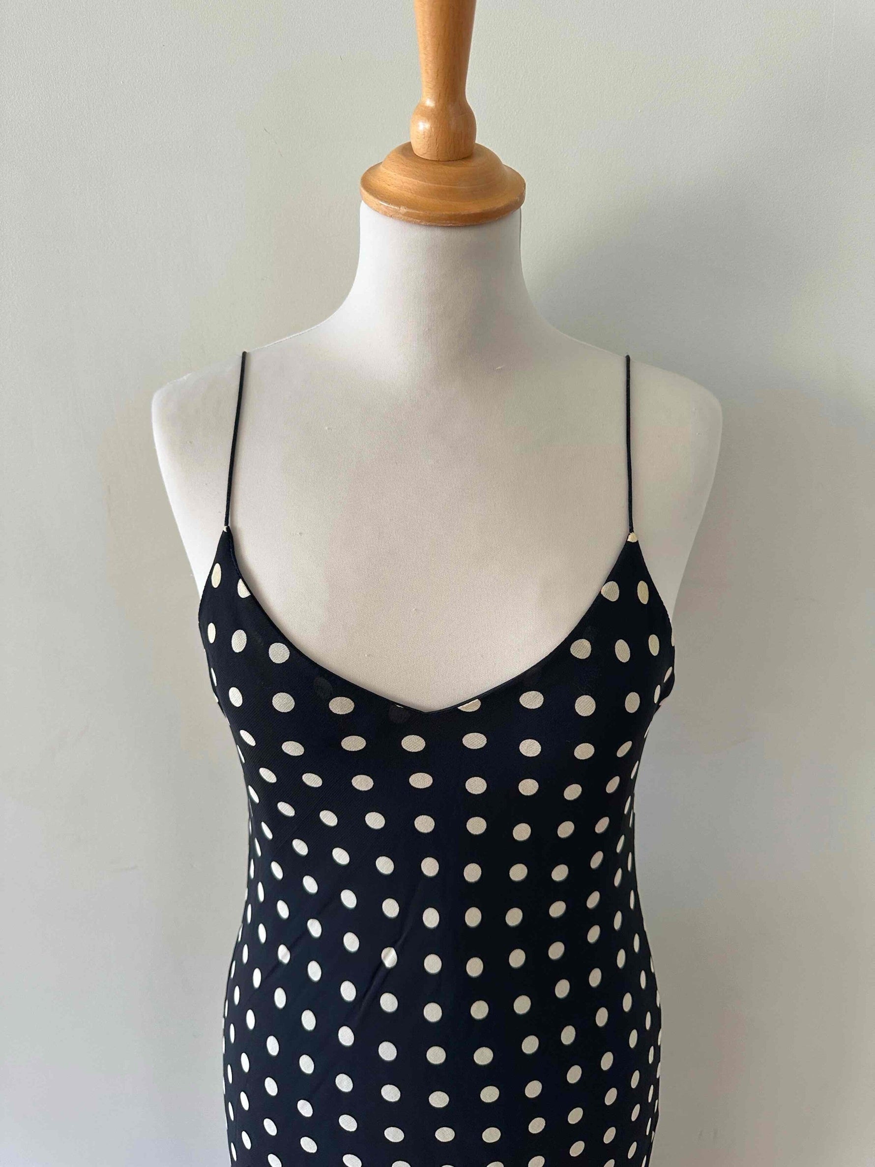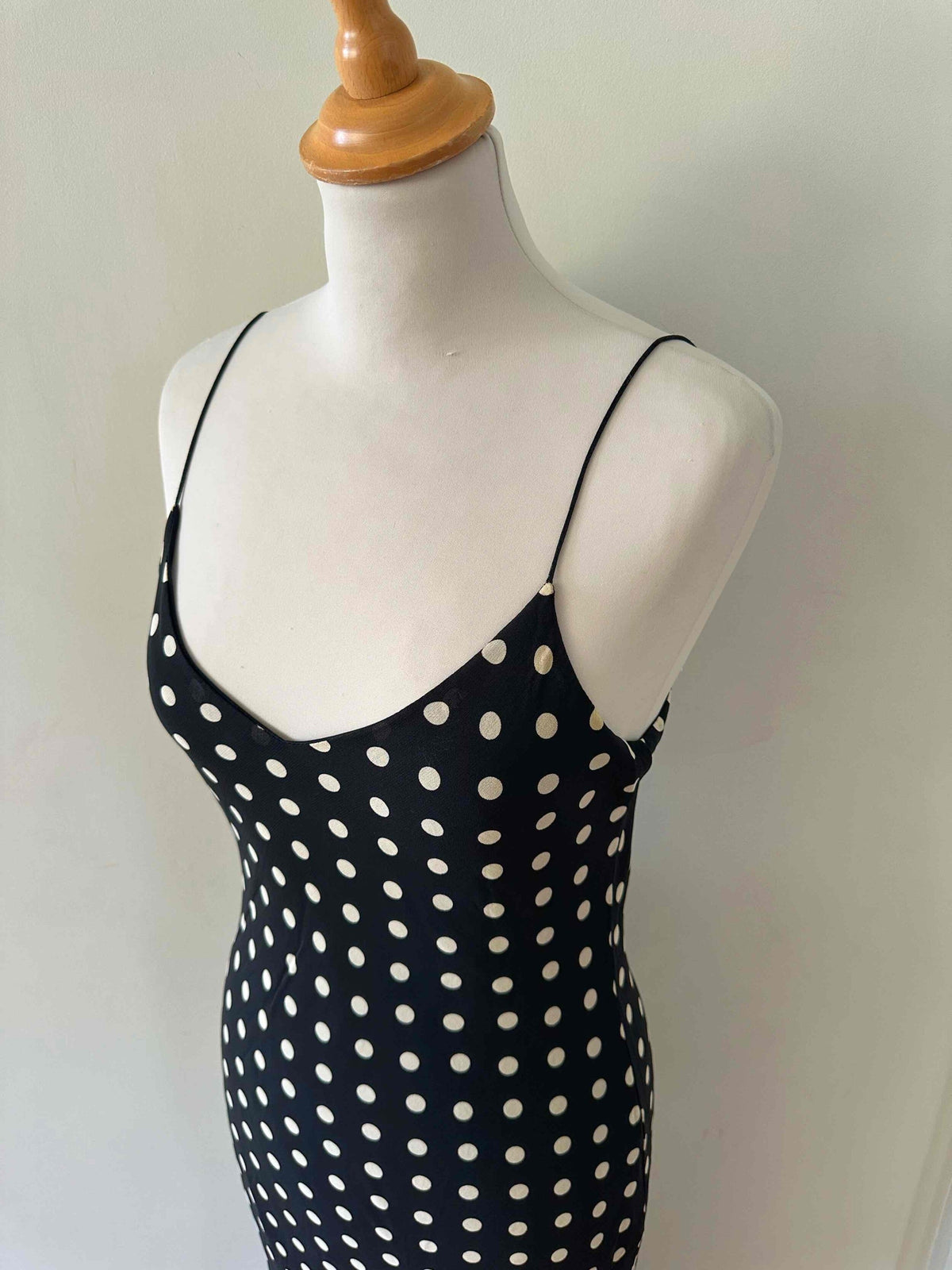 Prix unitaire parRobe nuisette à pois, en voile viscose doublée noire à pois blancs écrus, bretelles spaghettis satin noir, col v, taillée en biais, fabriquée en France, taille 36 portée ici sur un mannequin T36, aisselles 43cm.