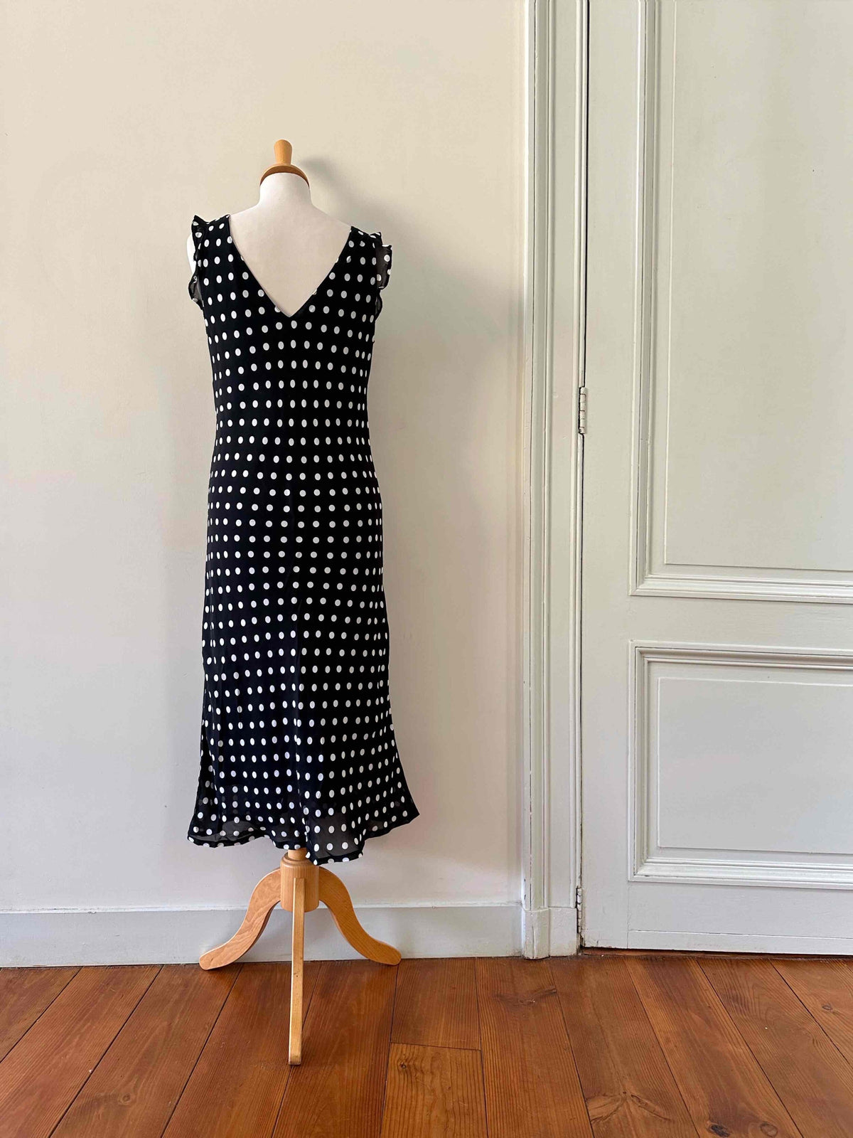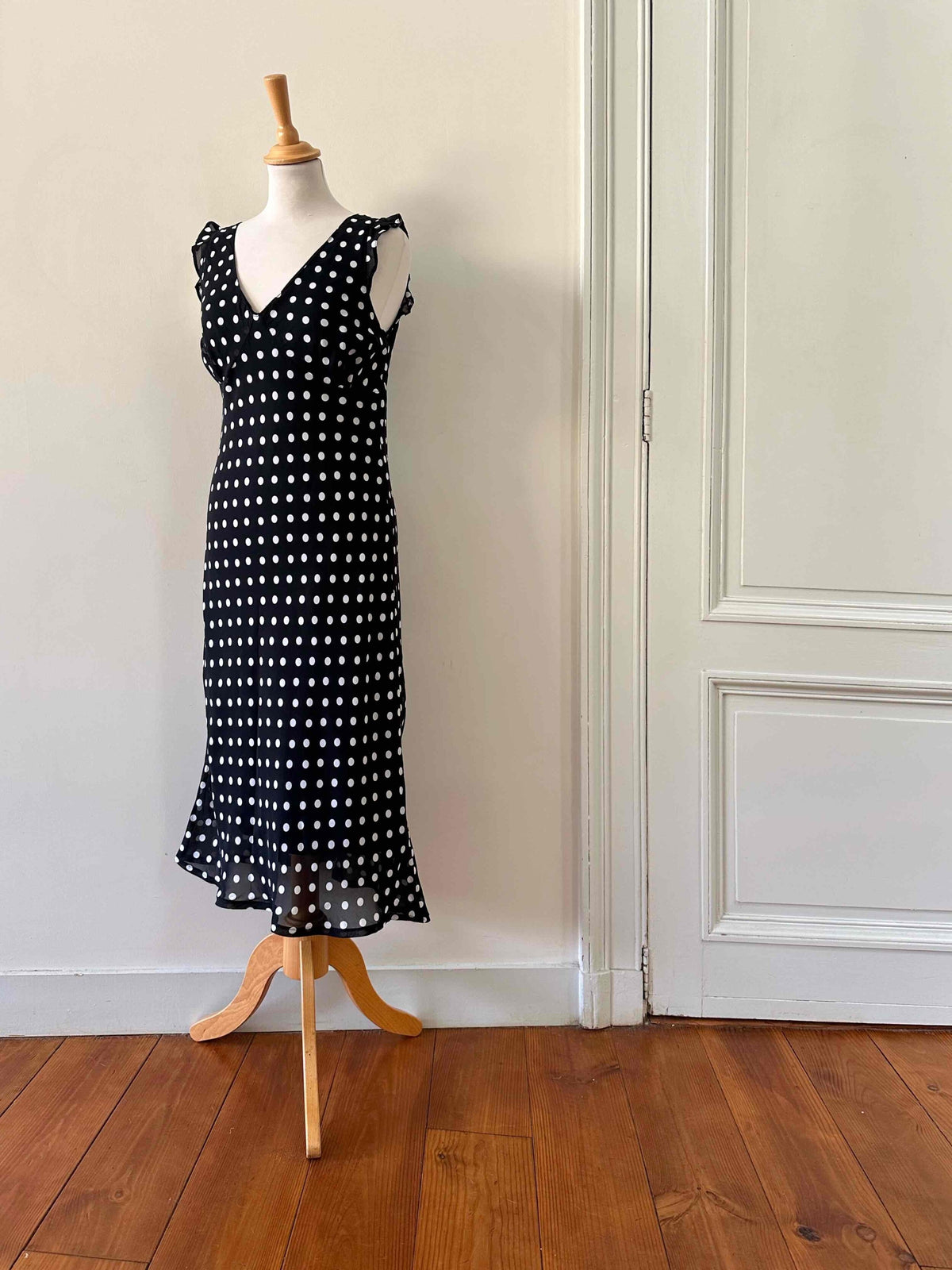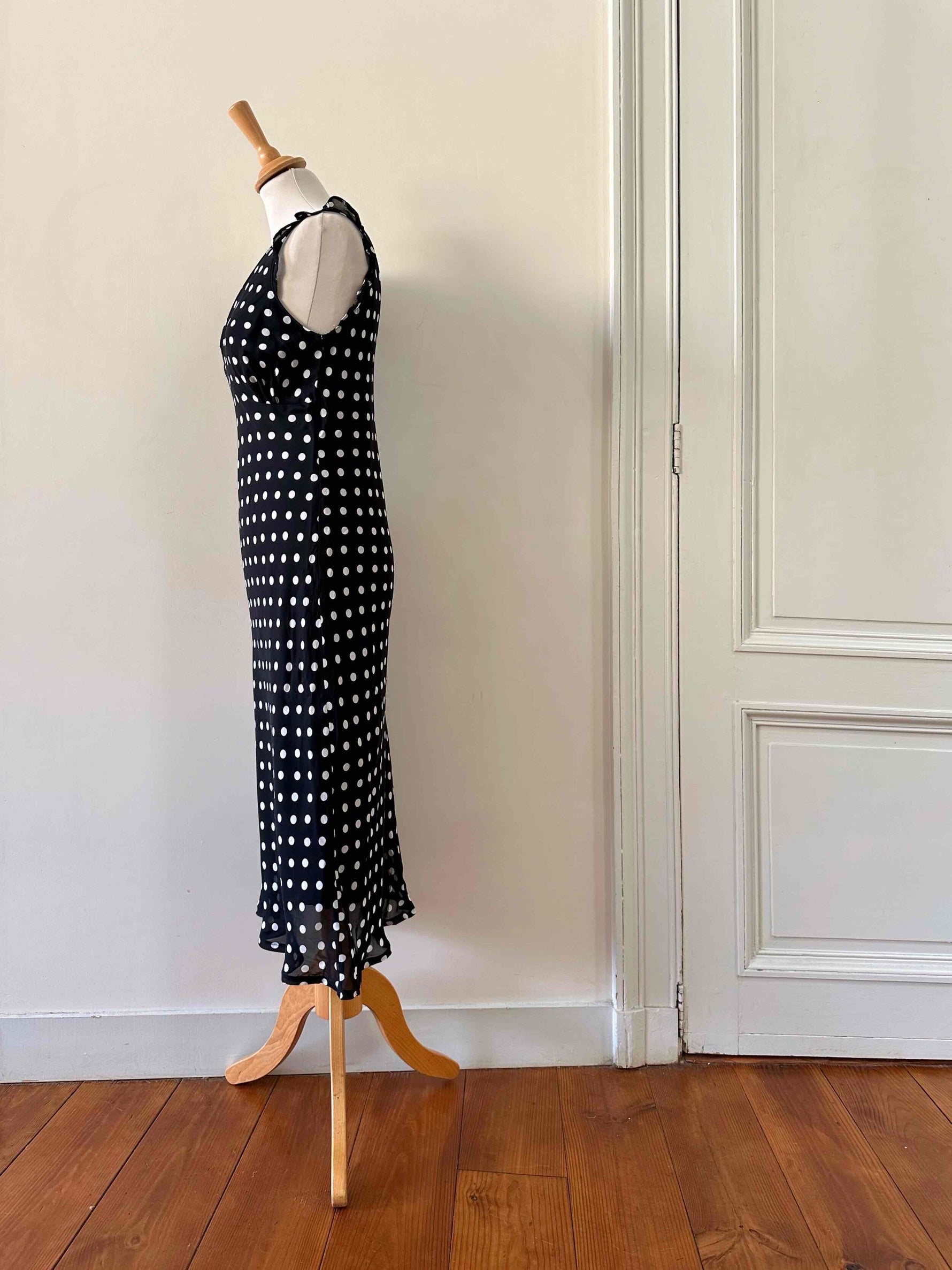 Prix unitaire parRobe longue à pois, en voile viscose noir imprimée pois blancs, découpes sous poitrine froncées, petits volants aux manches, taillée en biais, fabriquée en France, taille 36 portée ici sur un mannequin T36, aisselles 43 cm.