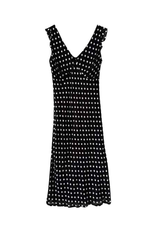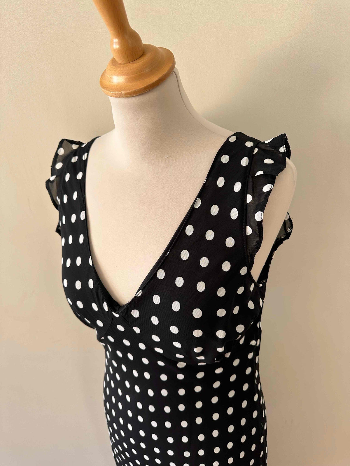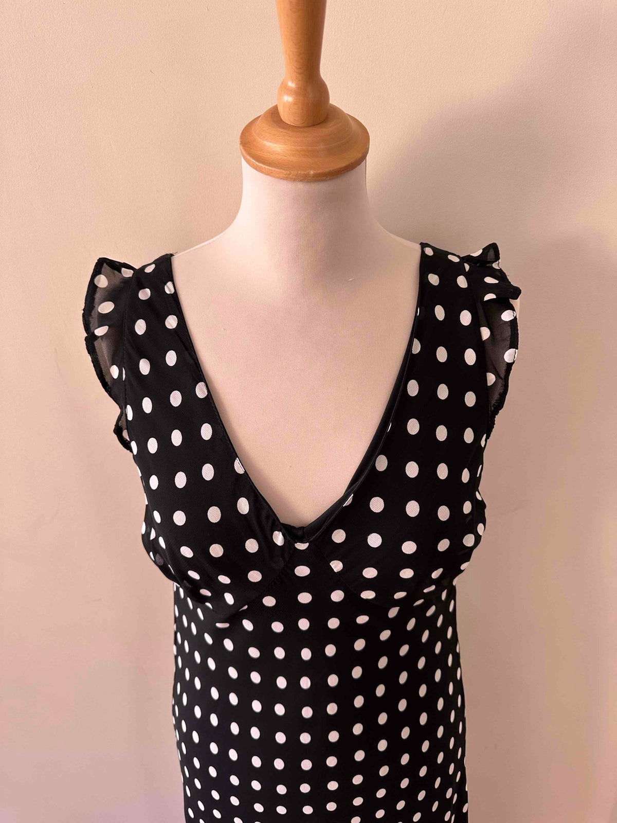 Prix unitaire parRobe longue à pois, en voile viscose noir imprimée pois blancs, découpes sous poitrine froncées, petits volants aux manches, taillée en biais, fabriquée en France, taille 36 portée ici sur un mannequin T36, aisselles 43 cm.