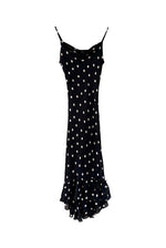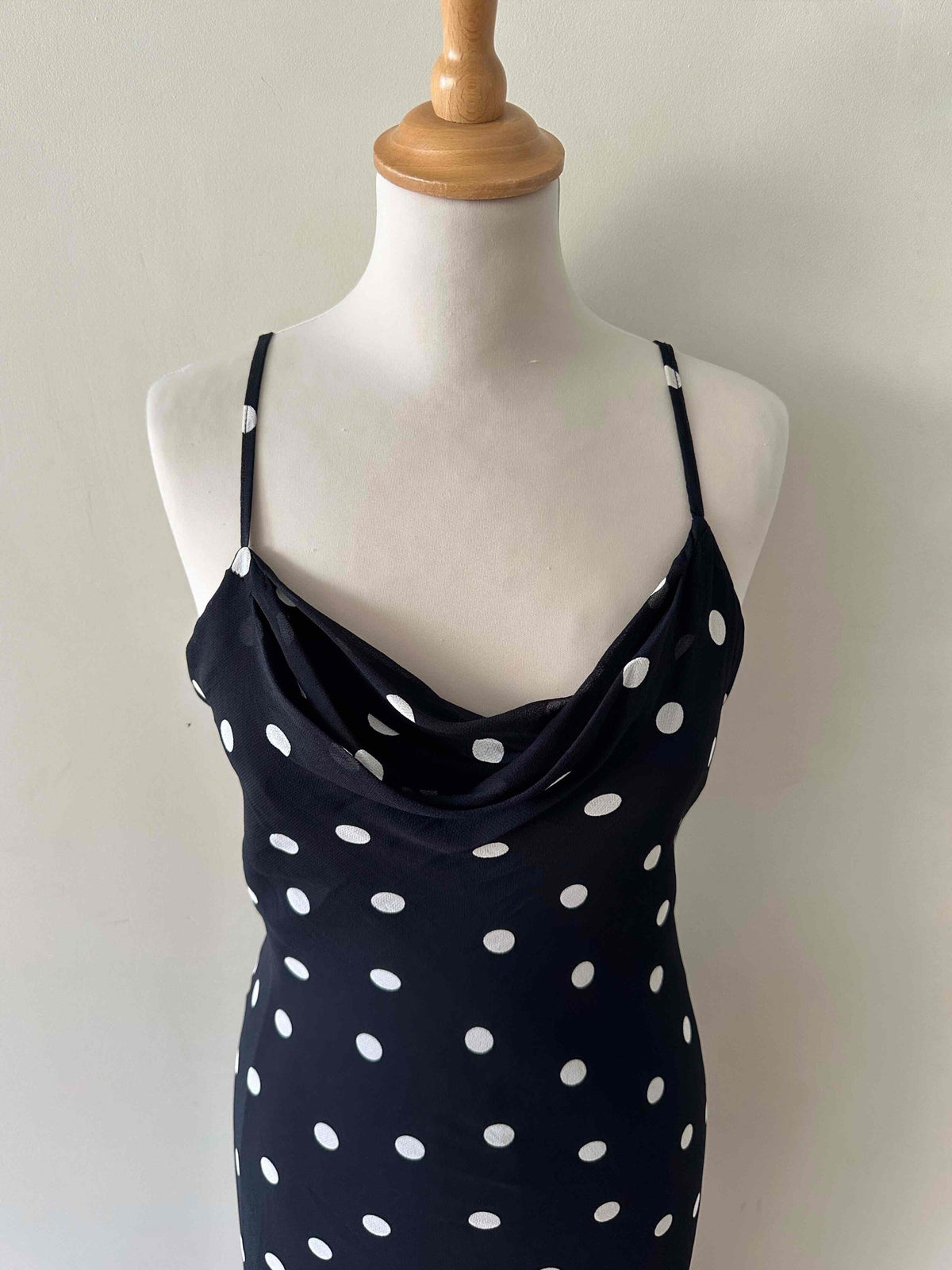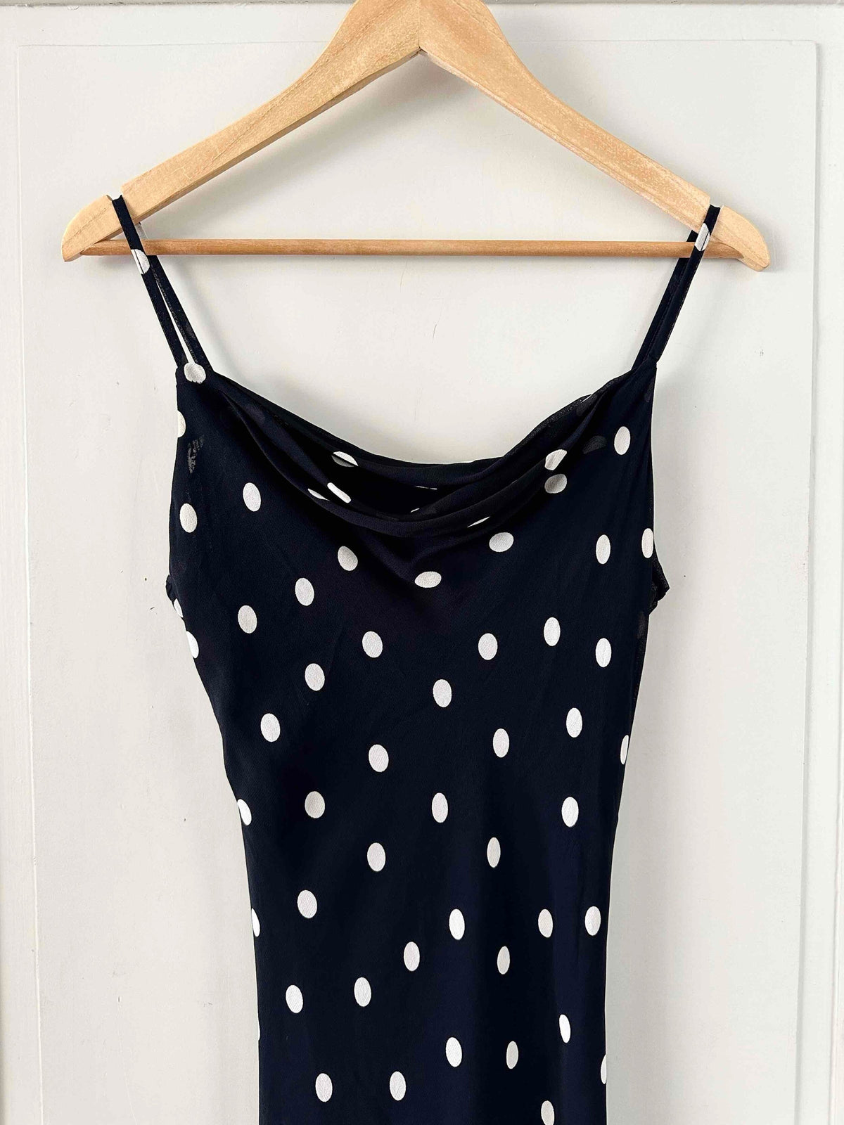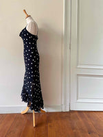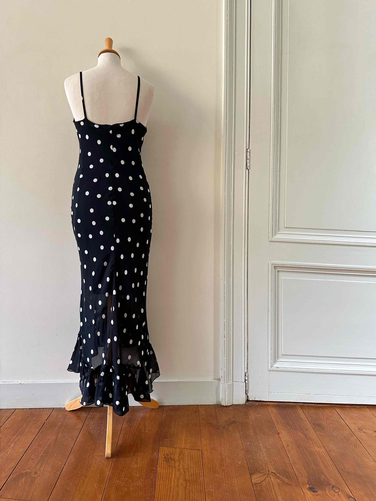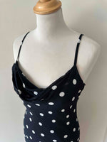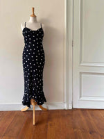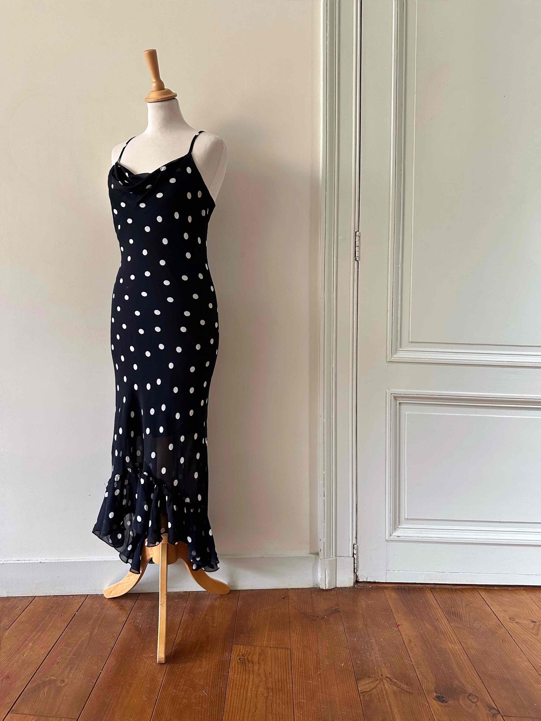 Prix unitaire parRobe nuisette à pois, en voile viscose noire imprimée pois blancs, bretelles spaghettis, encolure drappée bénitier, taillée en biais, bas volanté, fabriquée en France, taille 36 portée ici sur un mannequin T36, aisselles 43 cm.