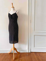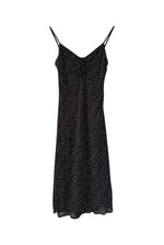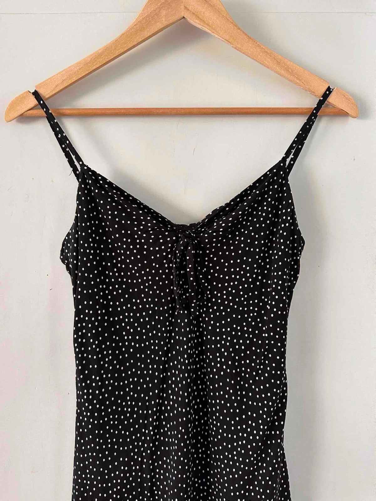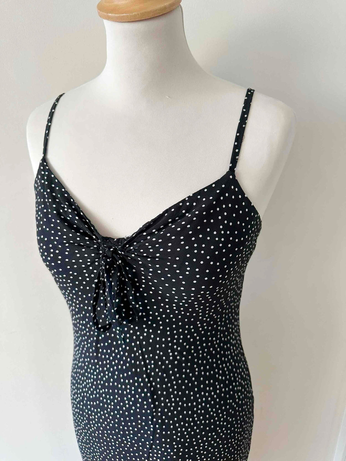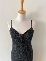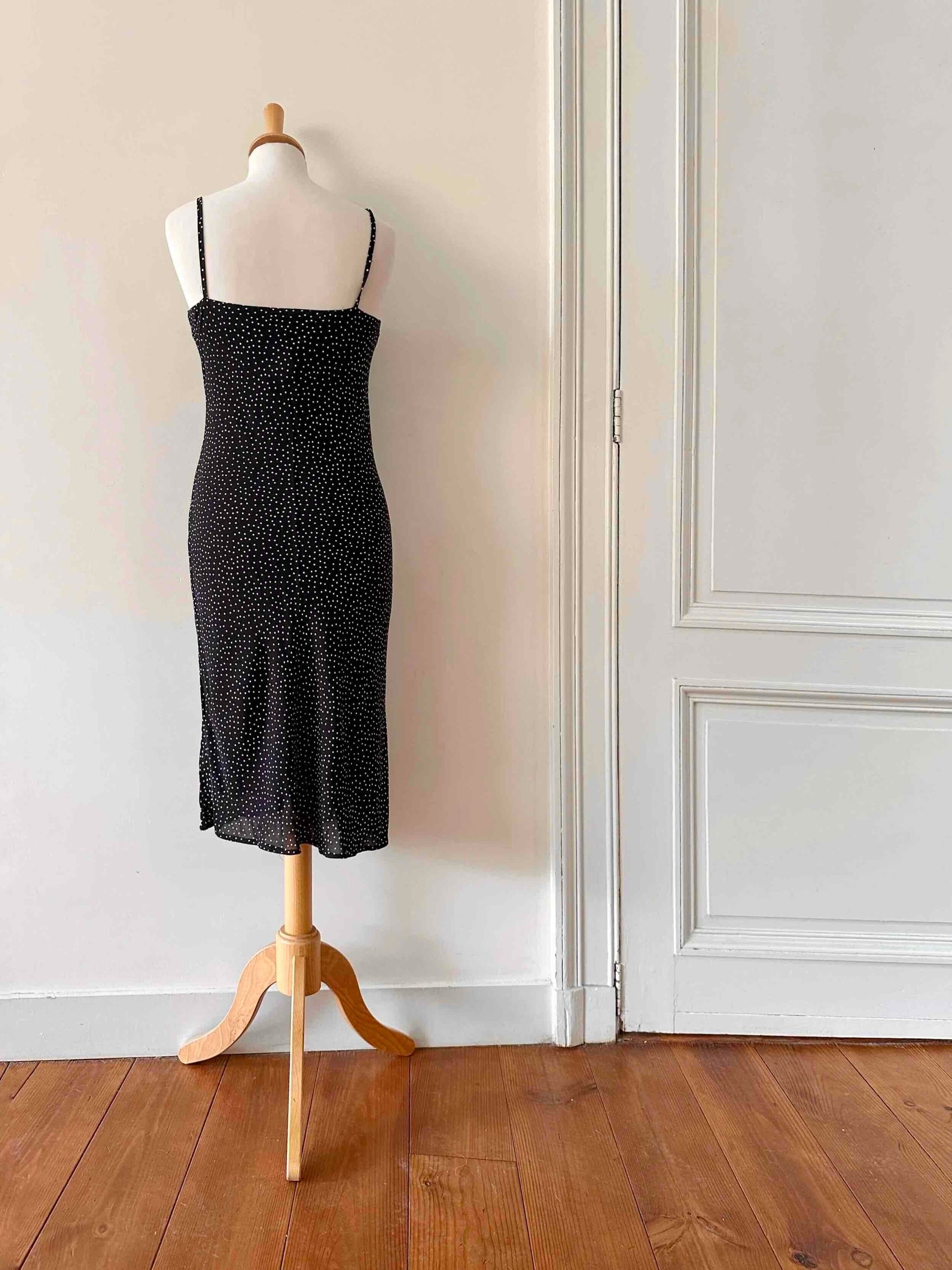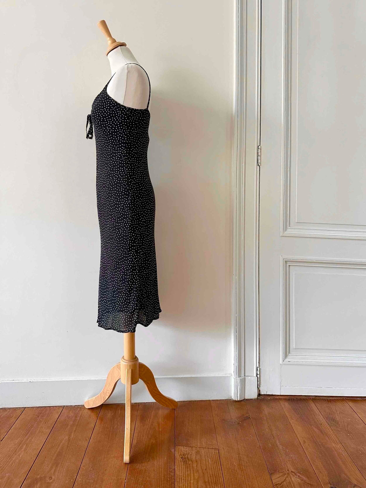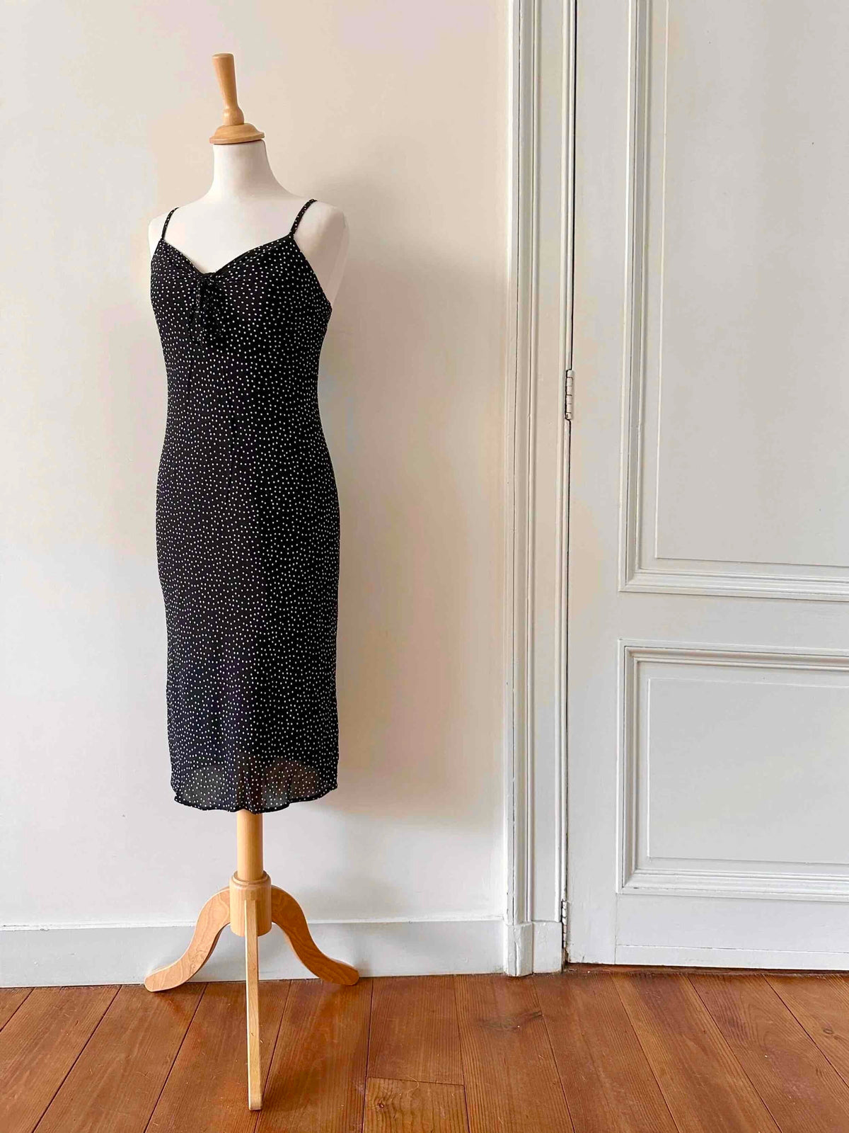 Prix unitaire parRobe nuisette à pois, en voile viscose doublée noire imprimée minis pois blancs, poitrine froncée à nouer, fines bretelles, taillée en biais, fabriquée en France, taille 36, portée ici sur un mannequin T36, aisselles 43 cm.