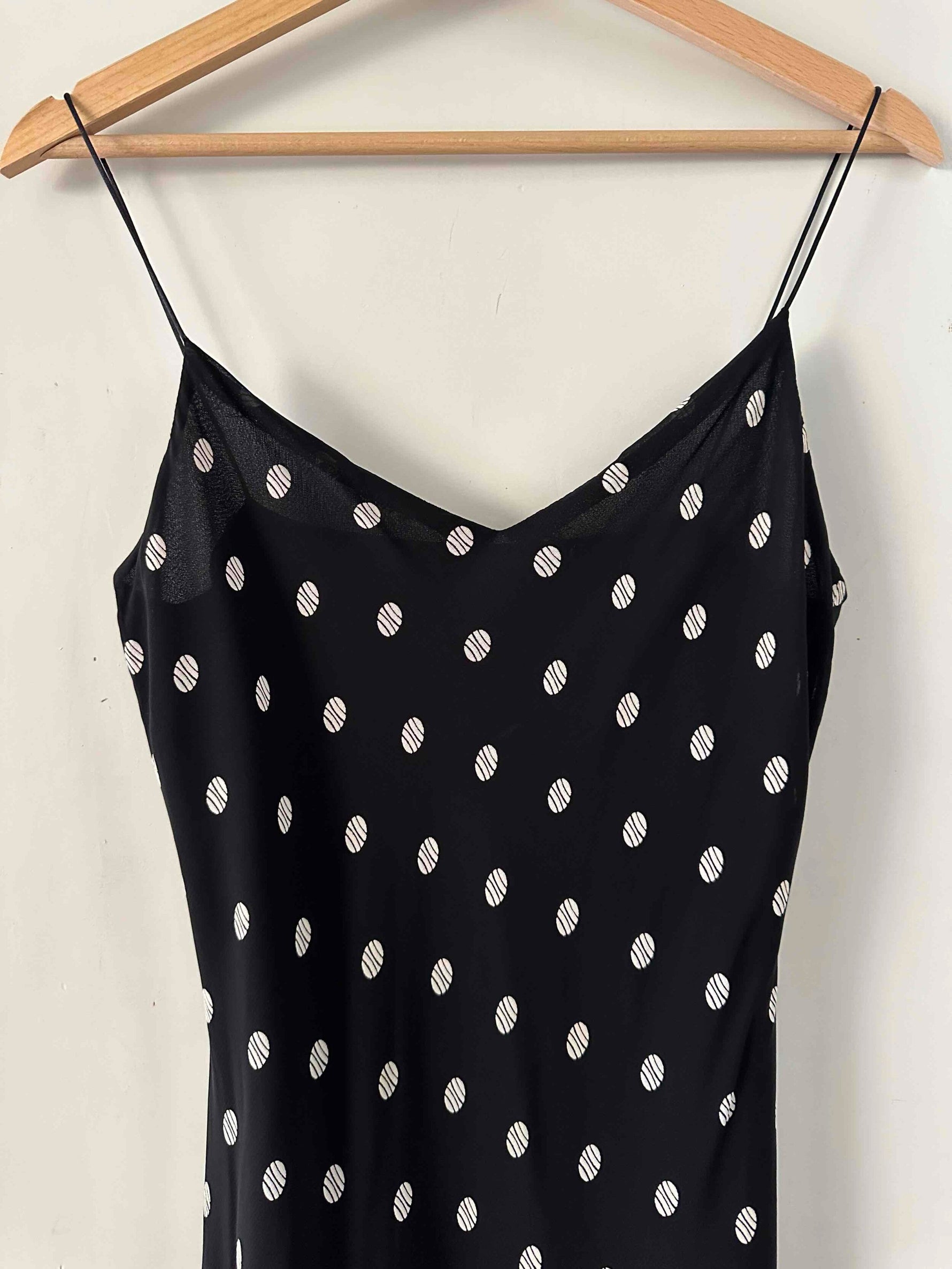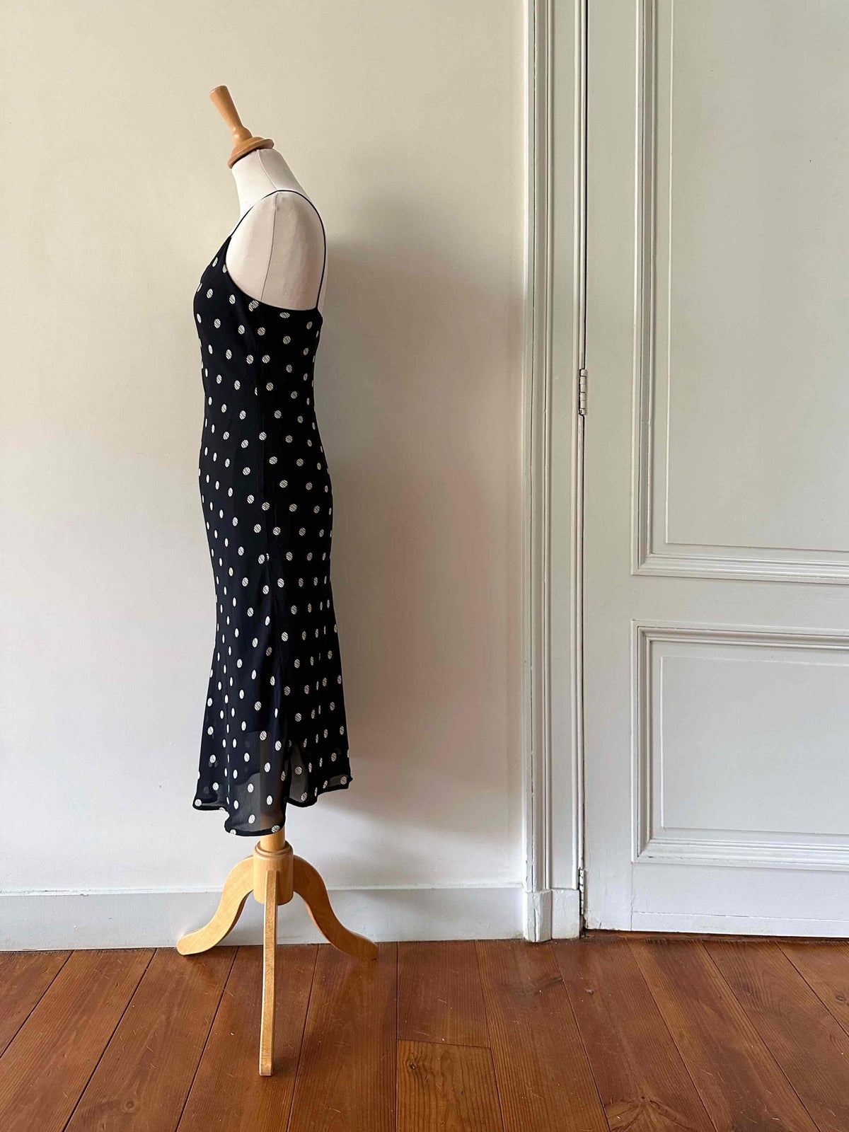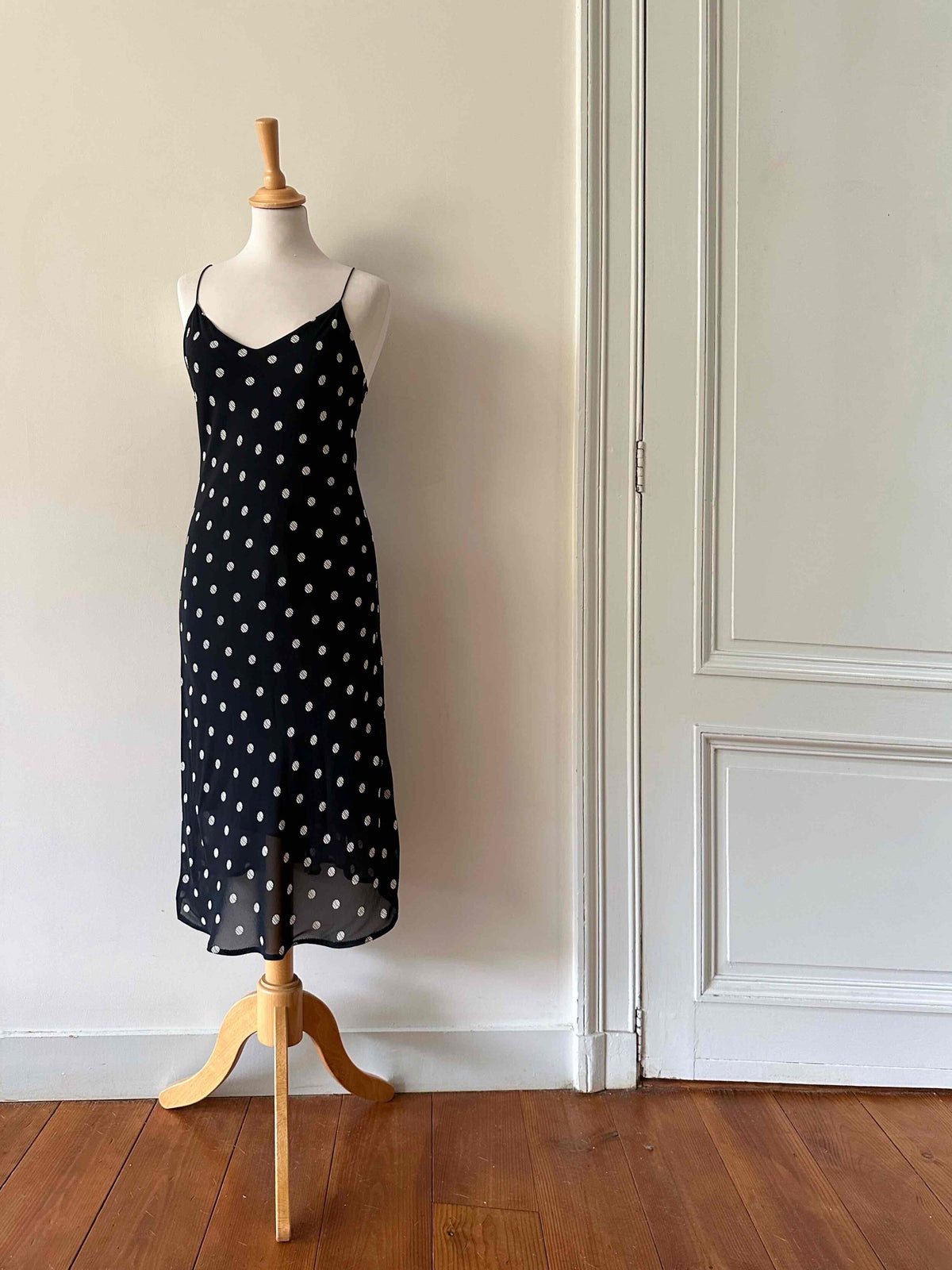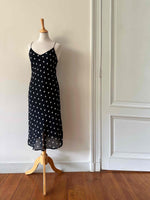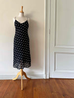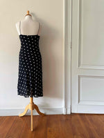 Prix unitaire parRobe nuisette à pois, en voile viscose doublé noir à pois blancs, bretelles spaghettis satinées, taillée en biais, fabriquée en France, taille 36 portée ici sur un mannequin T36, aisselles 43 cm.