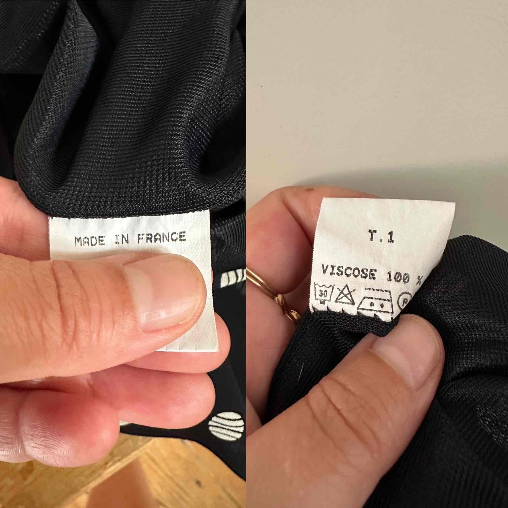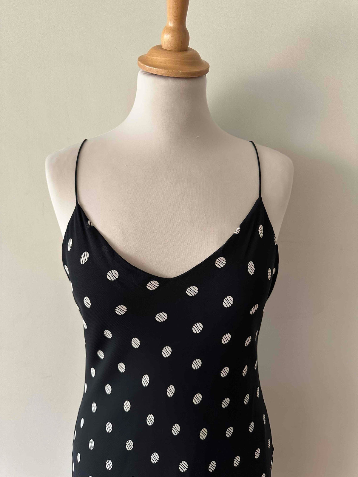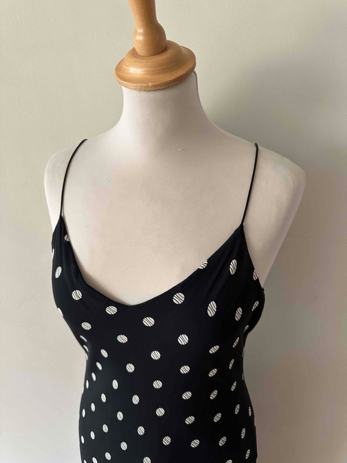 Prix unitaire parRobe nuisette à pois, en voile viscose doublé noir à pois blancs, bretelles spaghettis satinées, taillée en biais, fabriquée en France, taille 36 portée ici sur un mannequin T36, aisselles 43 cm.
