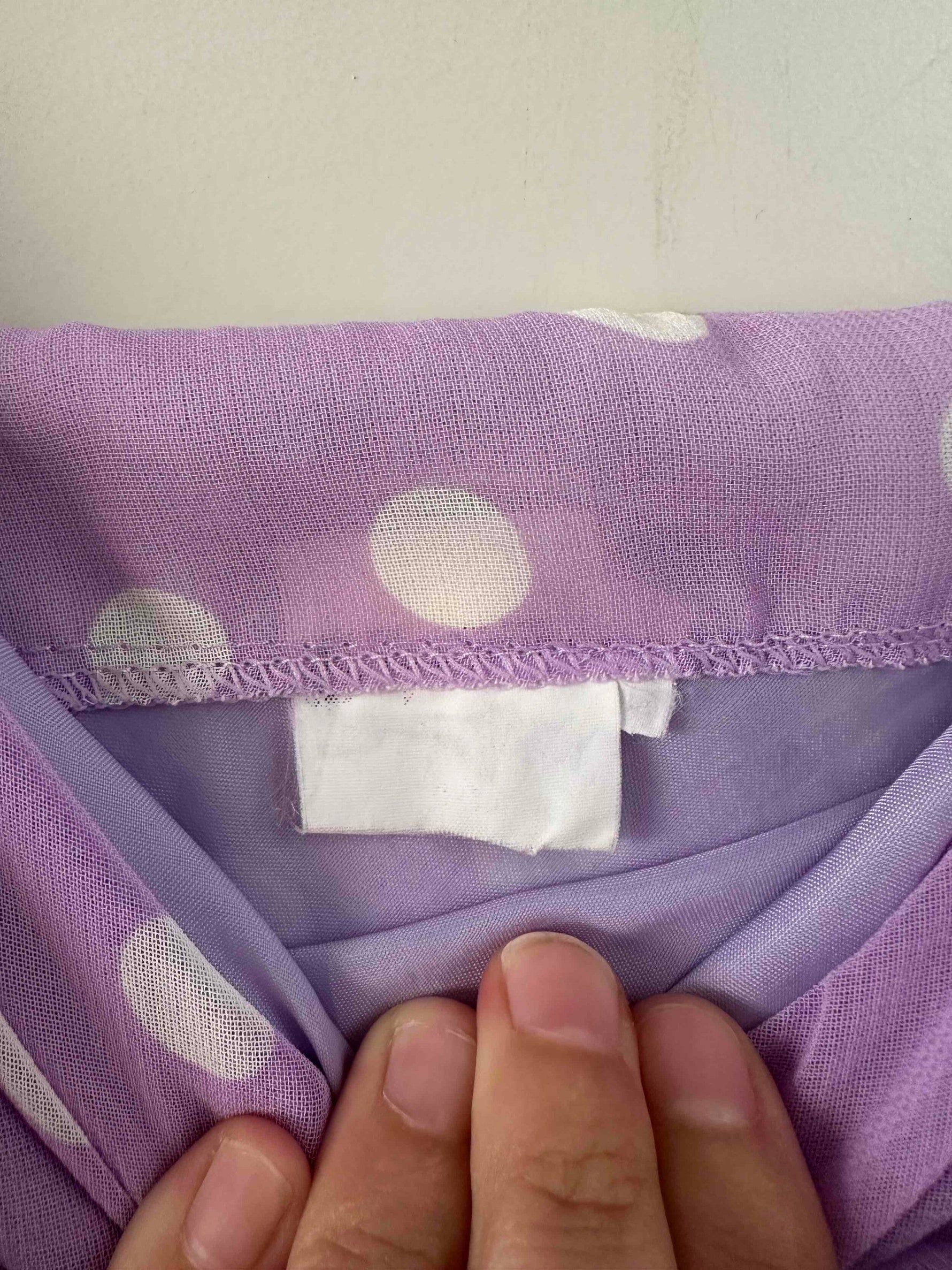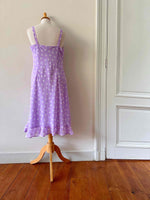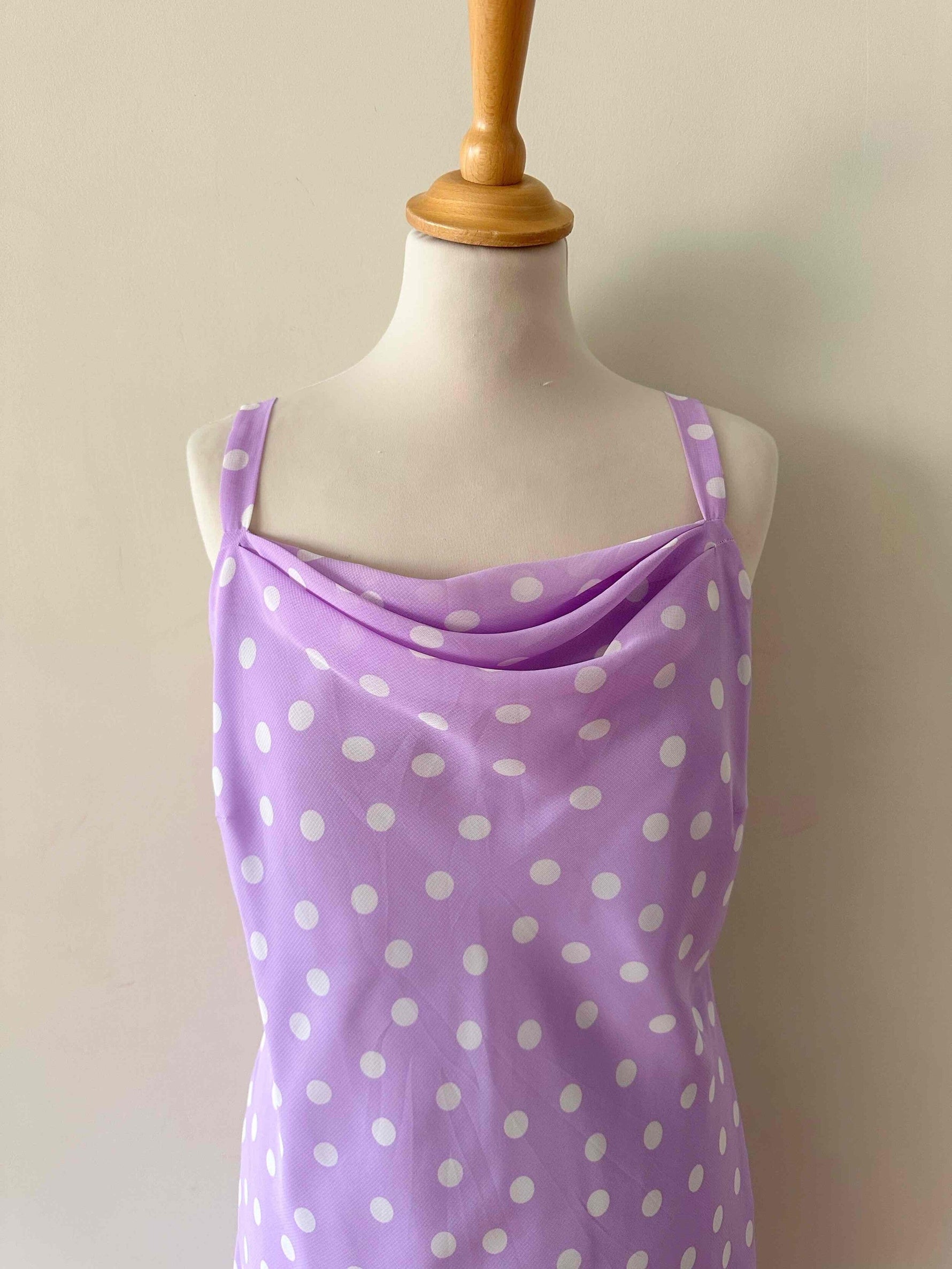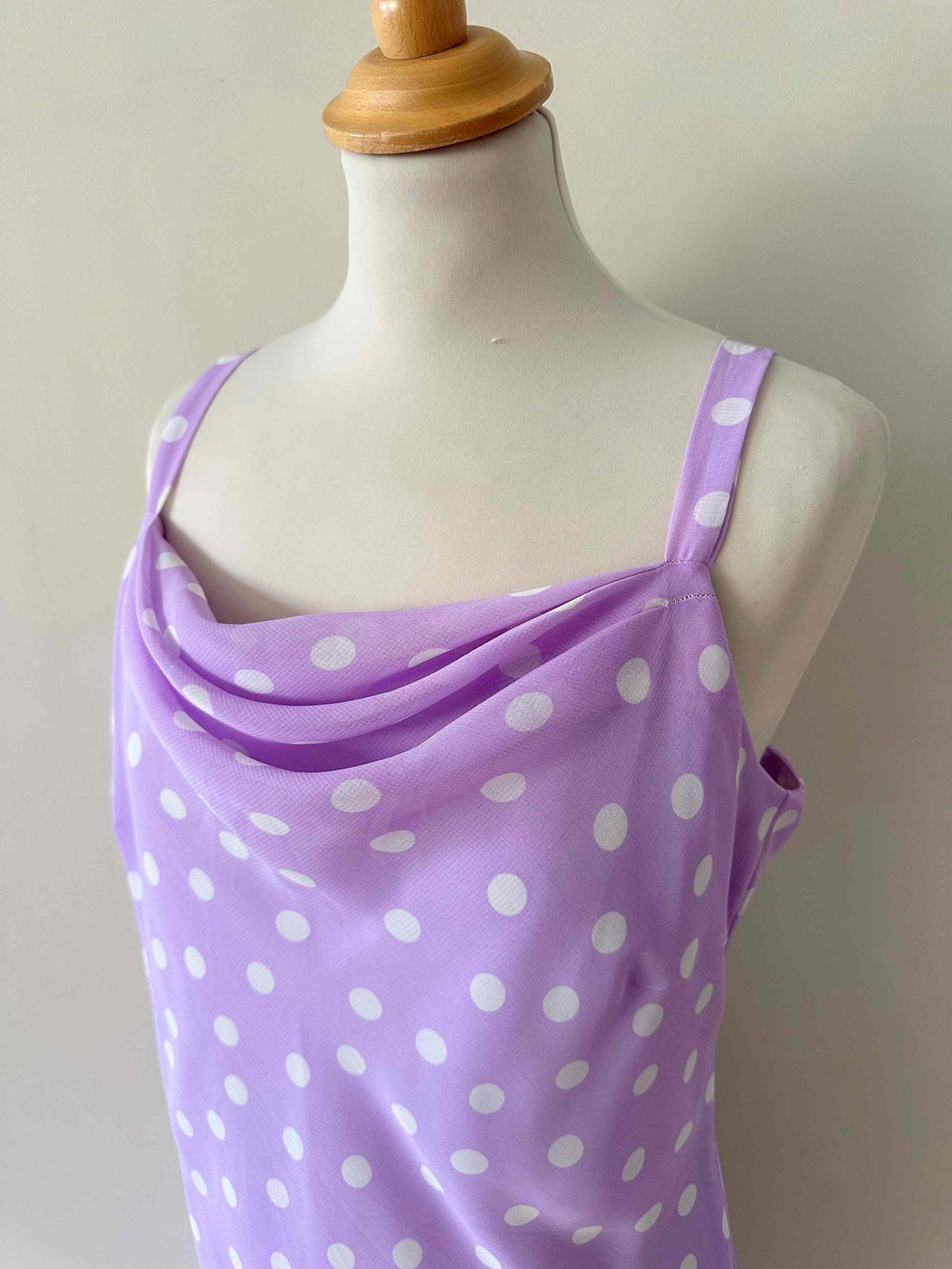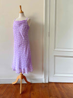Prix unitaire parRobe nuisette à pois, en voile viscose lilas imprimée pois blancs, bretelles larges, encolure benitier drappée, taillée en biais, bas volanté, convient aux tailles 38 et 40, portée ici sur un mannequin T36, aisselles 48cm.
