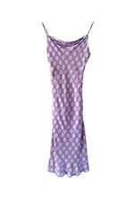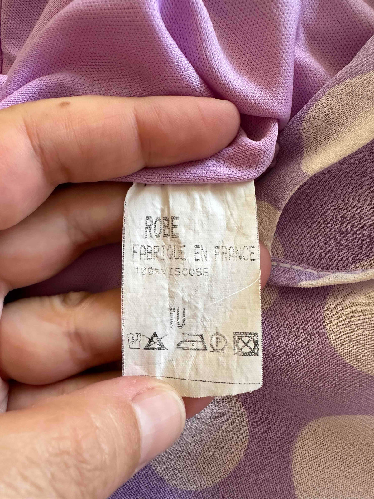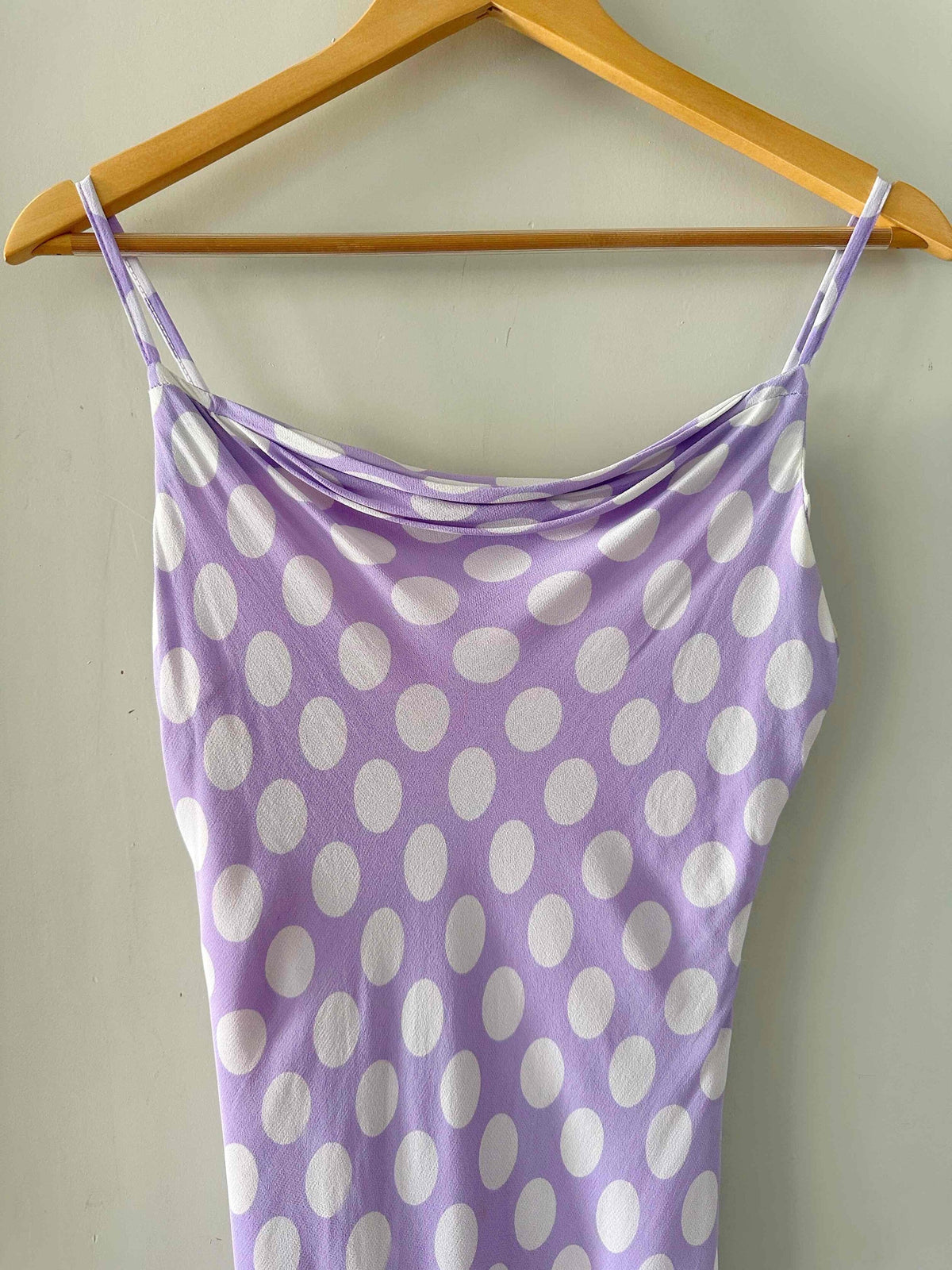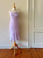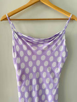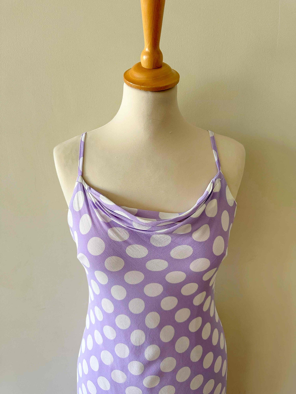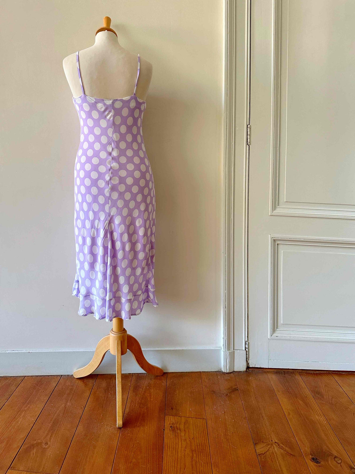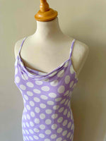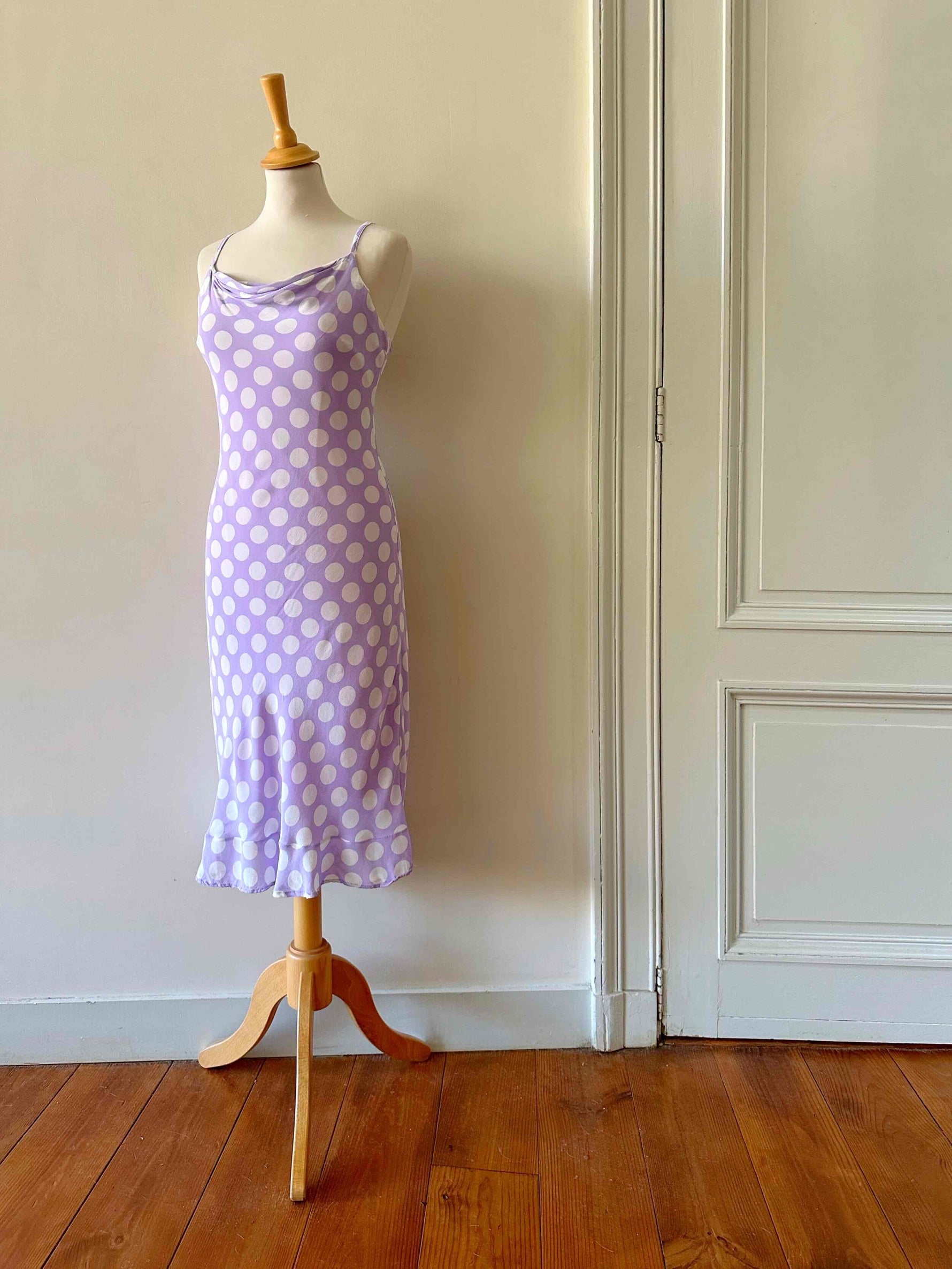 Robe nuisette à pois, en viscose doublée lilas imprimée pois pastilles blancs, bretelles spaghettis, encolure drapée benitier, taillée en biais, fabriquée en France, taille 36 portée ici sur un mannequin T36, aisselles 43cm.