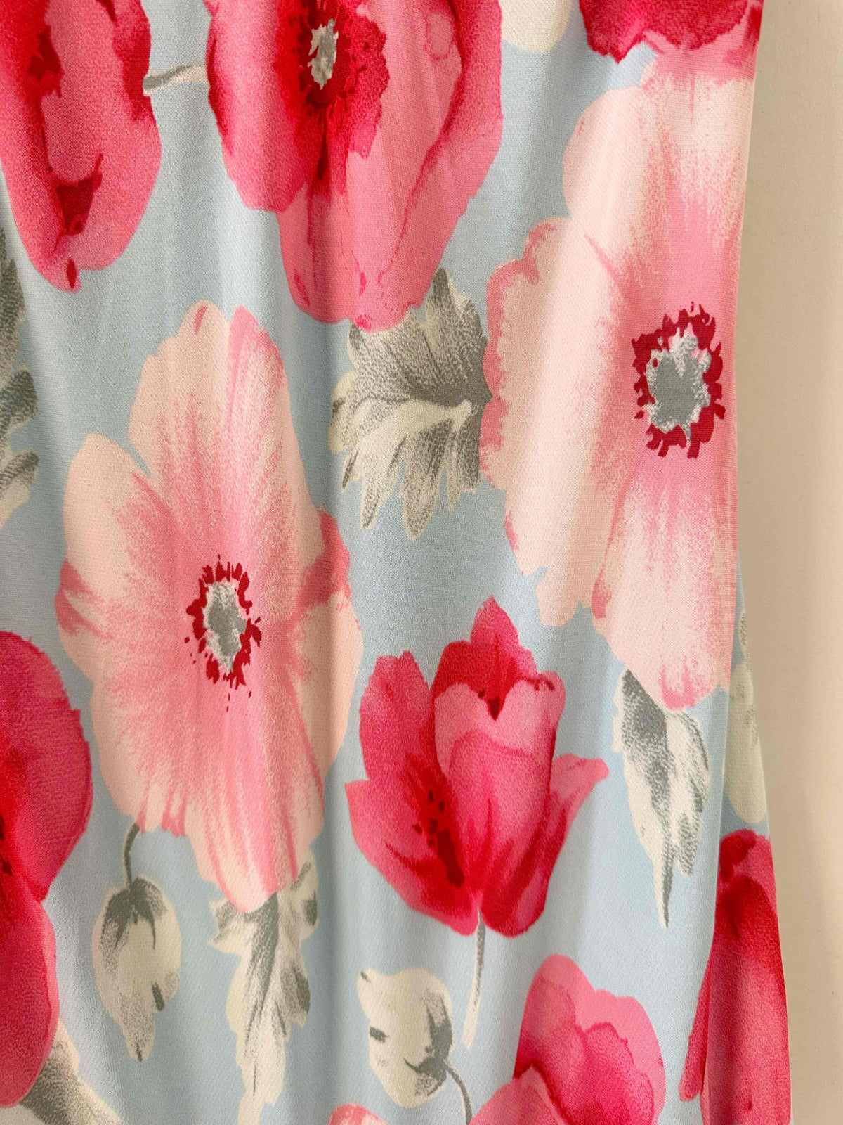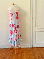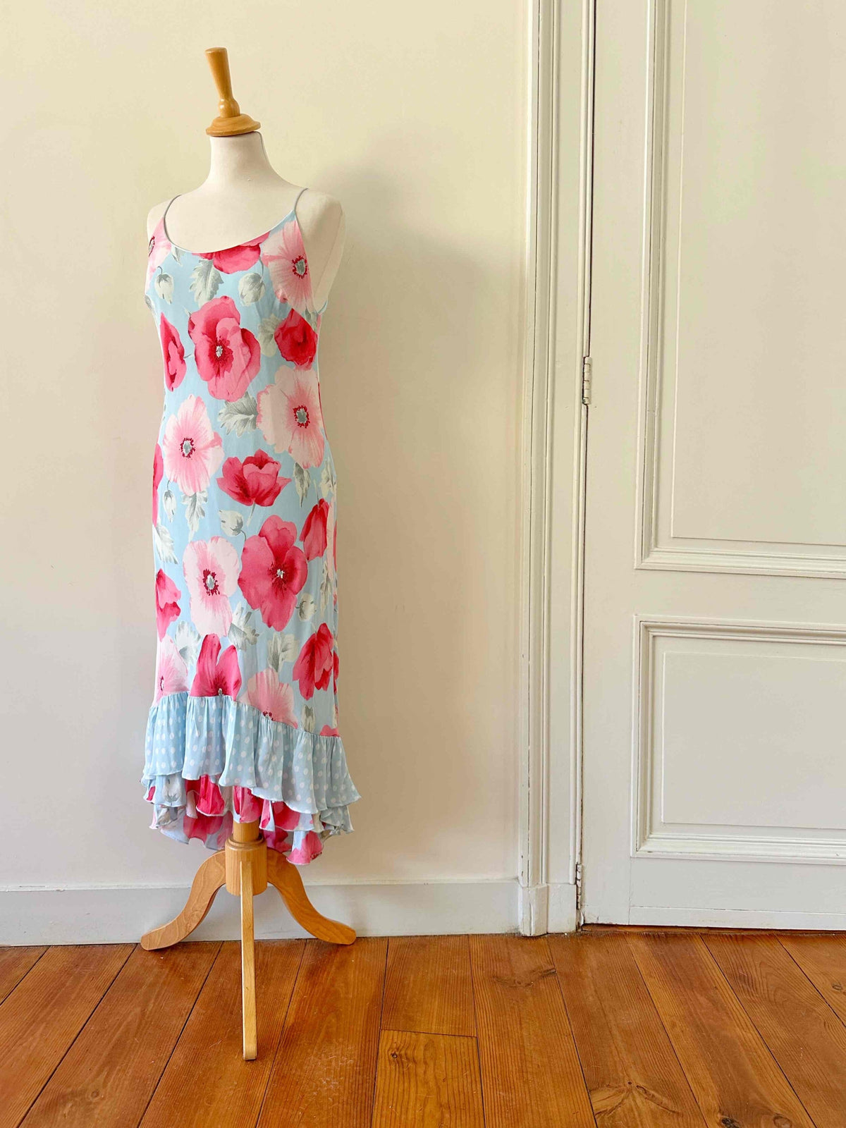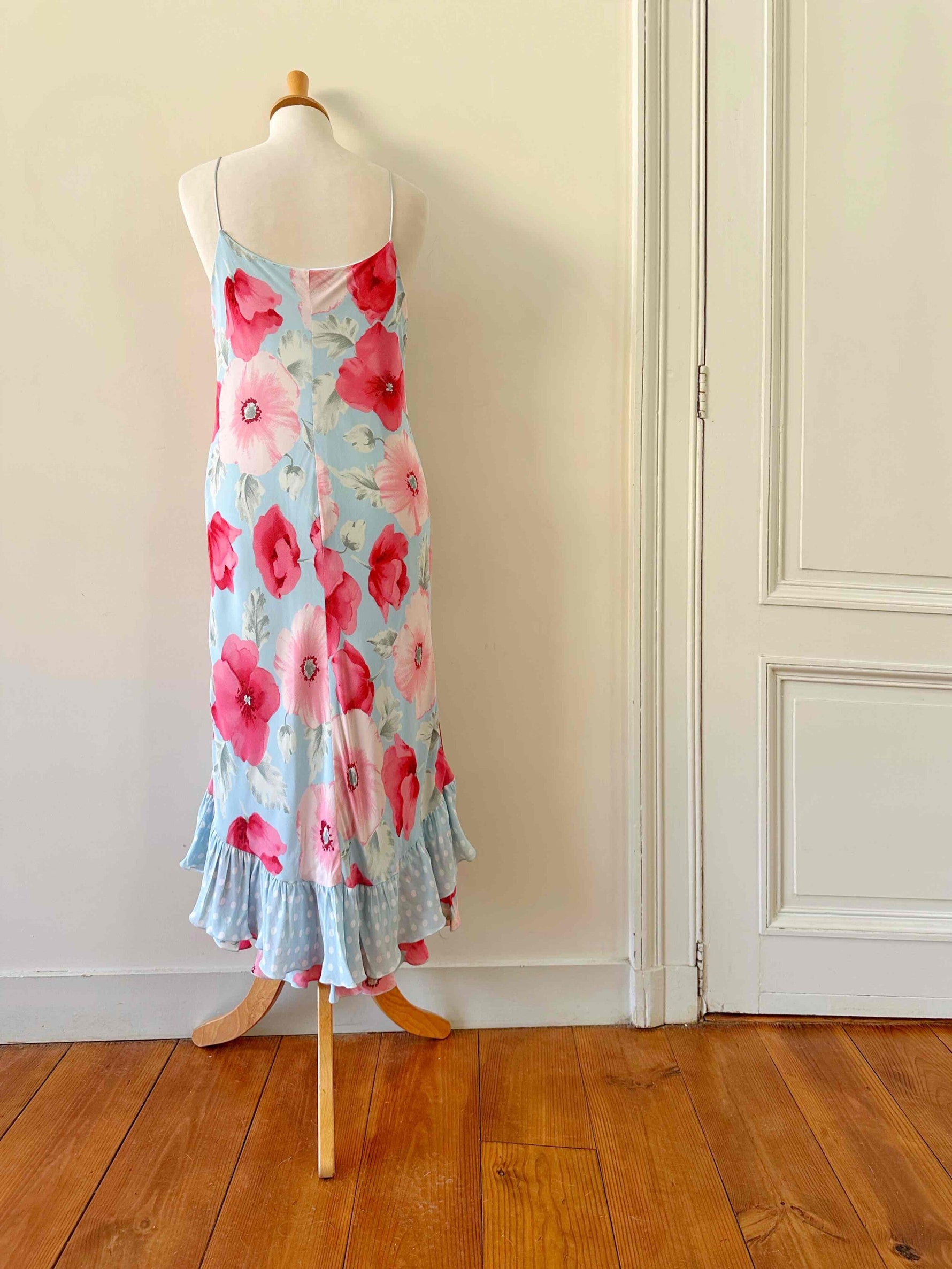 Prix unitaire parRobe nuisette pois et fleurs, en voile viscose bleu ciel imprimée grandes fleurs roses fuschias et pastel, bretelles spaghettis en satin, bas volanté bleu ciel motifs pois blancs, taillée en biais, fabriquée en Espagne, convient aux tailles 36 et 38 portée ici sur un mannequin T36, aisselles 44cm.