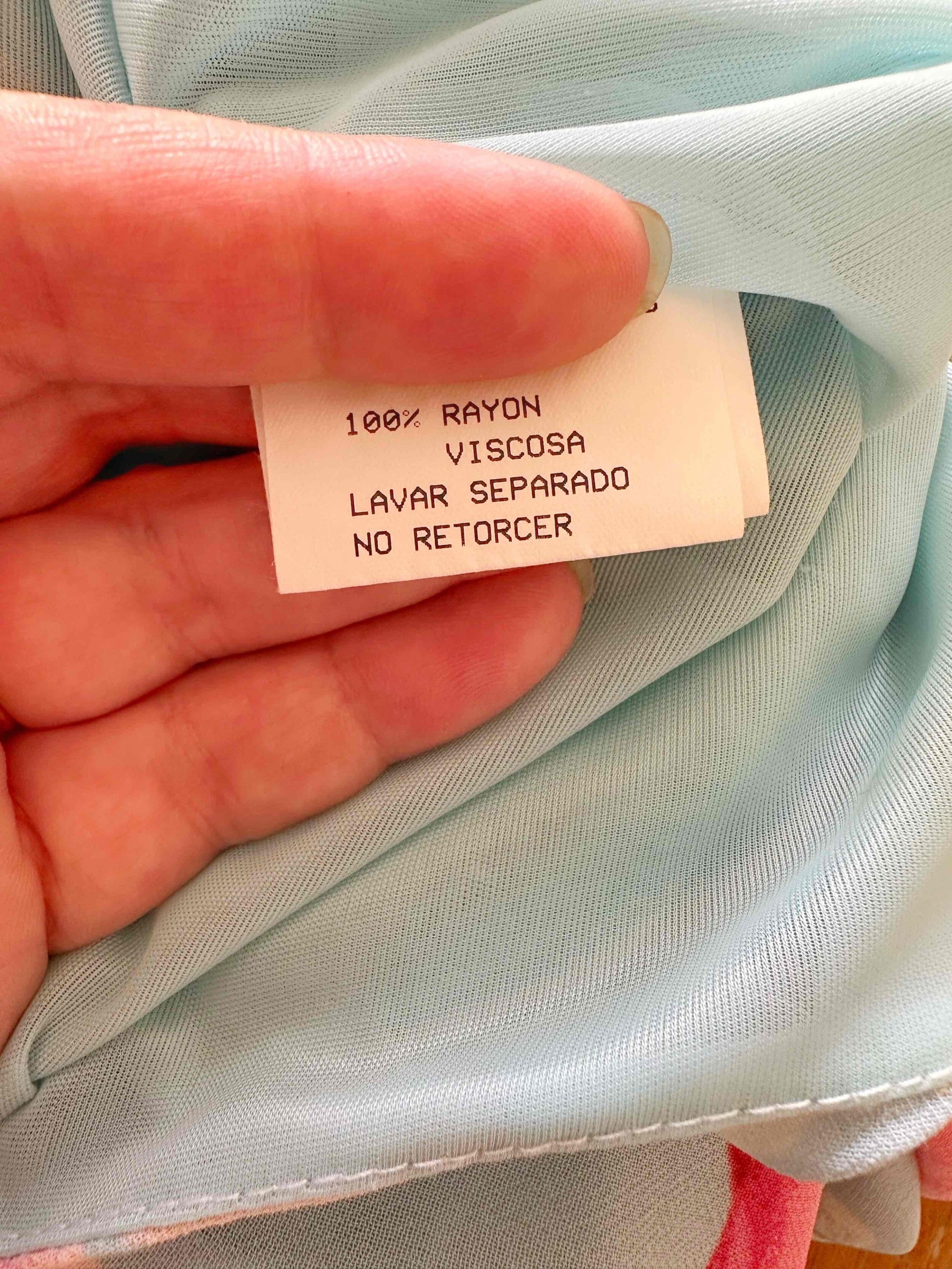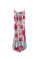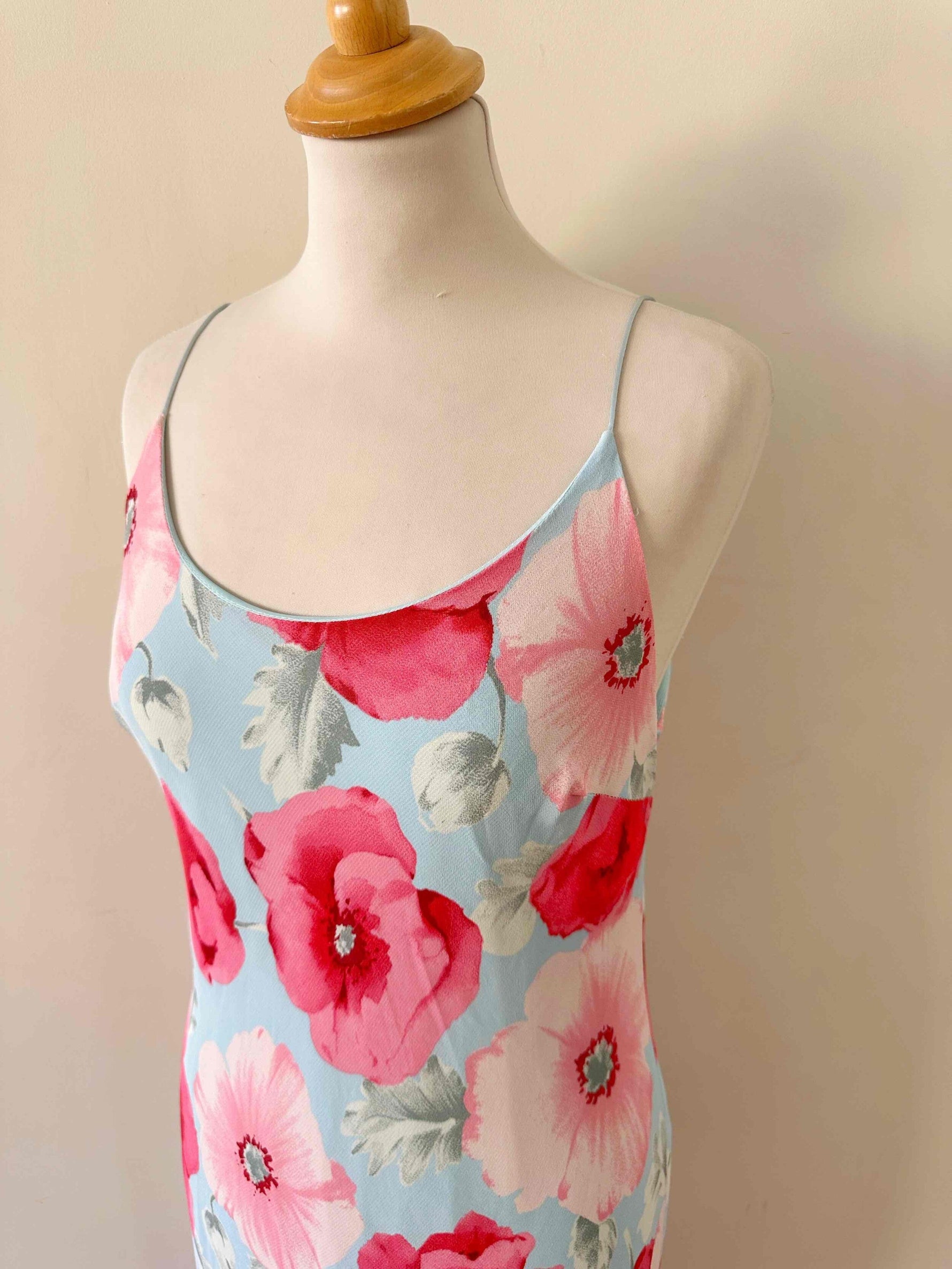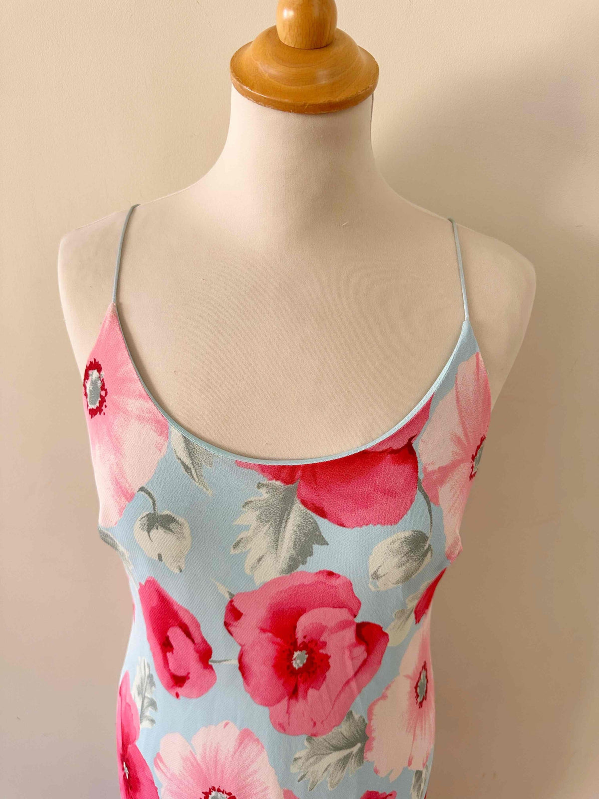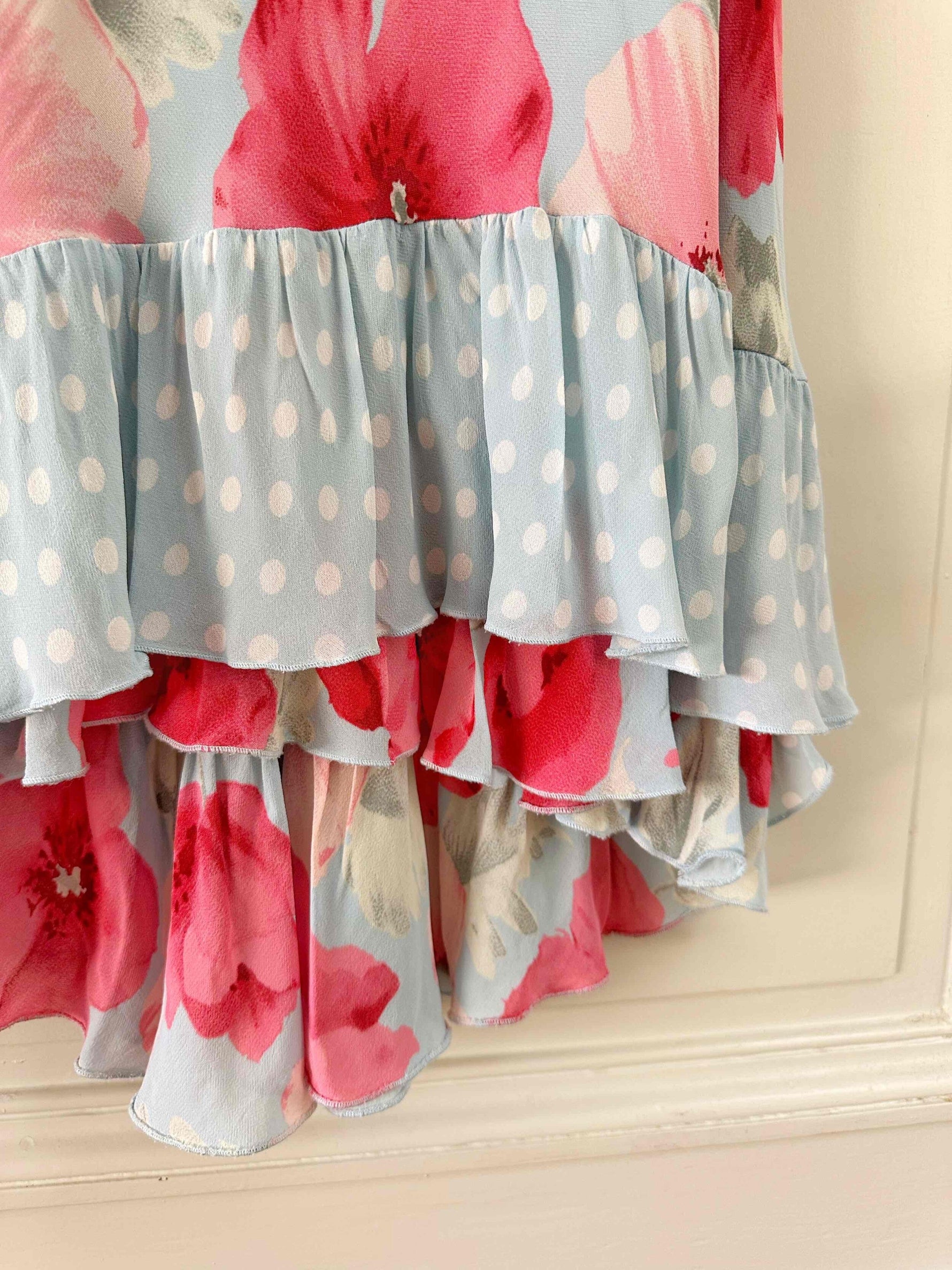 Prix unitaire parRobe nuisette pois et fleurs, en voile viscose bleu ciel imprimée grandes fleurs roses fuschias et pastel, bretelles spaghettis en satin, bas volanté bleu ciel motifs pois blancs, taillée en biais, fabriquée en Espagne, convient aux tailles 36 et 38 portée ici sur un mannequin T36, aisselles 44cm.