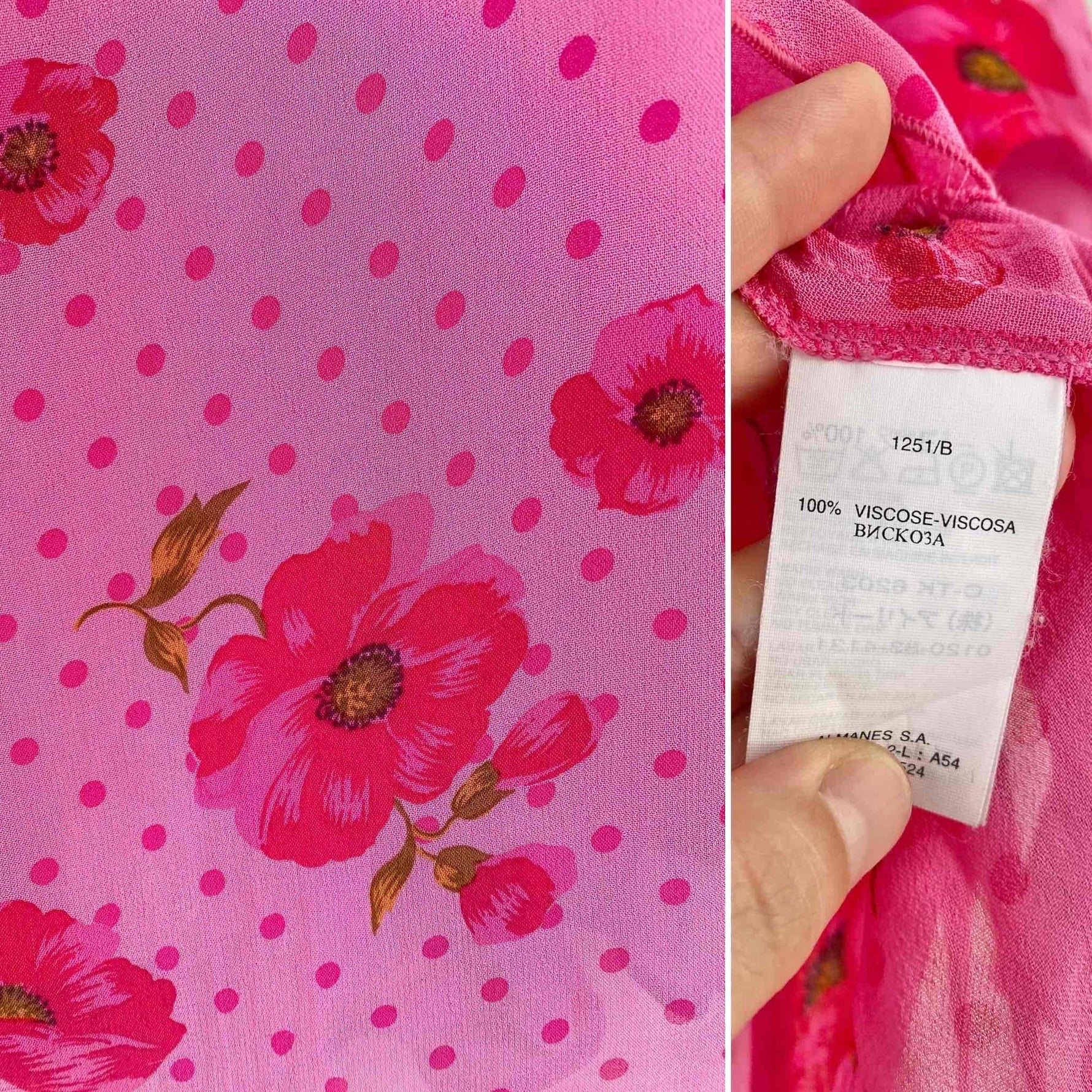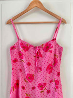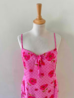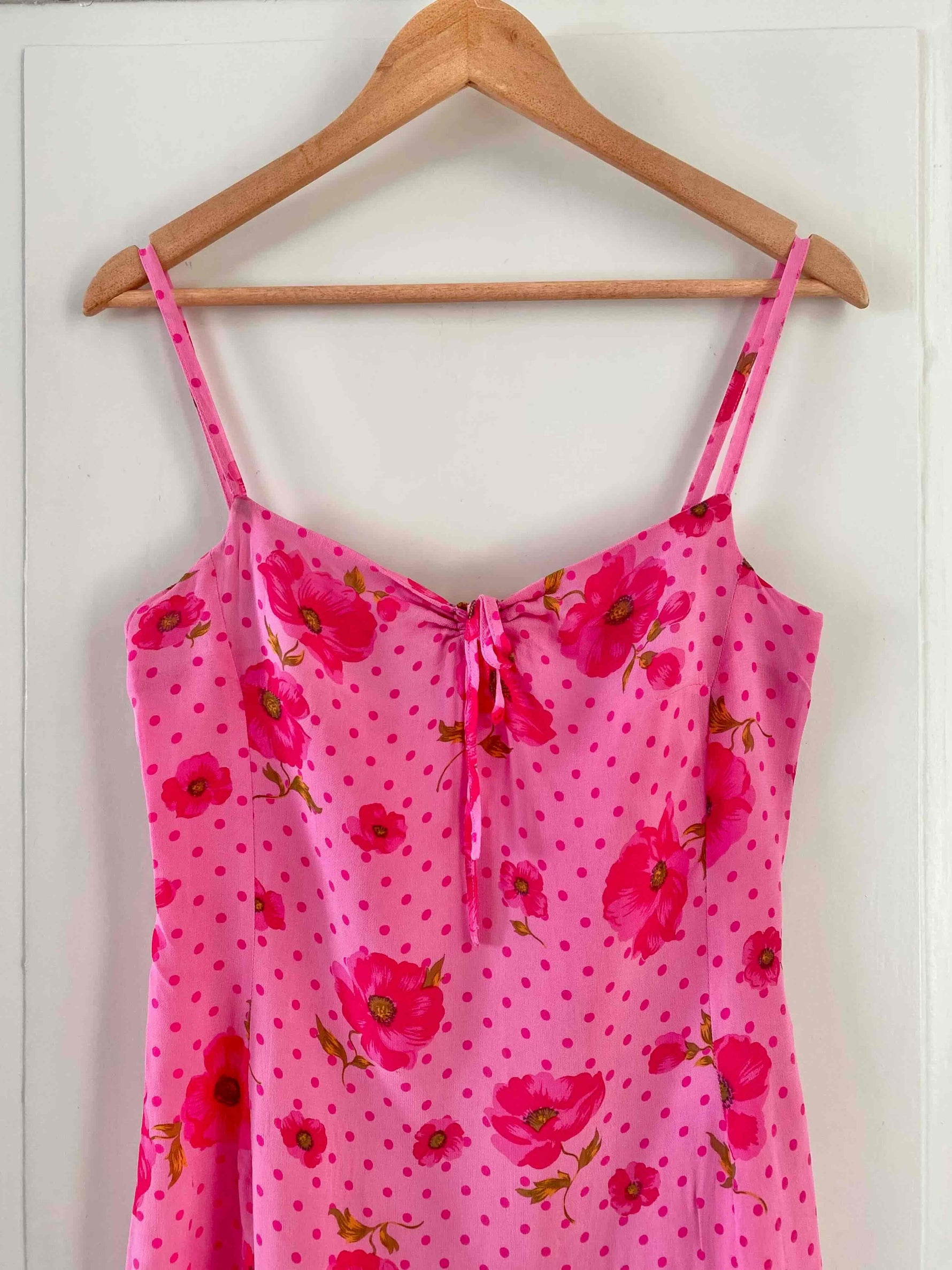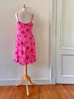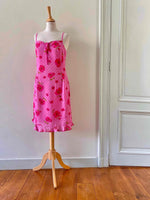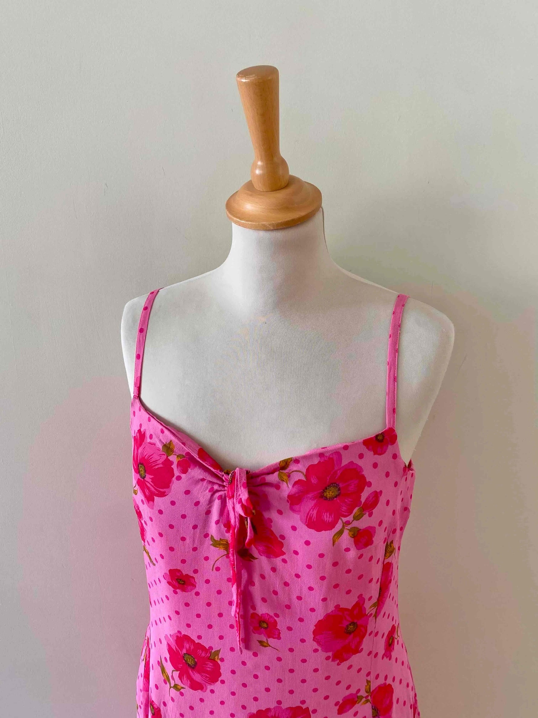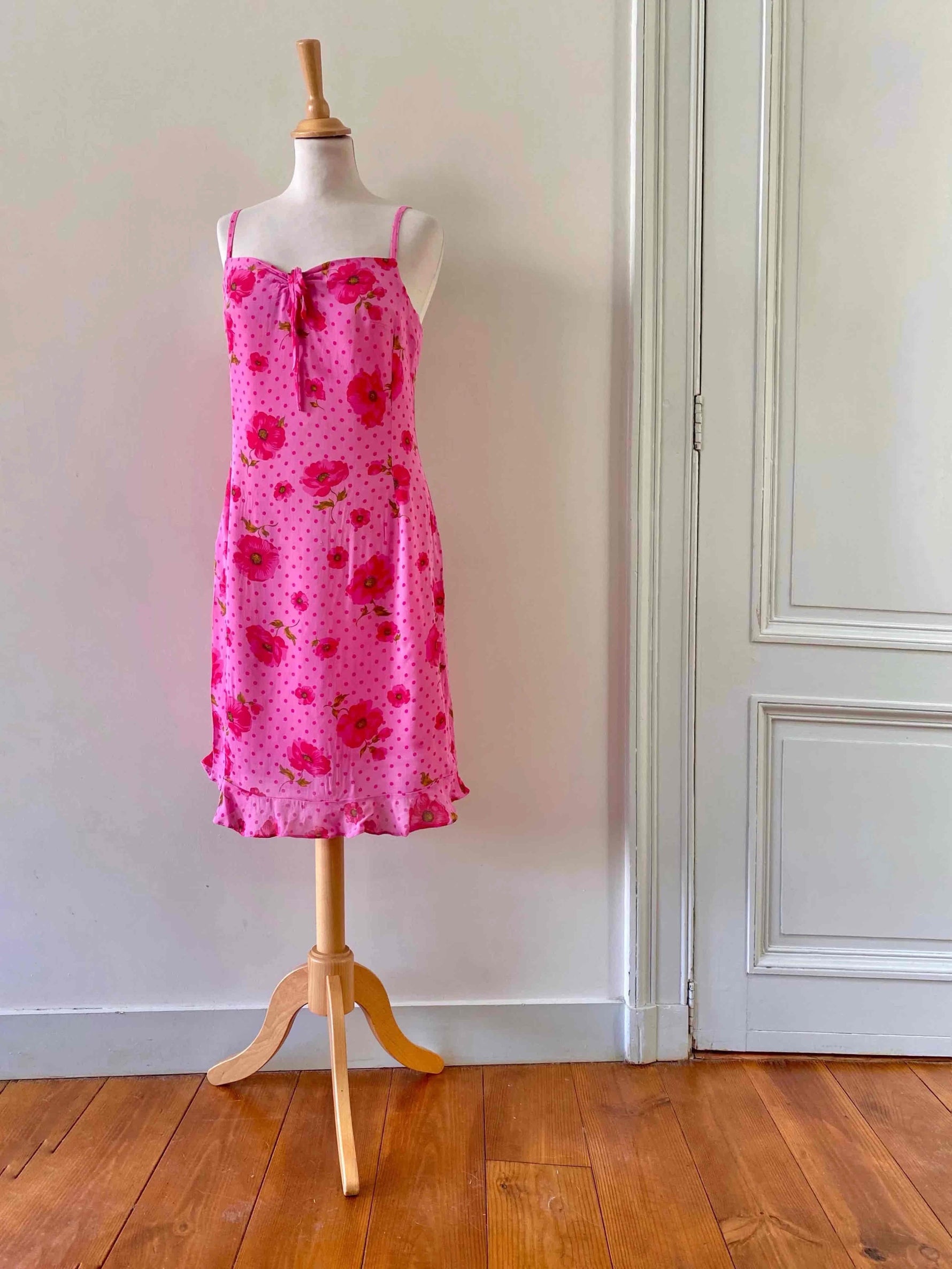 Prix unitaire parRobe à pois et fleurs, en voile viscose doublée rose baby et imprimée de pois et fleurs de coquelicots roses fuschias et vertes, bretelles spaghettis, poitrine froncée à nouer, petit volant dans le bas, taille 36 portée ici sur un mannequin T36, aisselles 43cm.
