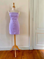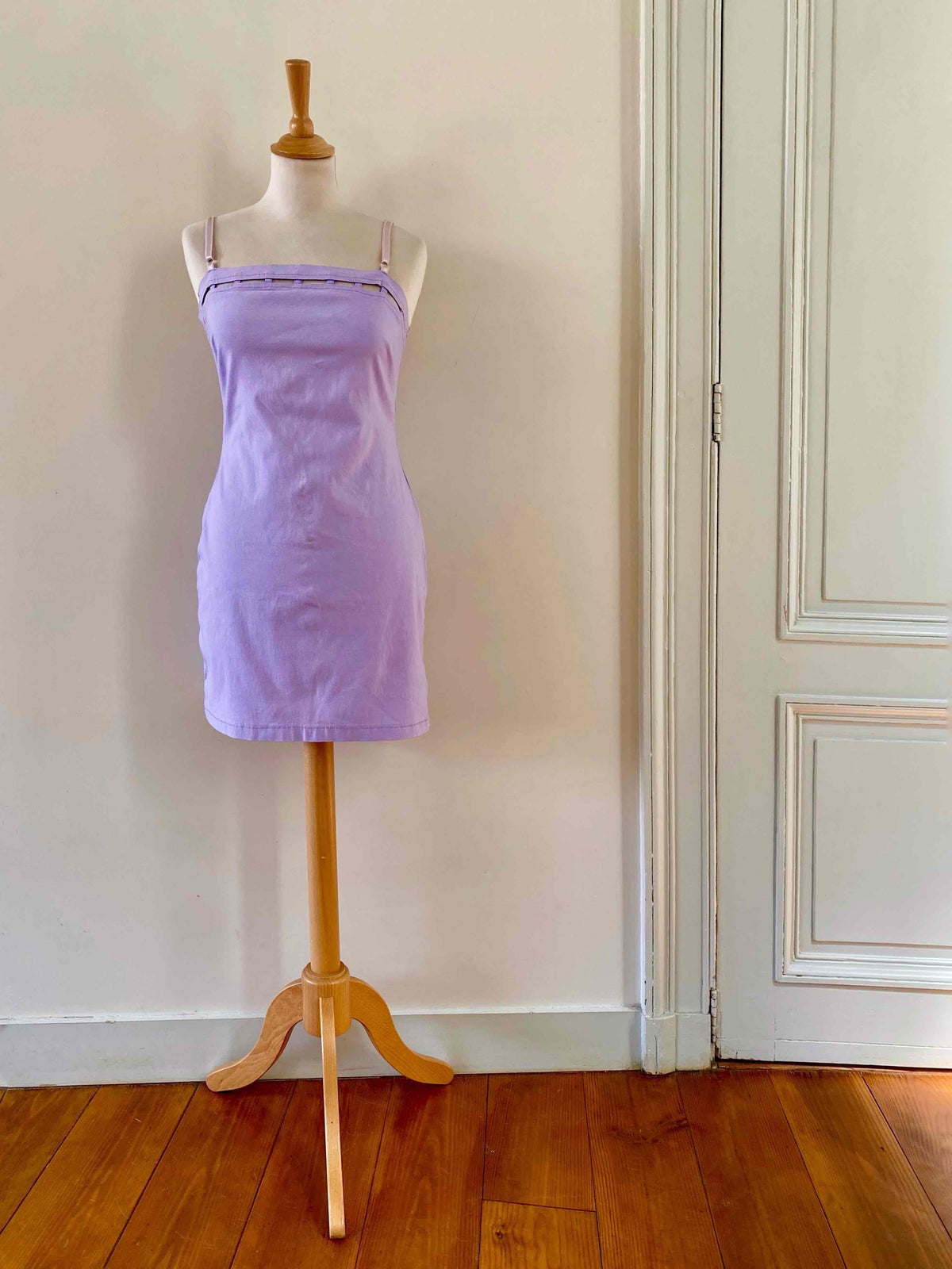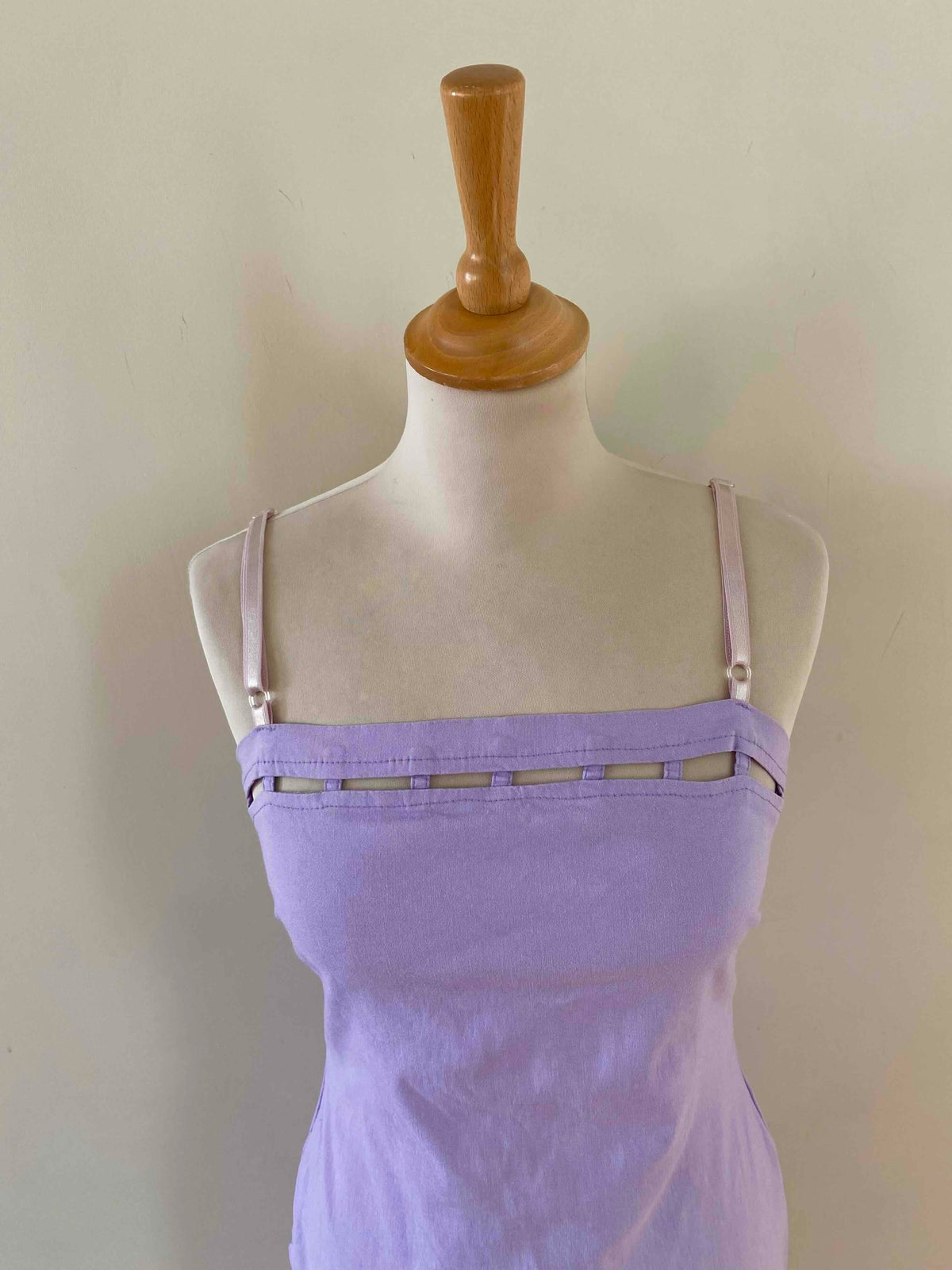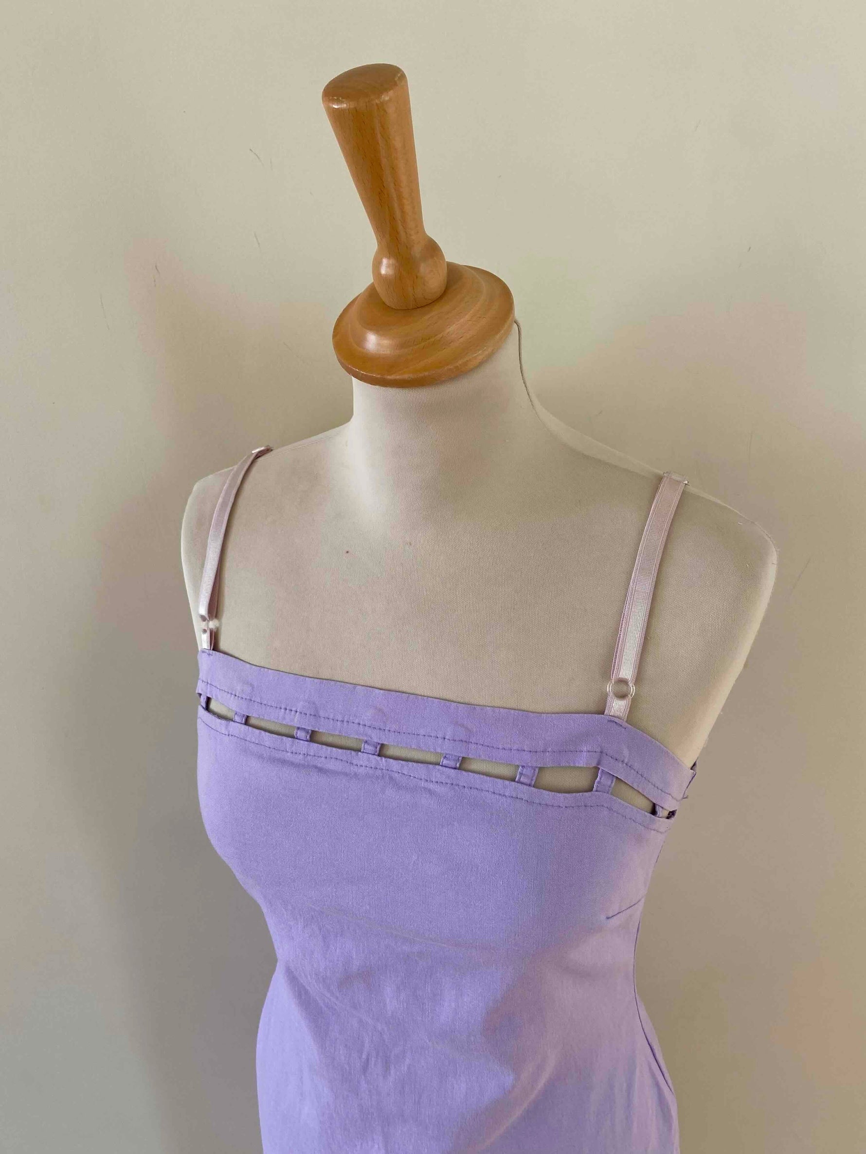 Prix unitaire parRobe ajourée, en viscose élasthanne matière gainante lilas, encolure corsage bustier ajourée, bretelles élastique satinées réglables, fabriquée en France, taille 36 portée ici sur un mannequin T36, aisselles 42cm.