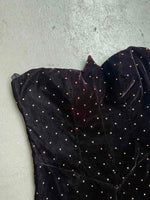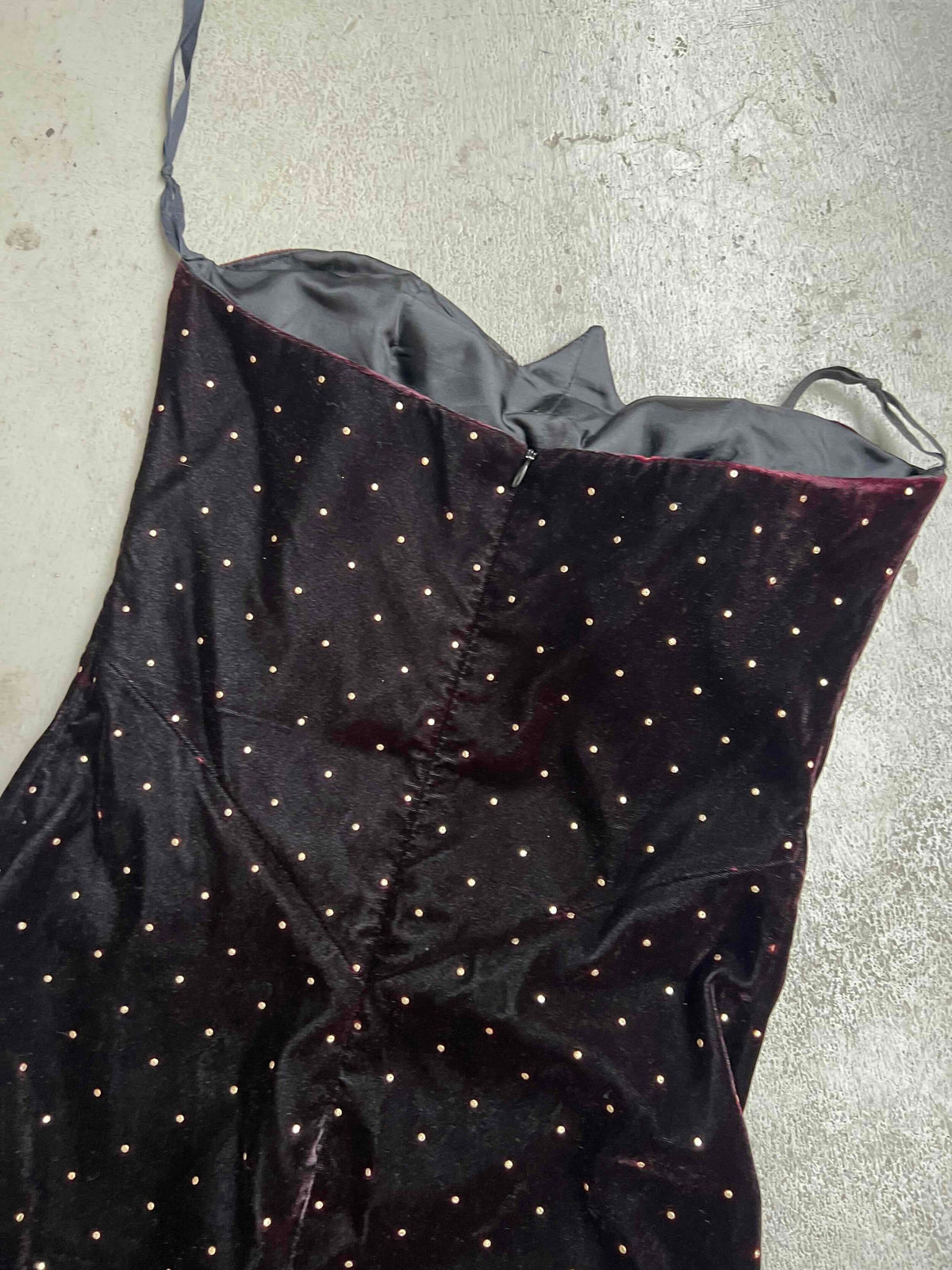 Prix unitaire parRobe bustier courte de soirée en velours bordeaux très foncé, quasi noir. Petits clous dorés. Made in France.