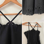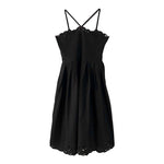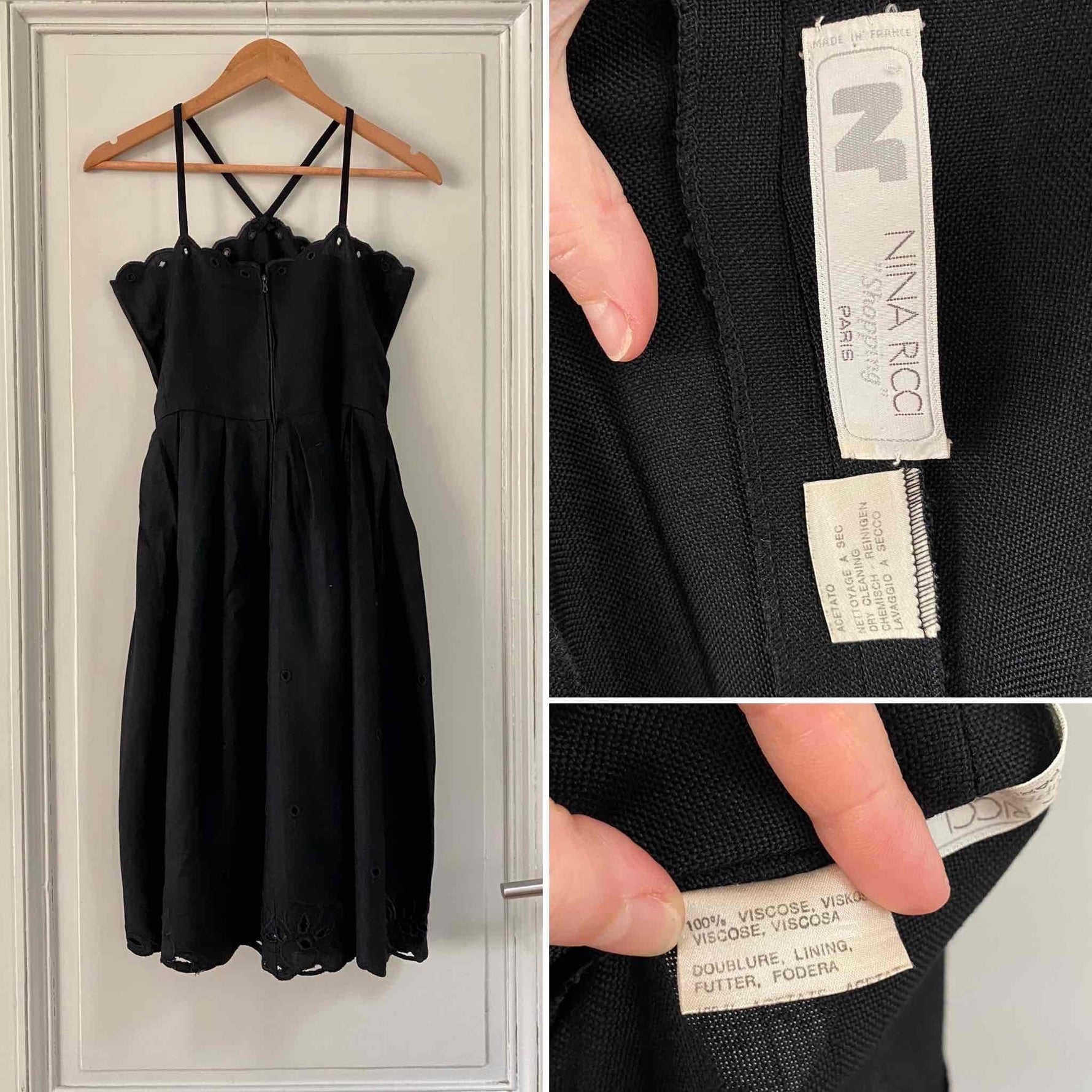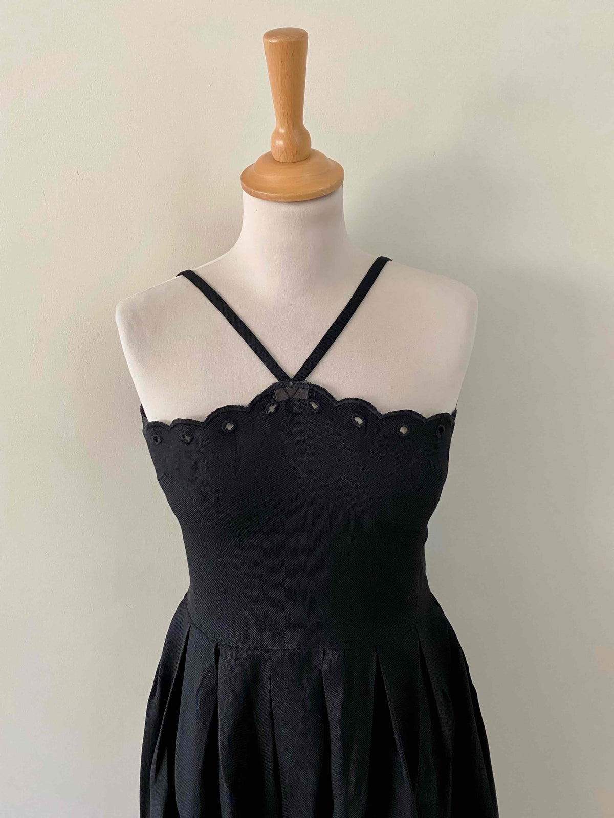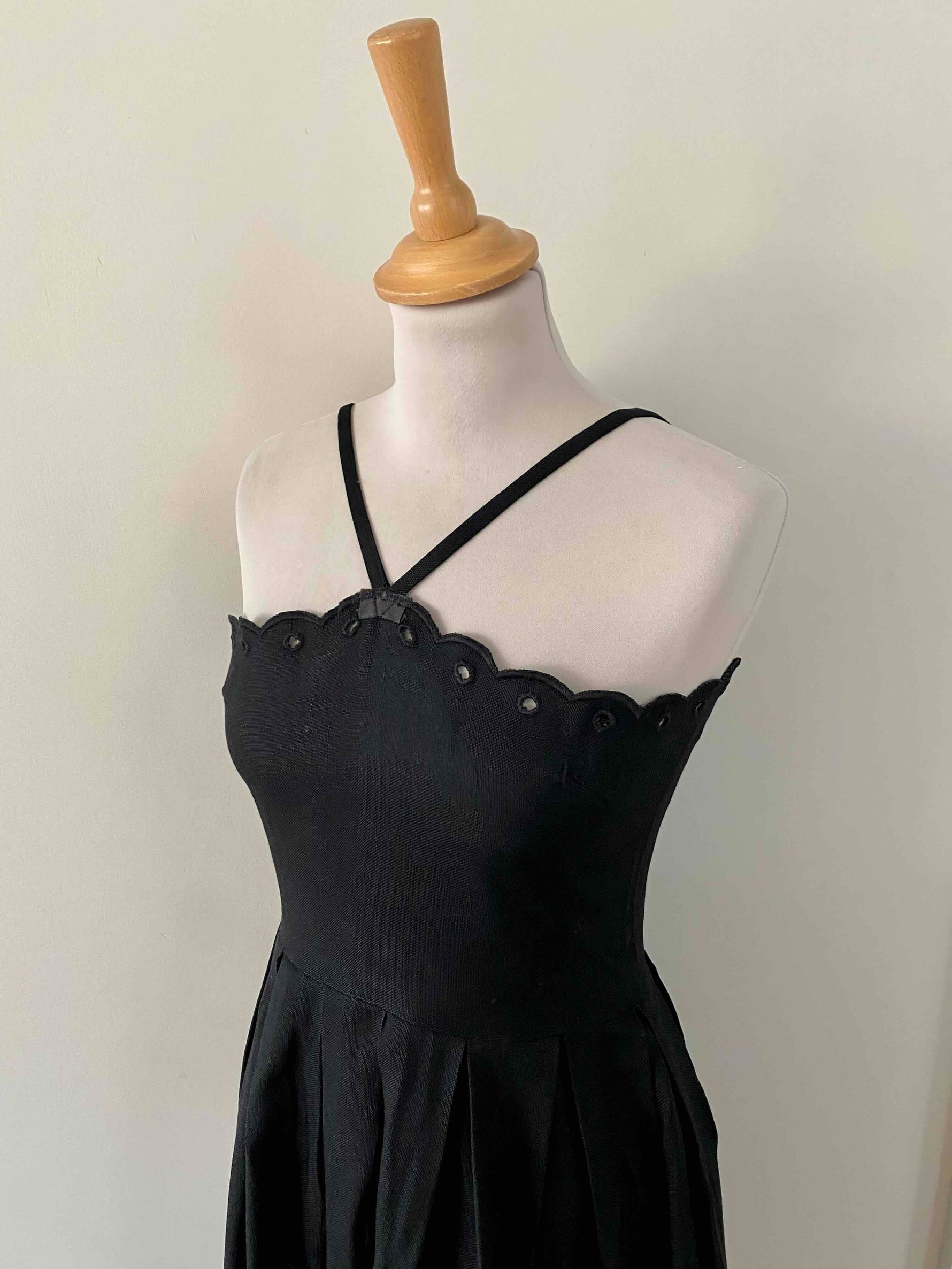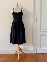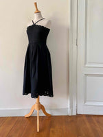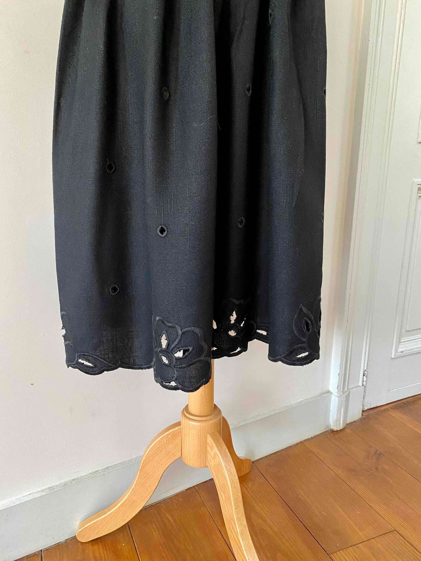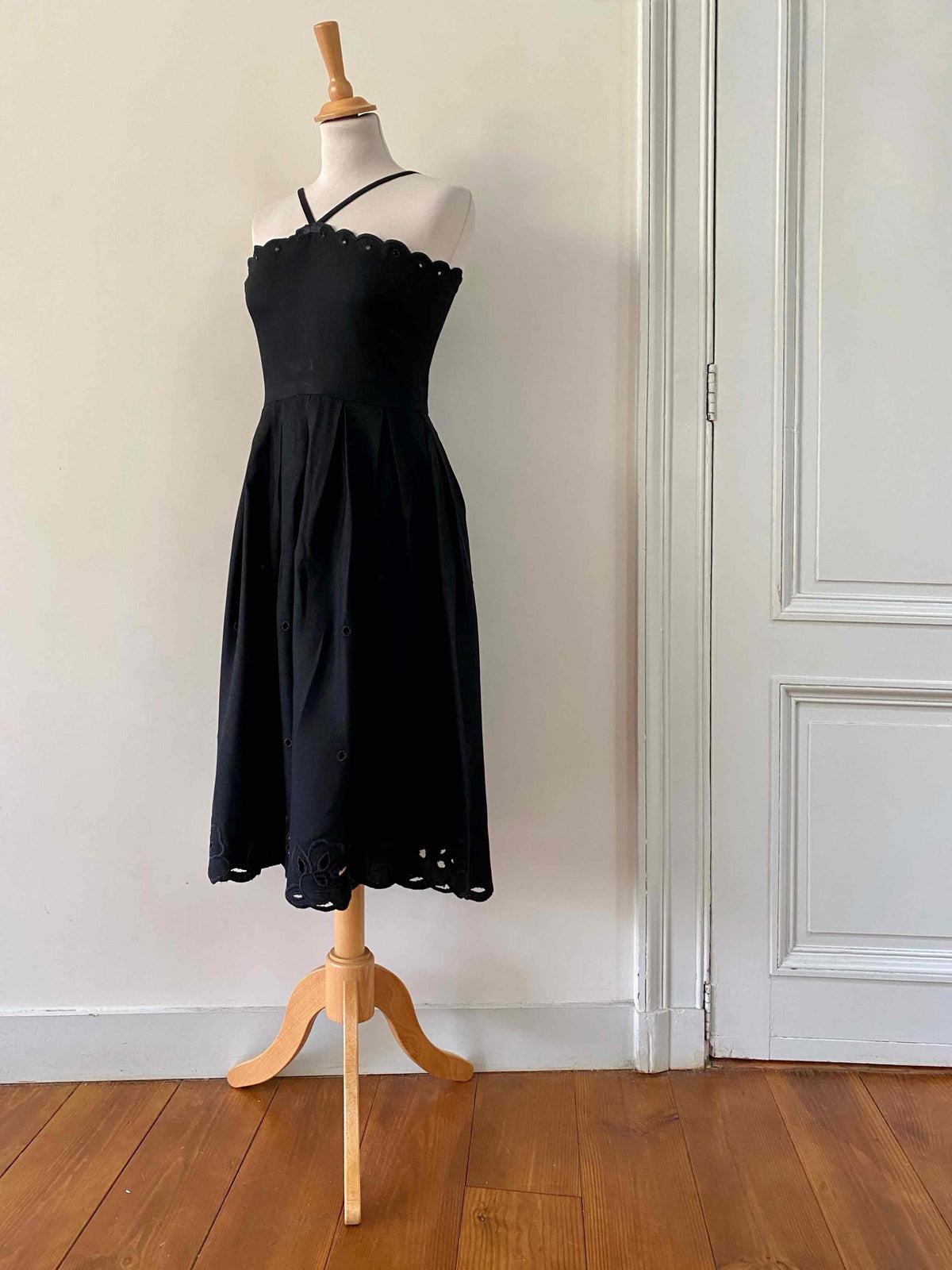 Robe bustier Nina Ricci, en viscose trame lin noire, brodée de grandes fleurs et pois en broderies anglaises ajourées, haut bustier avec bretelles dos nu, bordures festonnée, bas plissée jupon, fabriquée en France, taille 36 portée ici sur un mannequin T36.