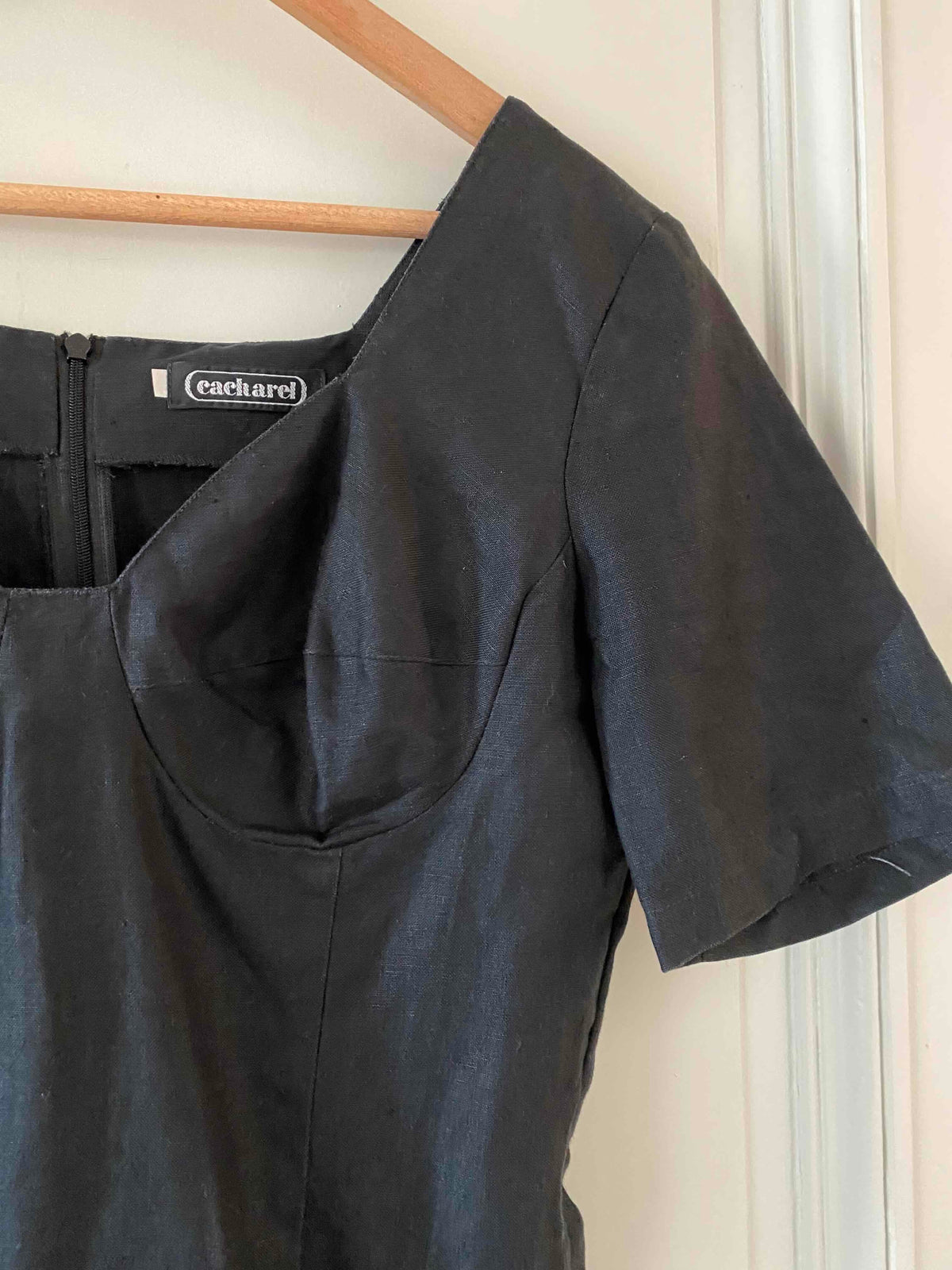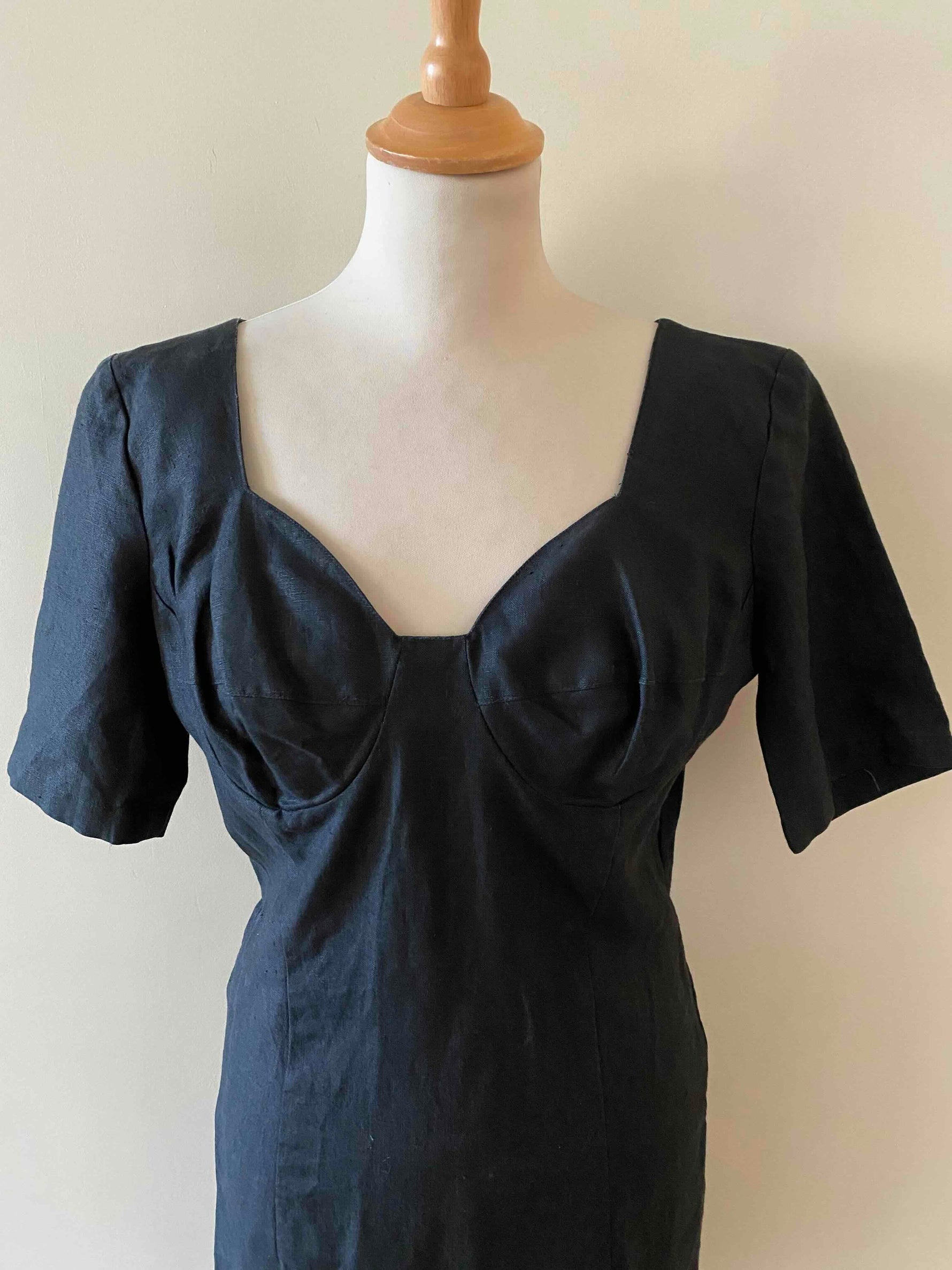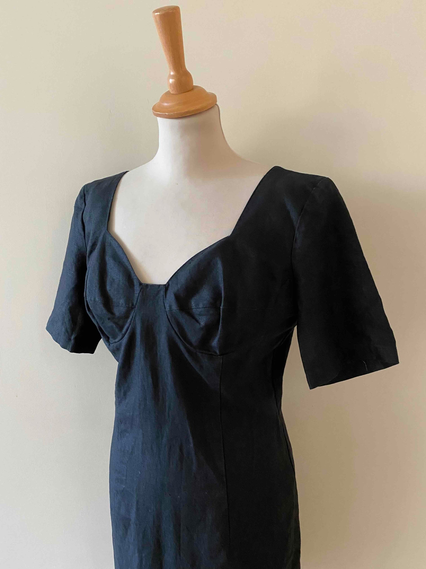 Prix unitaire parRobe Cacharel en 100% lin noire, encolure corsage et poitrine armaturée, manches courtes, fabriquée en France, taille 36 portée ici sur un mannequin T36.