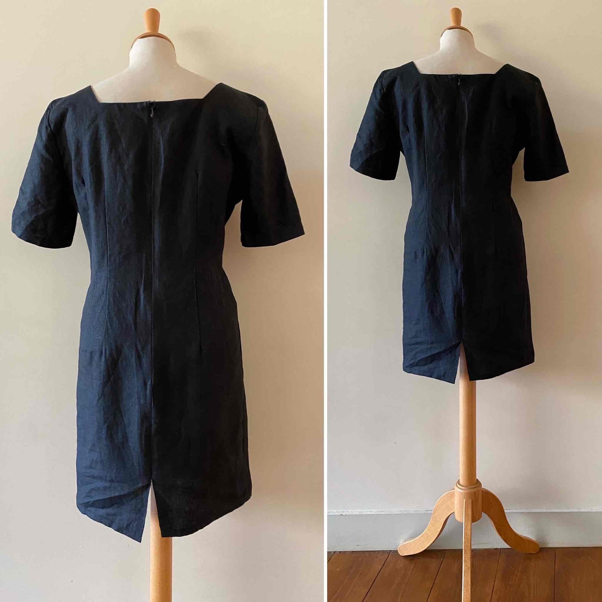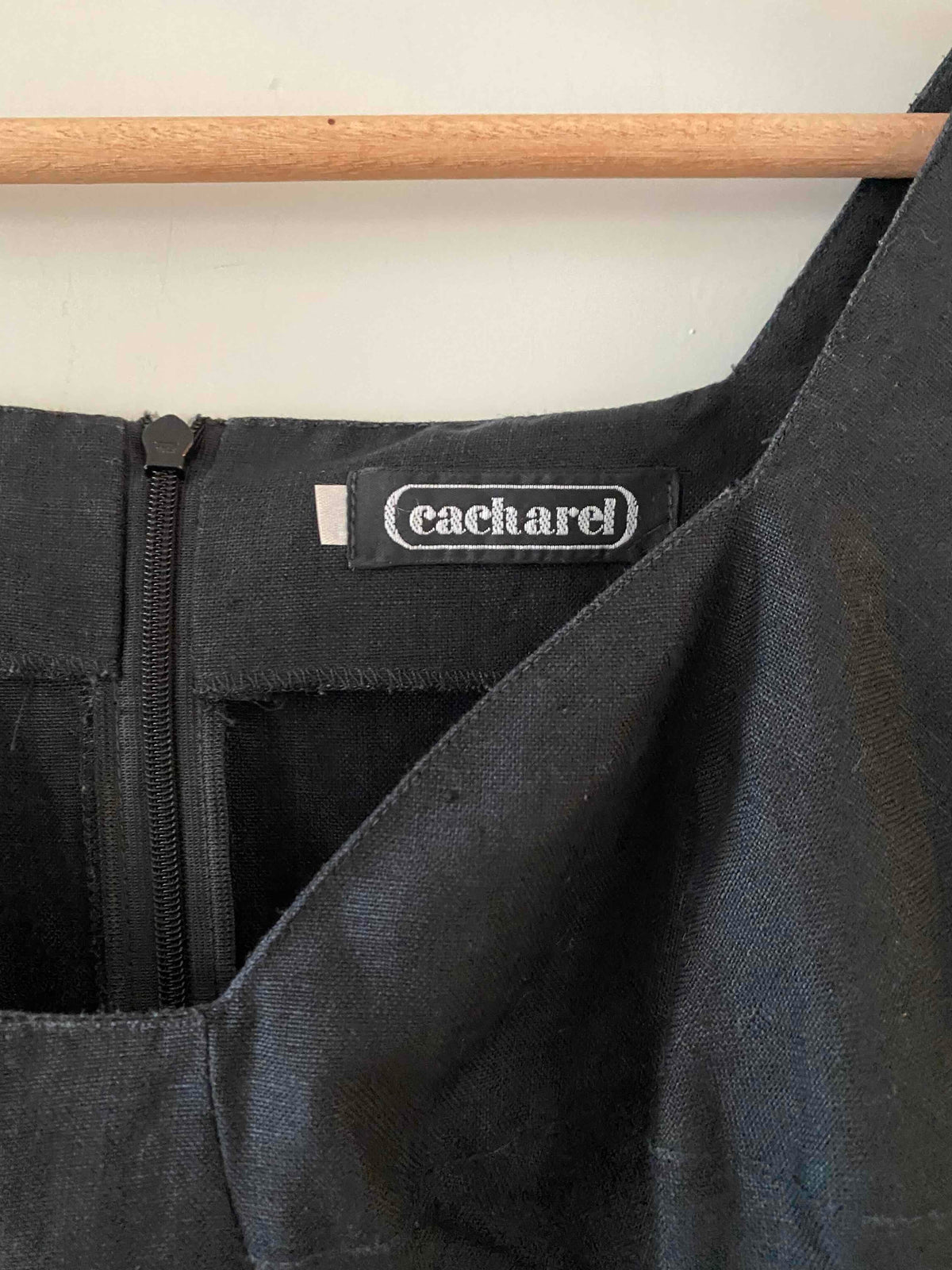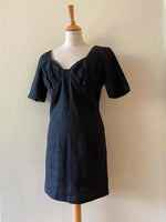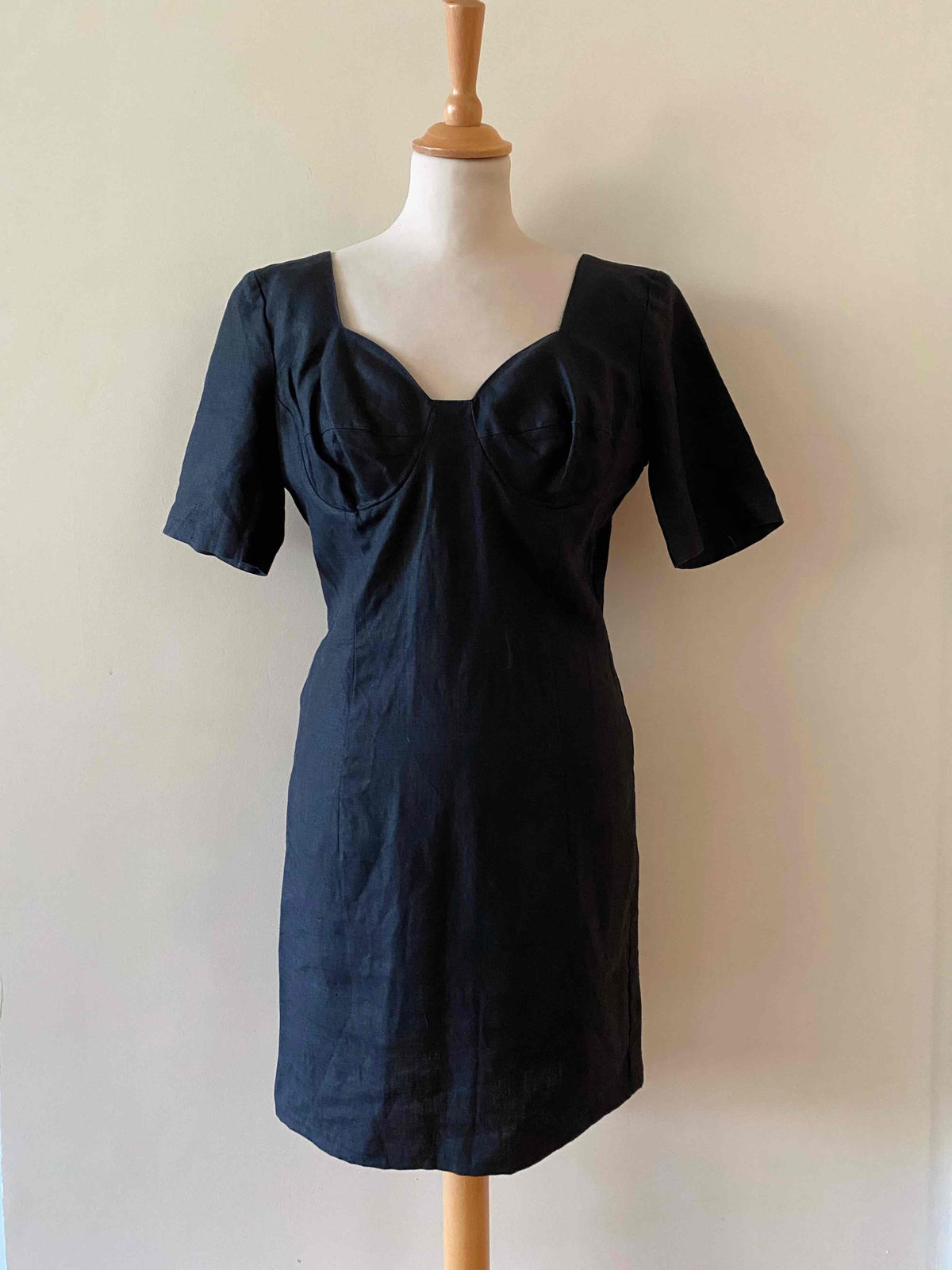 Prix unitaire parRobe Cacharel en 100% lin noire, encolure corsage et poitrine armaturée, manches courtes, fabriquée en France, taille 36 portée ici sur un mannequin T36.