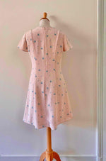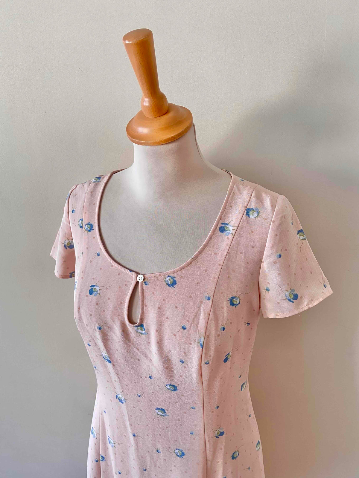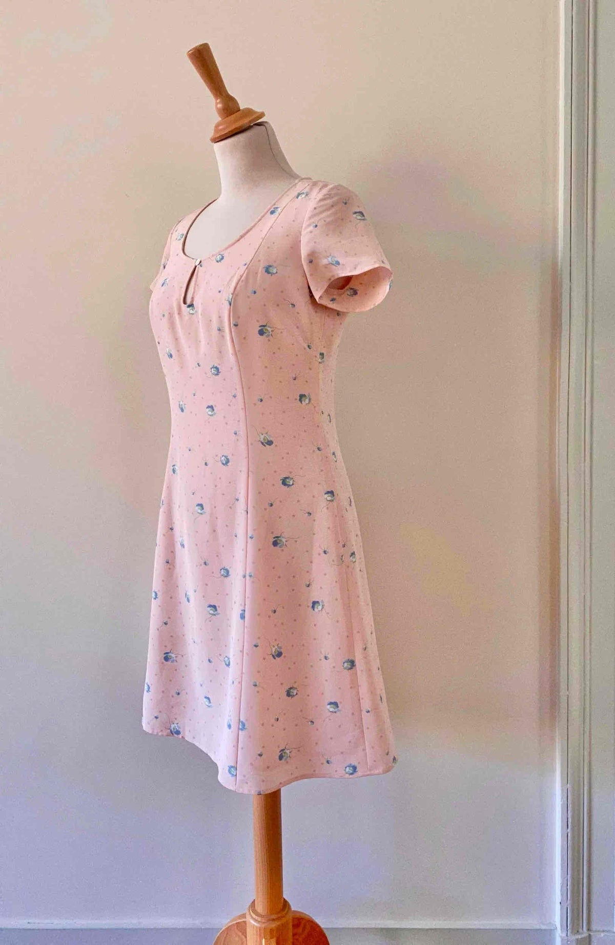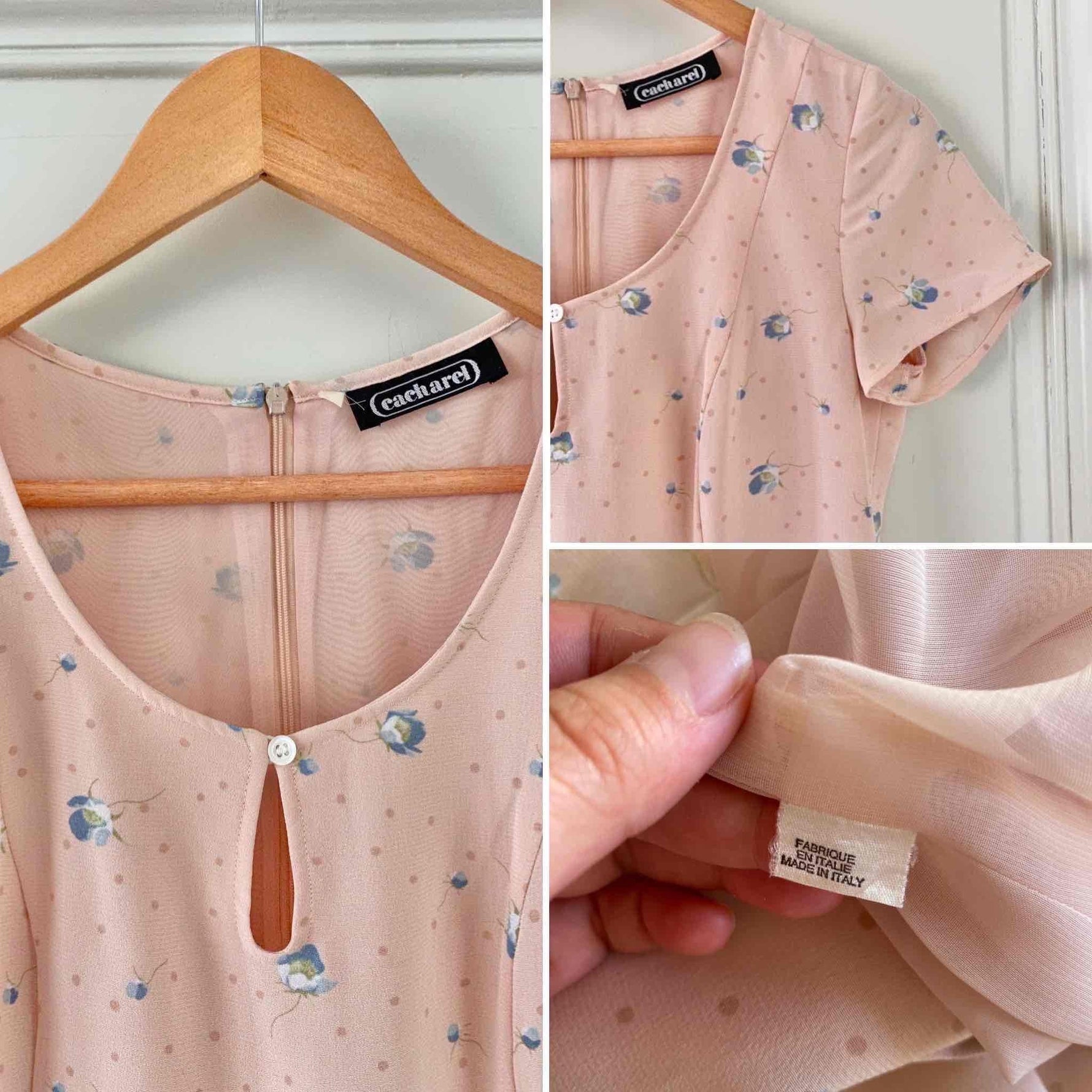 Mini robe à fleurs Cacharel, en viscose rose pastel imprimée pois et fleurs bleues pervenche, encolure ronde à goutte boutonnée, forme fit and flare, manches courtes, Fabriquée en Italie, taille 36 portée ici sur un mannequin T36, aisselles 43cm.