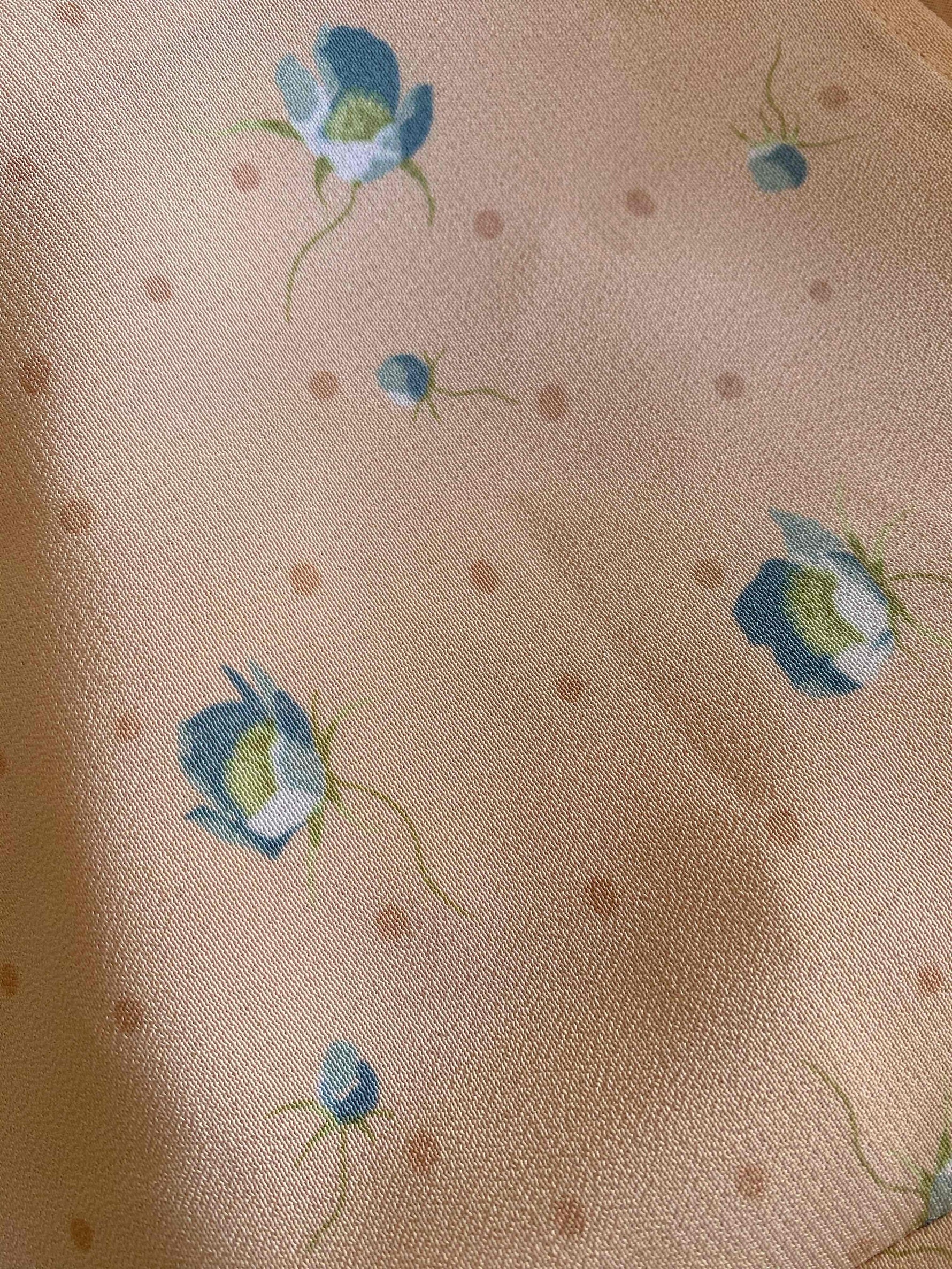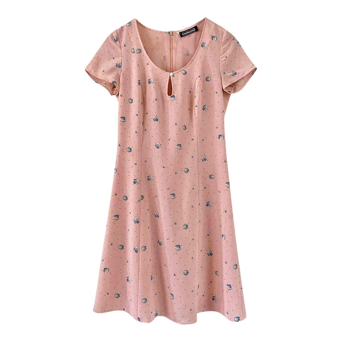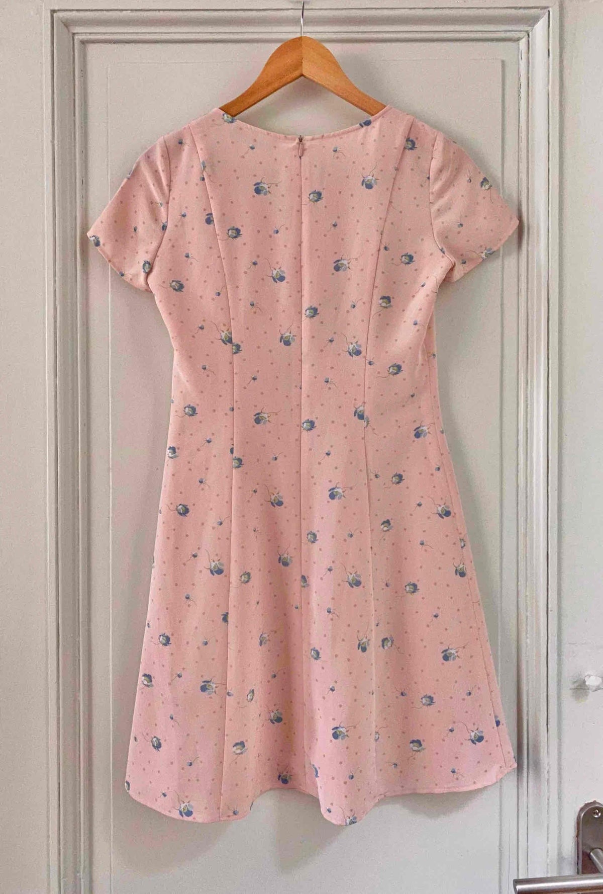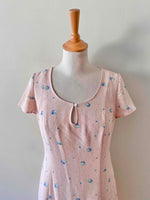 Mini robe à fleurs Cacharel, en viscose rose pastel imprimée pois et fleurs bleues pervenche, encolure ronde à goutte boutonnée, forme fit and flare, manches courtes, Fabriquée en Italie, taille 36 portée ici sur un mannequin T36, aisselles 43cm.