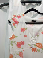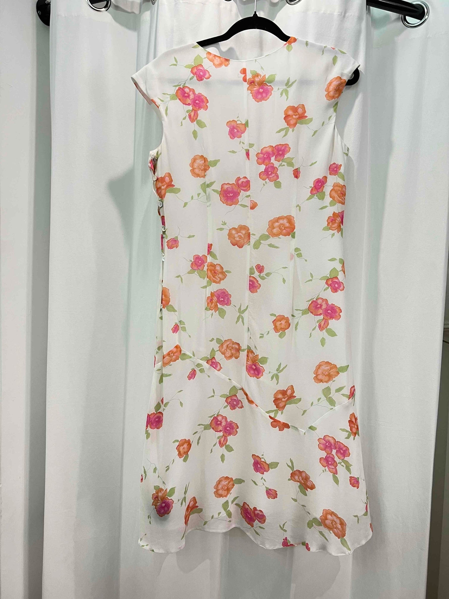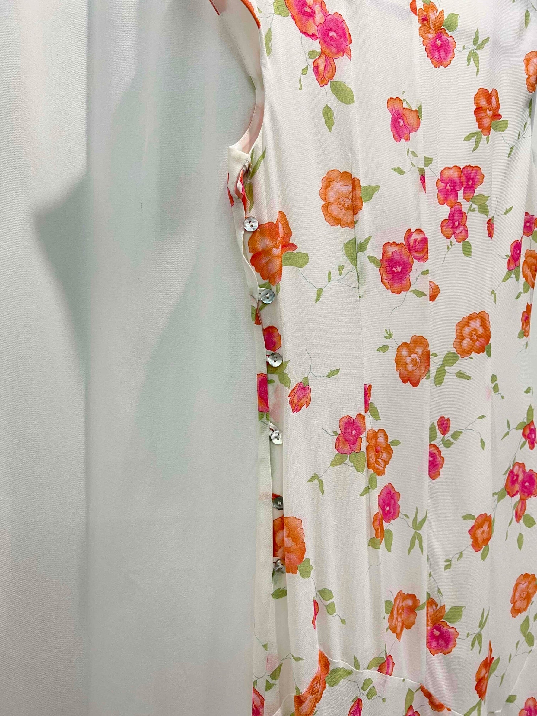 Prix unitaire parRobe longue de la marque Cacharel, blanche avec des fleurs roses et oranges. Manches courtes et col V. Boutons nacrés sur le côté. Viscose, fabriquée en Italie.